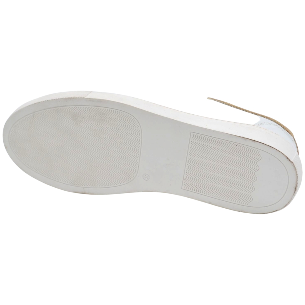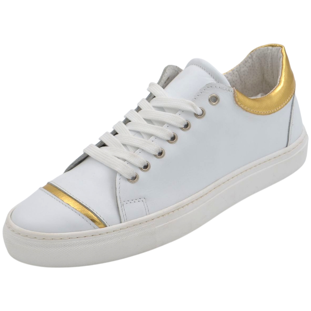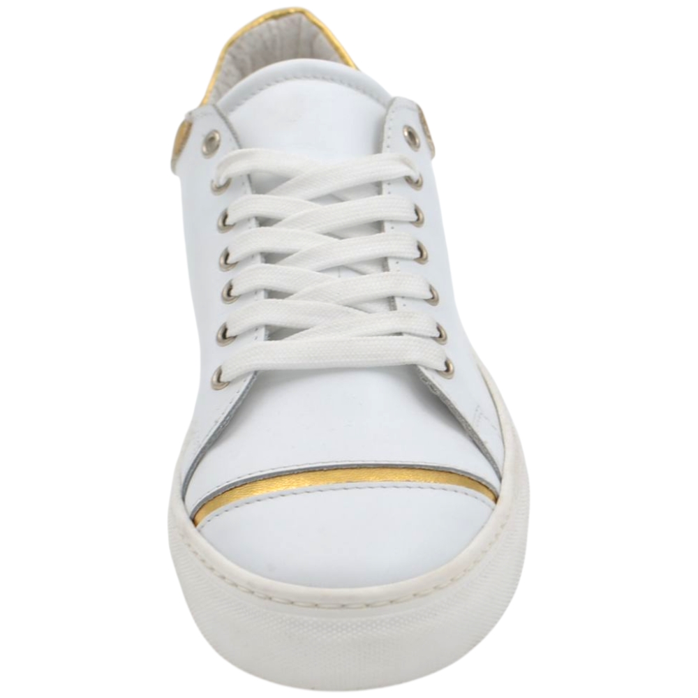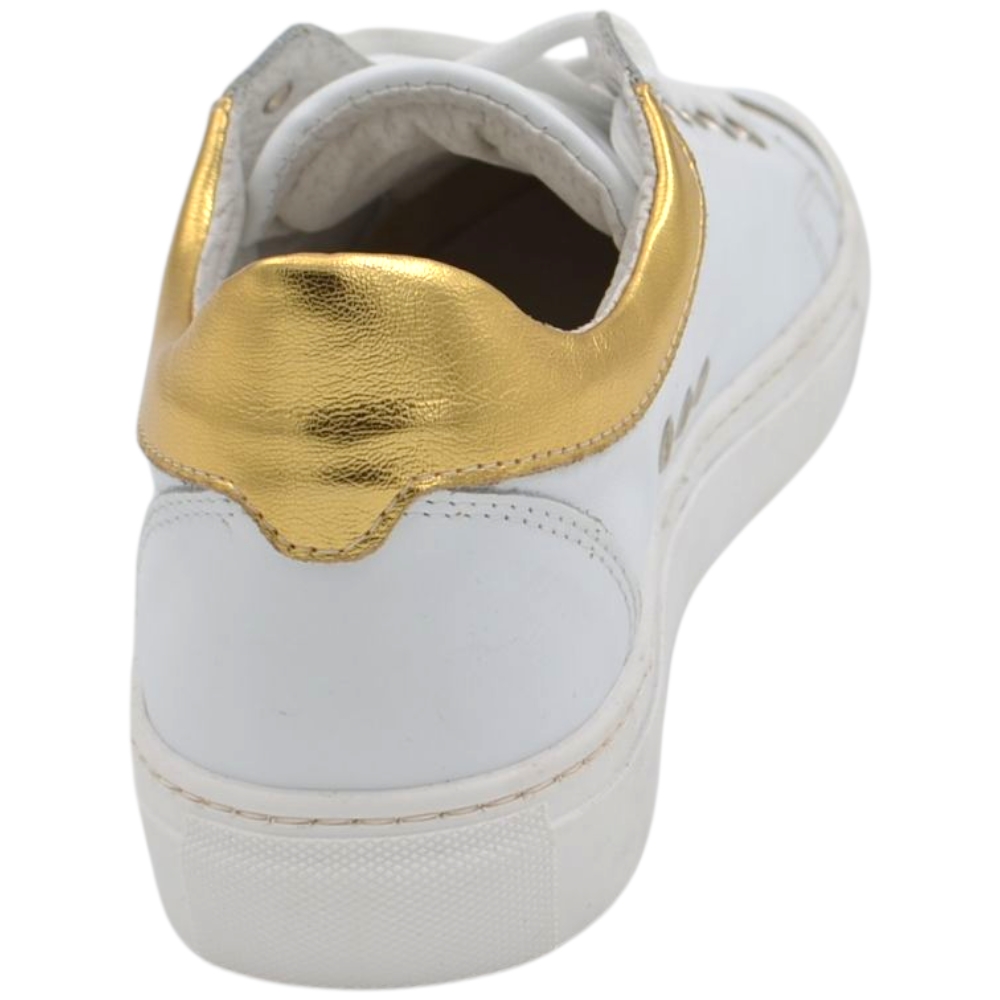 Sneakers uomo bassa in vera pelle vitello liscia bianca inserti oro con fondo in gomma eva lacci casual made in Italy