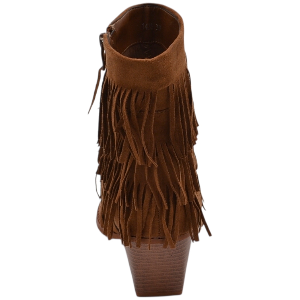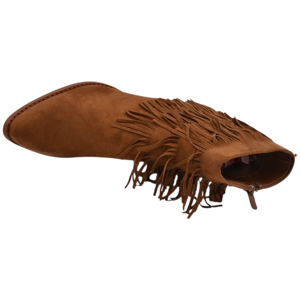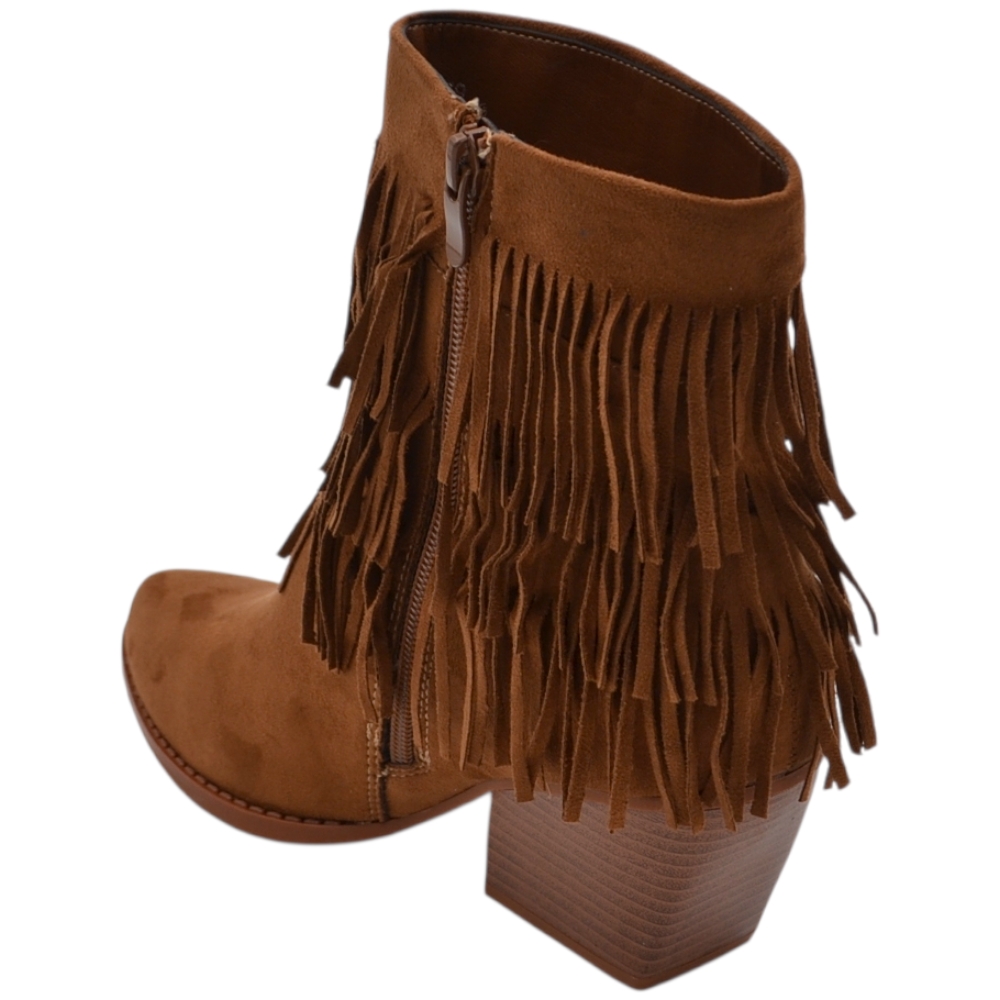 Tronchetto camperos donna in camoscio cuoio con frange punta tacco western 5 cm moda zip linea basic