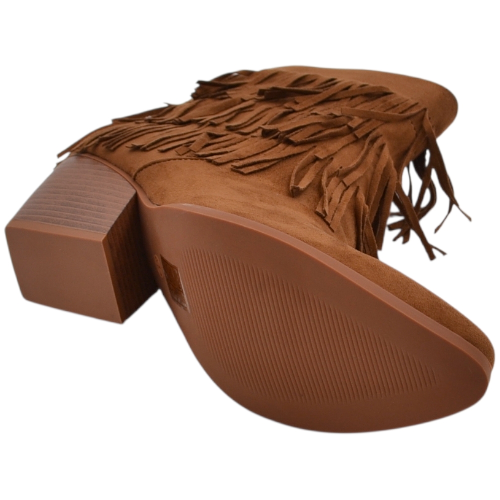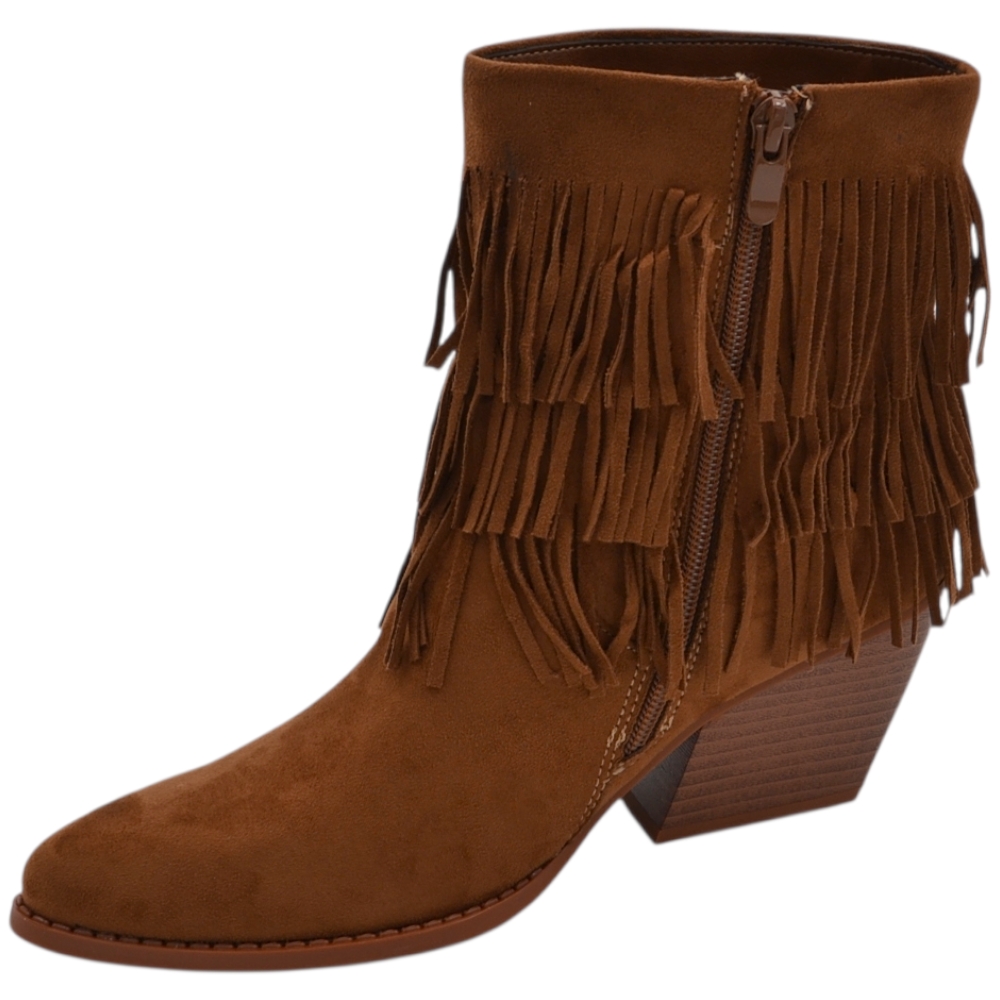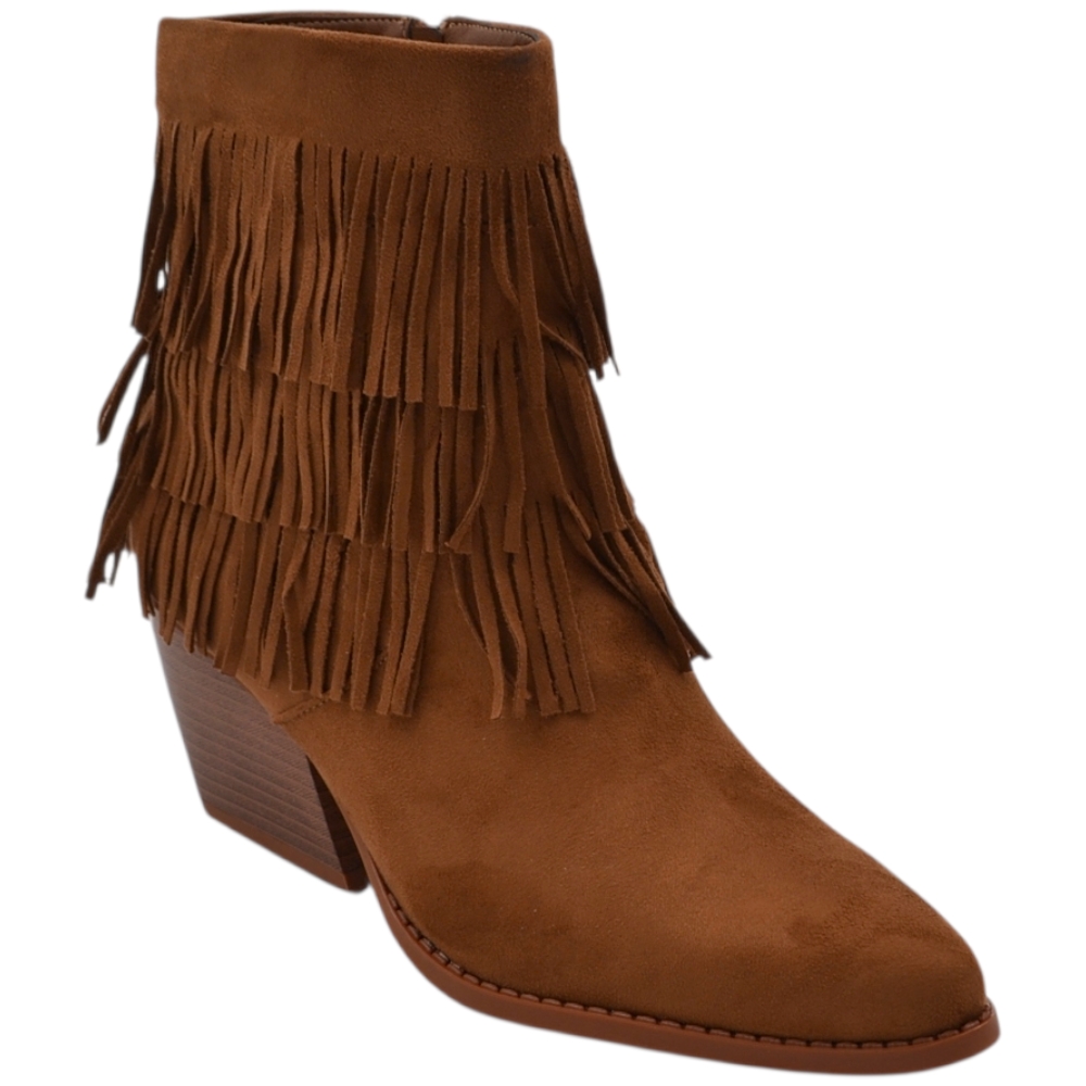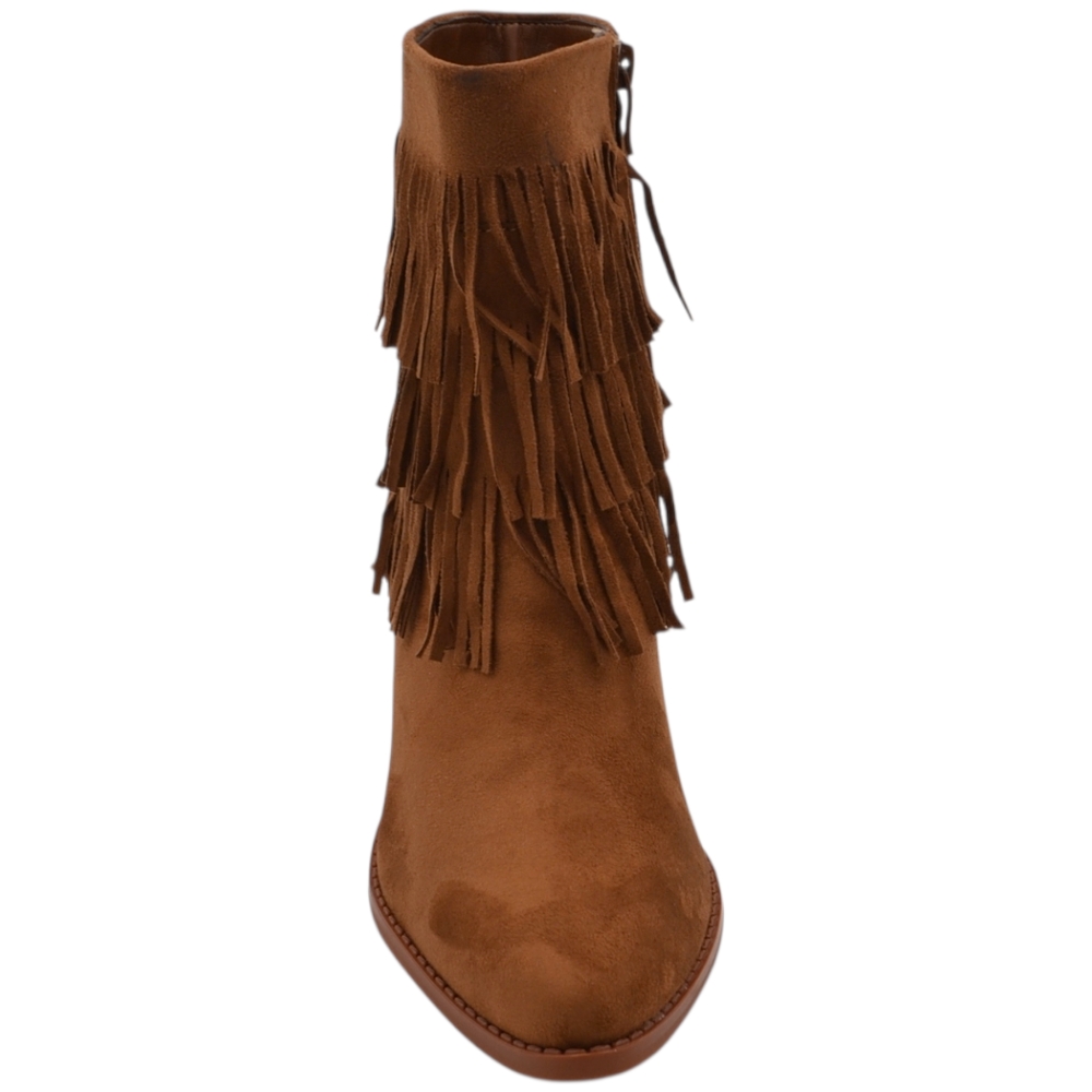 Tronchetto camperos donna in camoscio cuoio con frange punta tacco western 5 cm moda zip linea basic