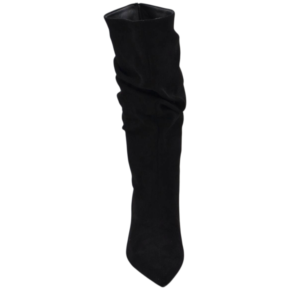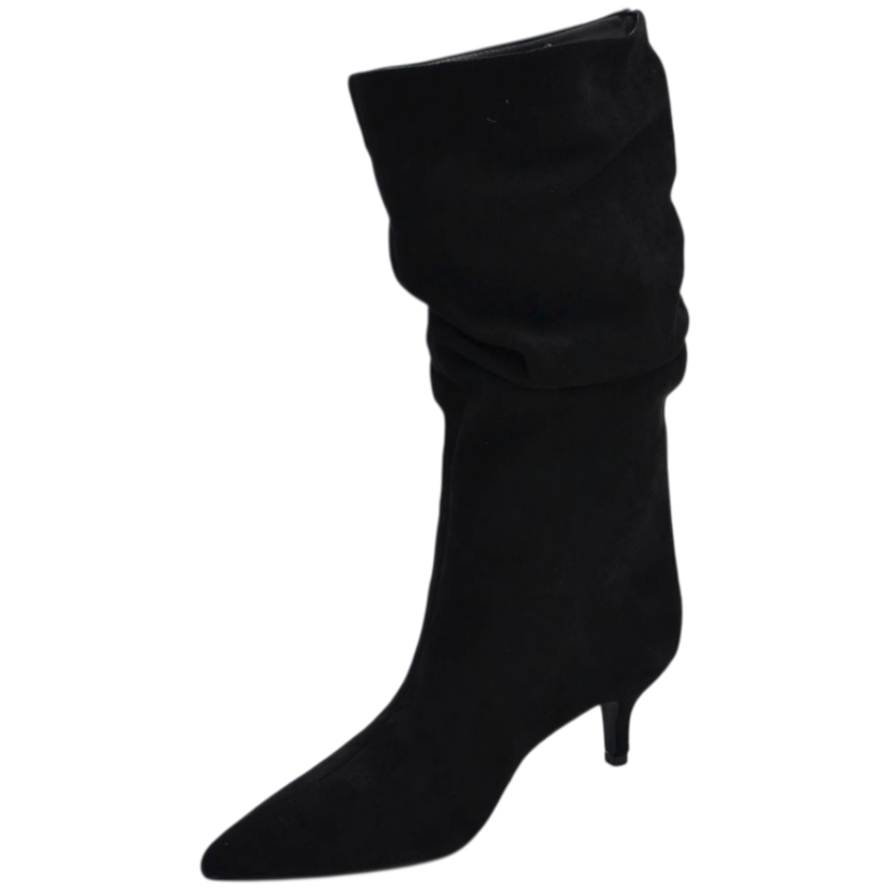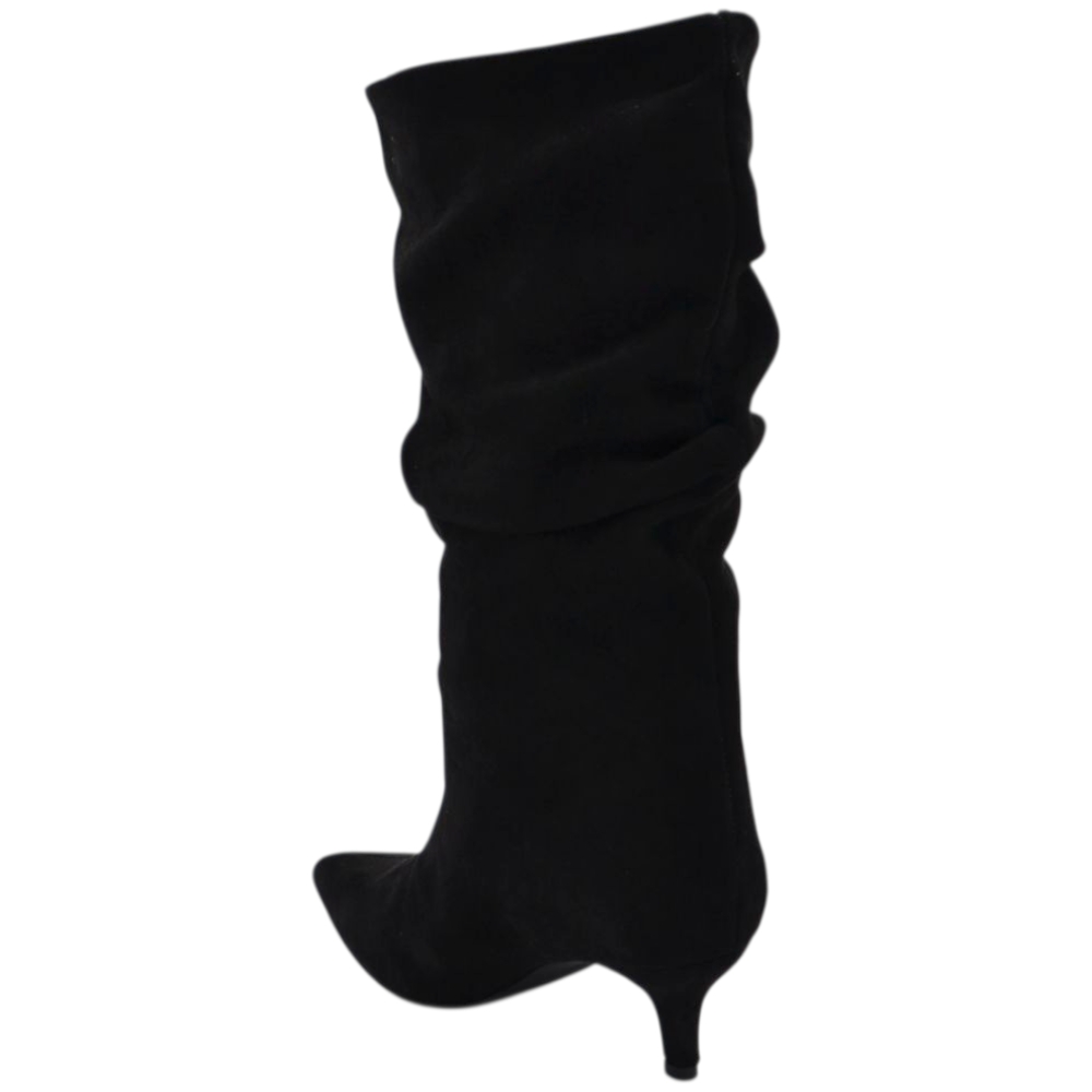 Stivali slouchy alto arricciato camoscio nero a punta con tacco basso kitten 5 cm gambale over .