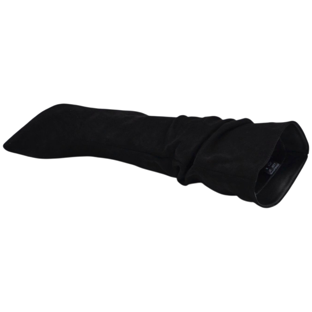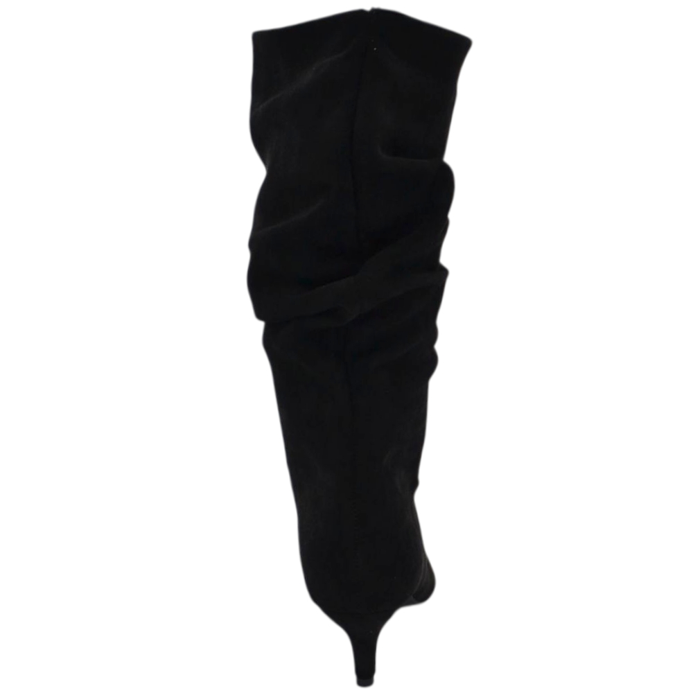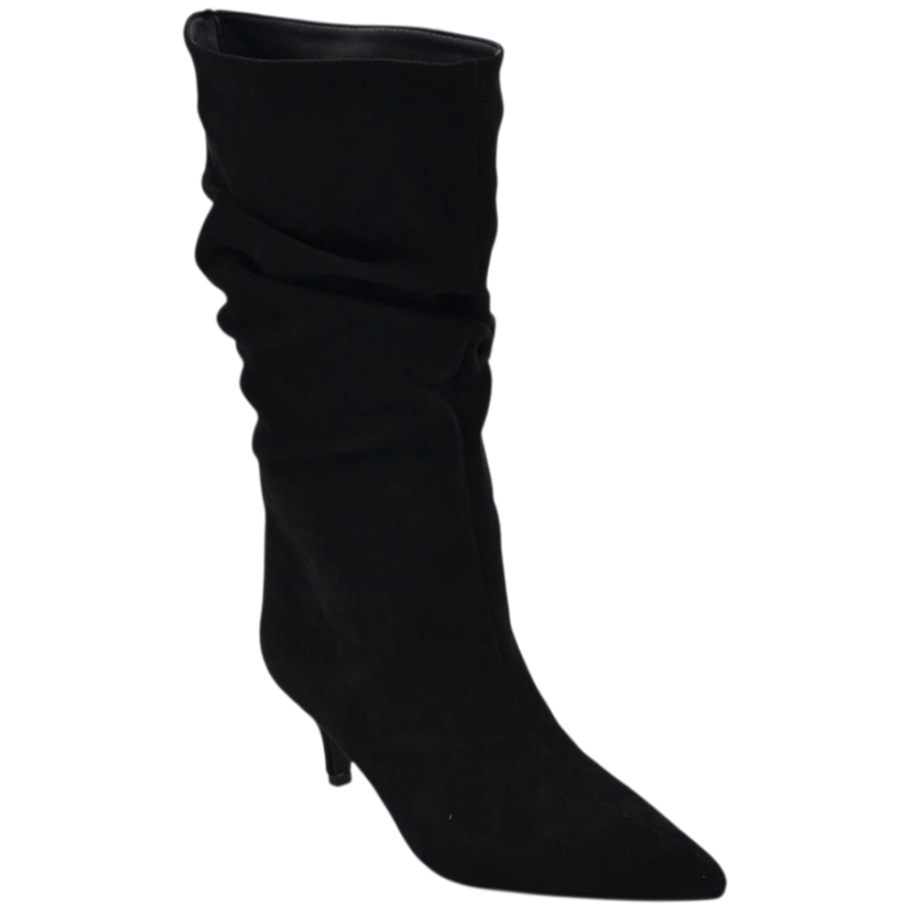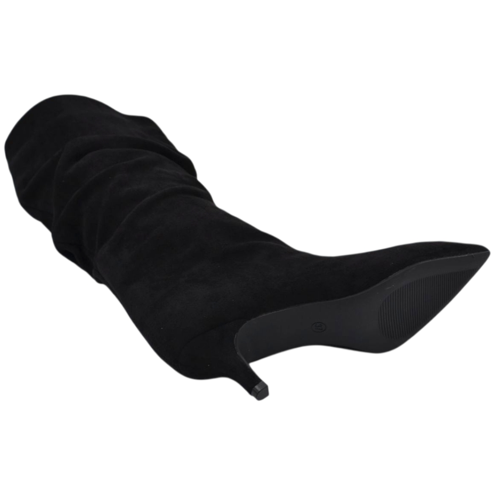 Stivali slouchy alto arricciato camoscio nero a punta con tacco basso kitten 5 cm gambale over .