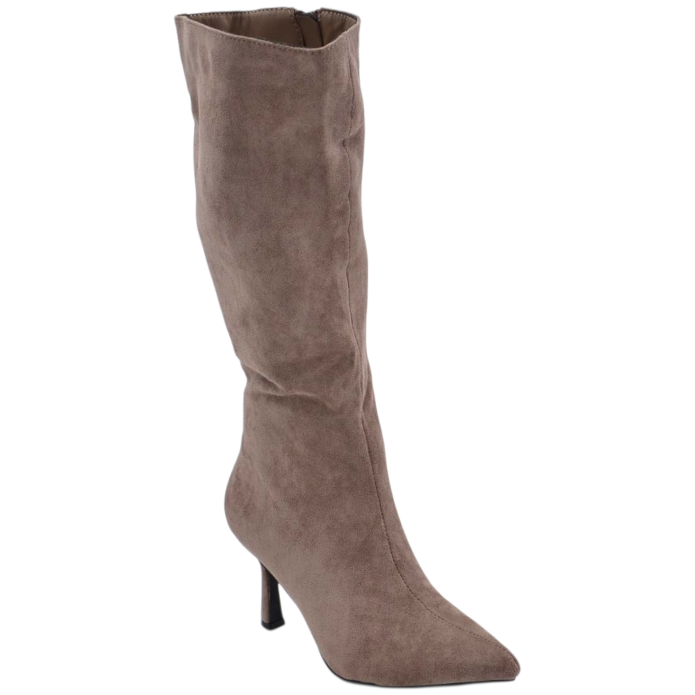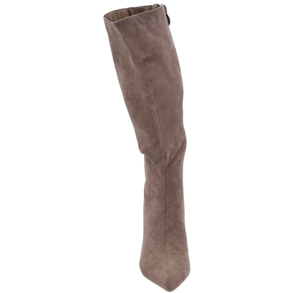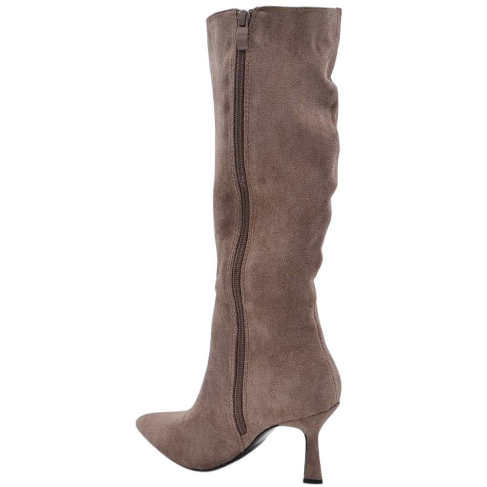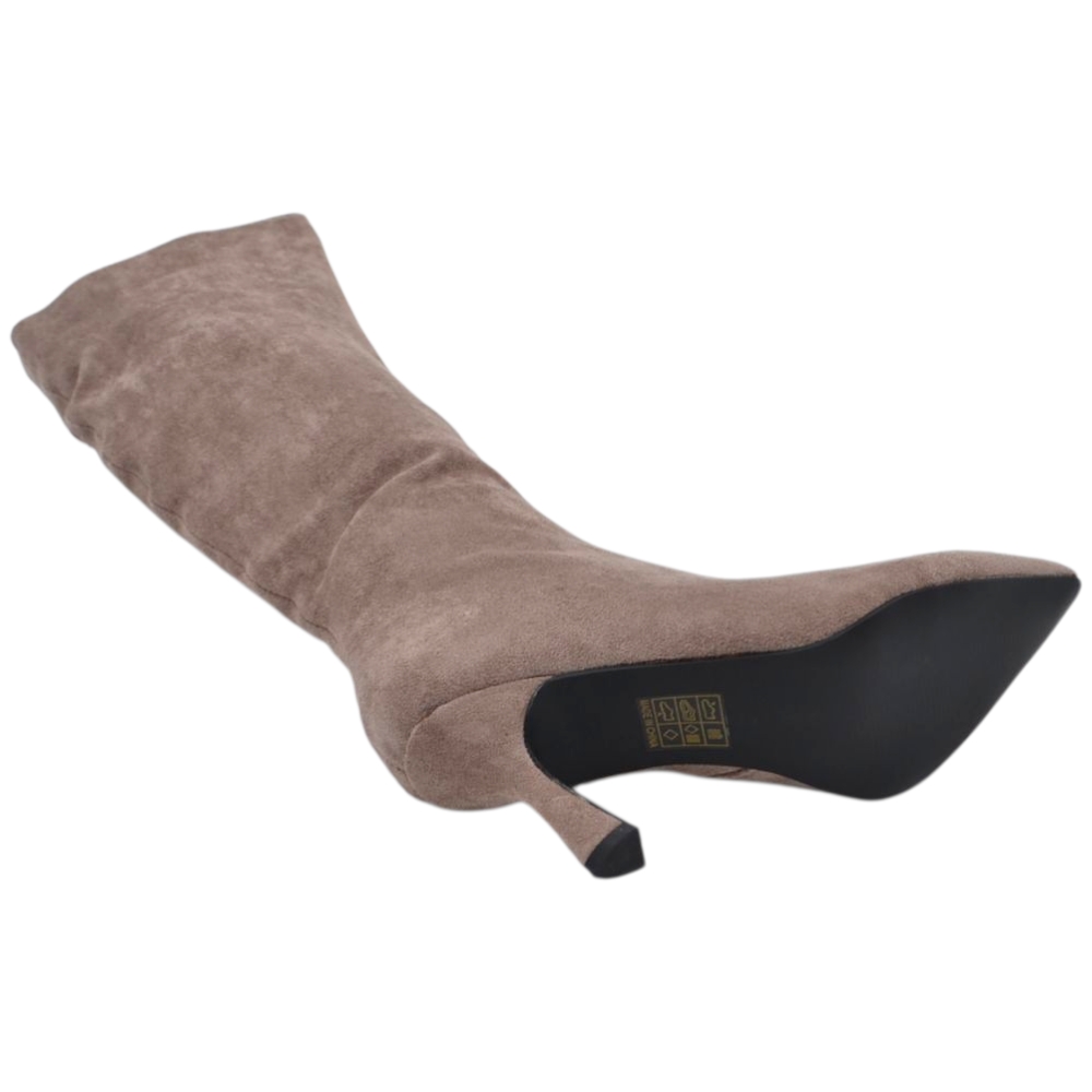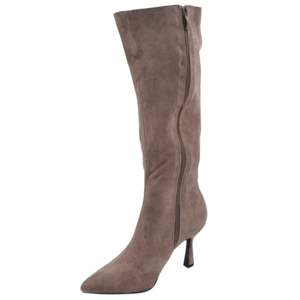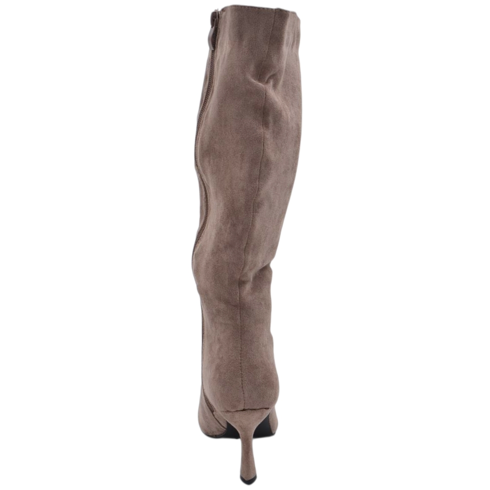 Stivali alti donna al ginocchio in camoscio beige a punta tacco a clessidra 8 cm zip lunga aderente moda linea Basic