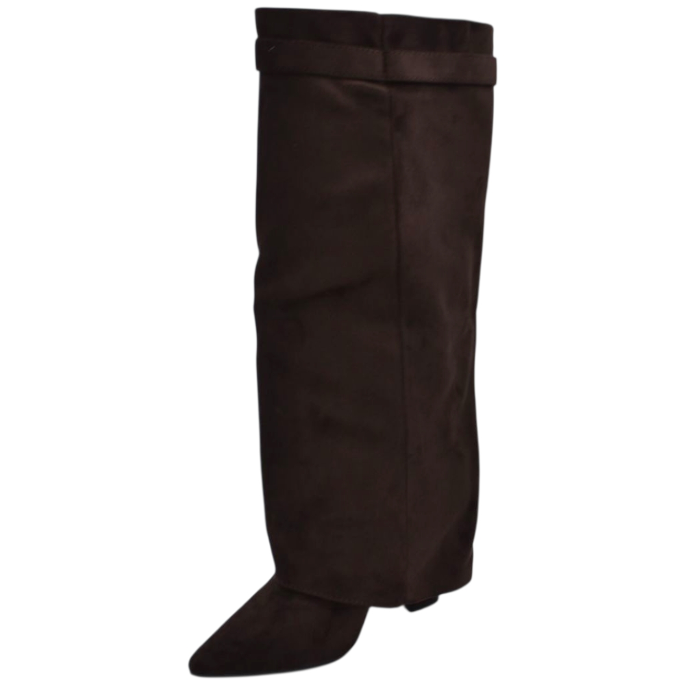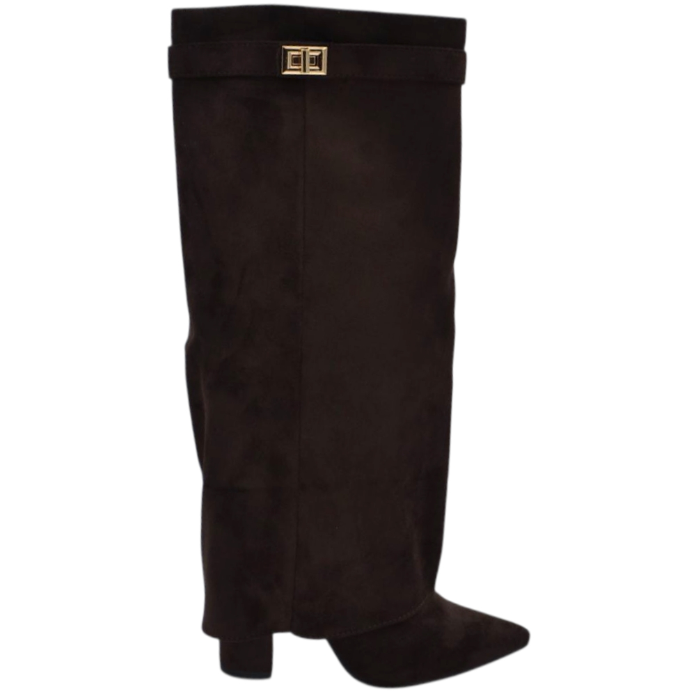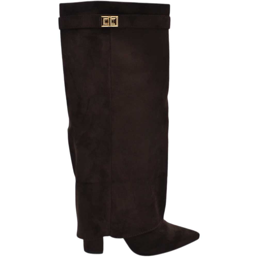 Stivali donna al ginocchio shark a punta in camoscio marrone risvolto gancio oro tacco largo 10 zip interna nascosta