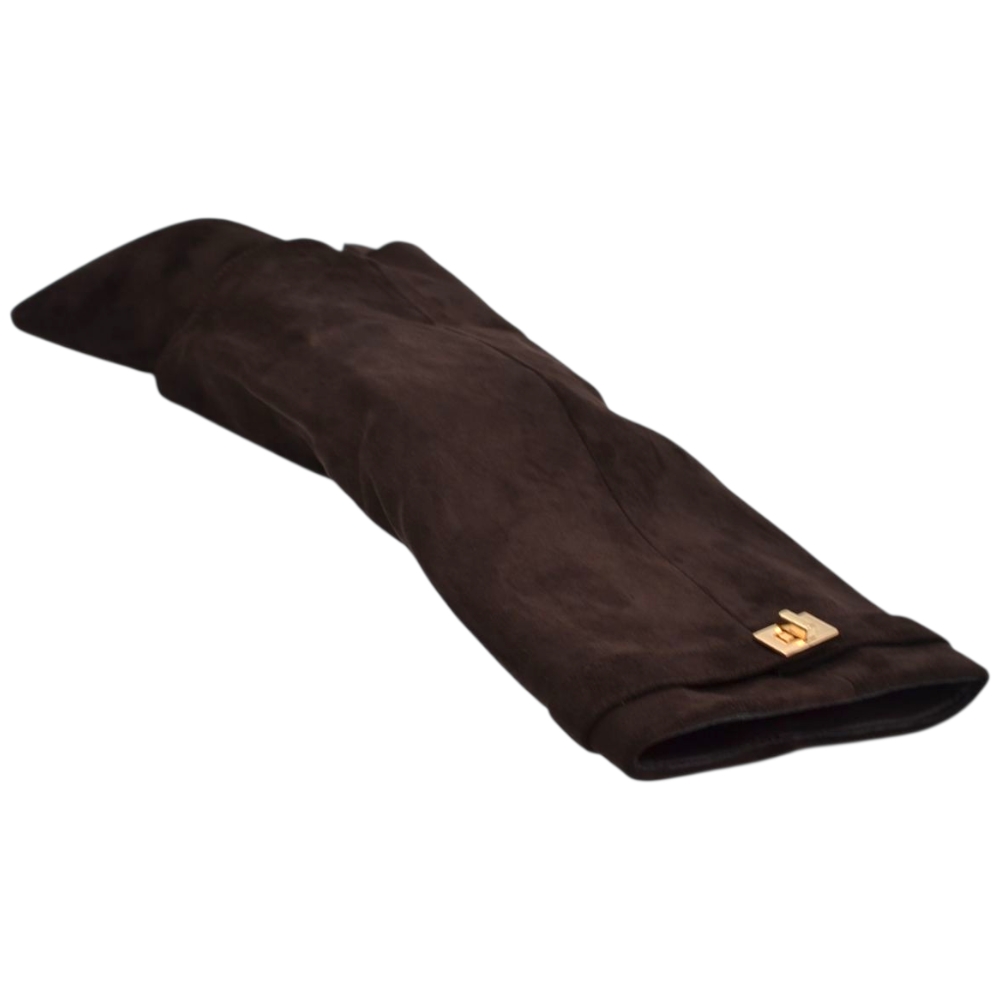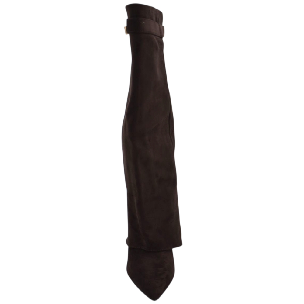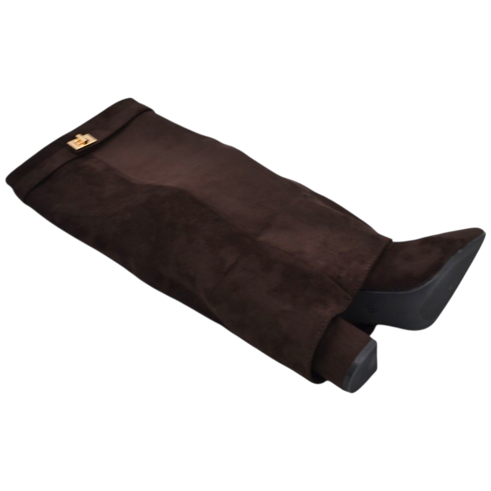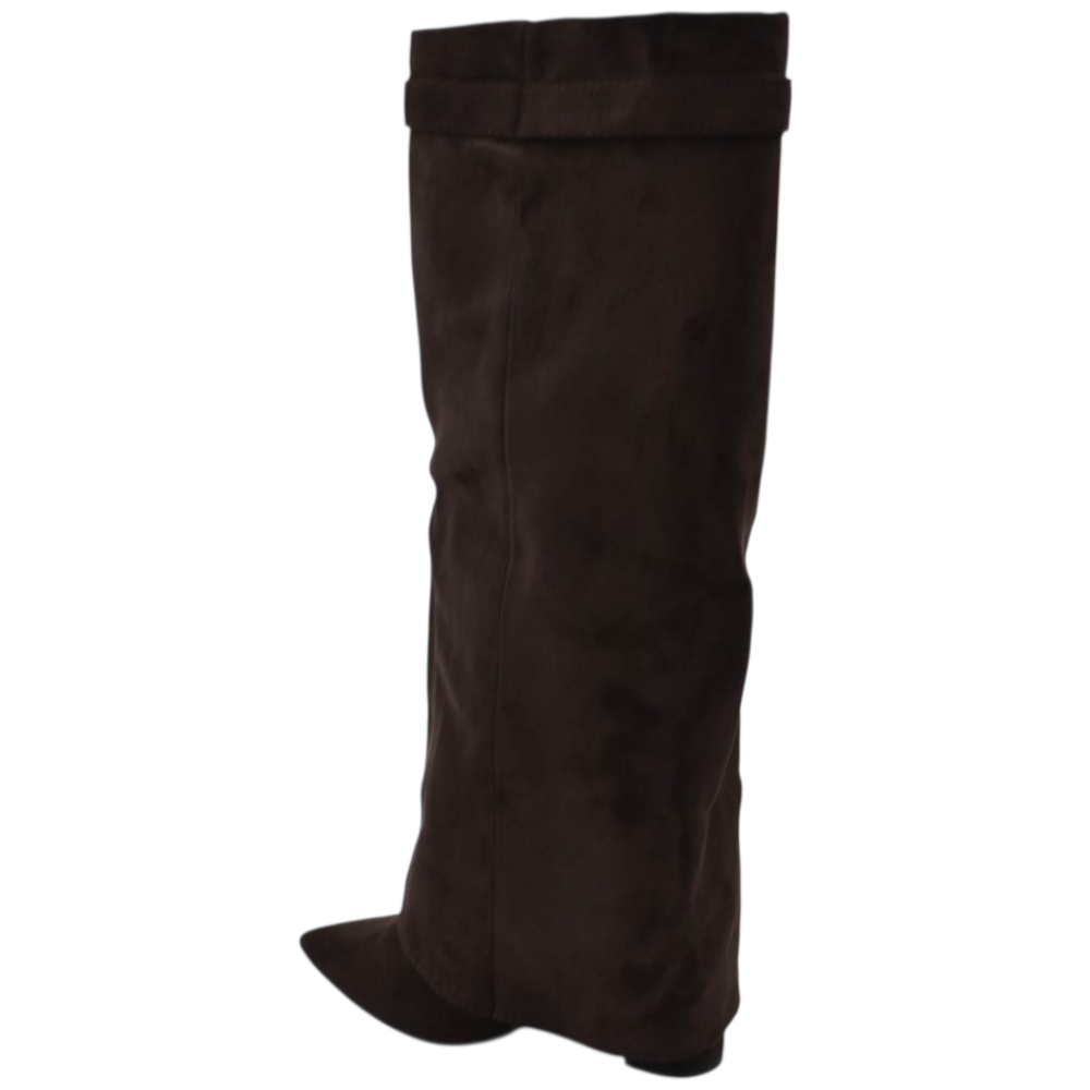 Stivali donna al ginocchio shark a punta in camoscio marrone risvolto gancio oro tacco largo 10 zip interna nascosta