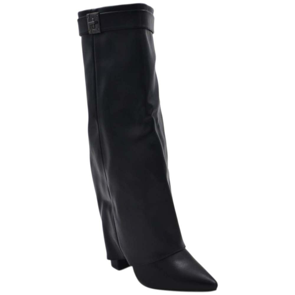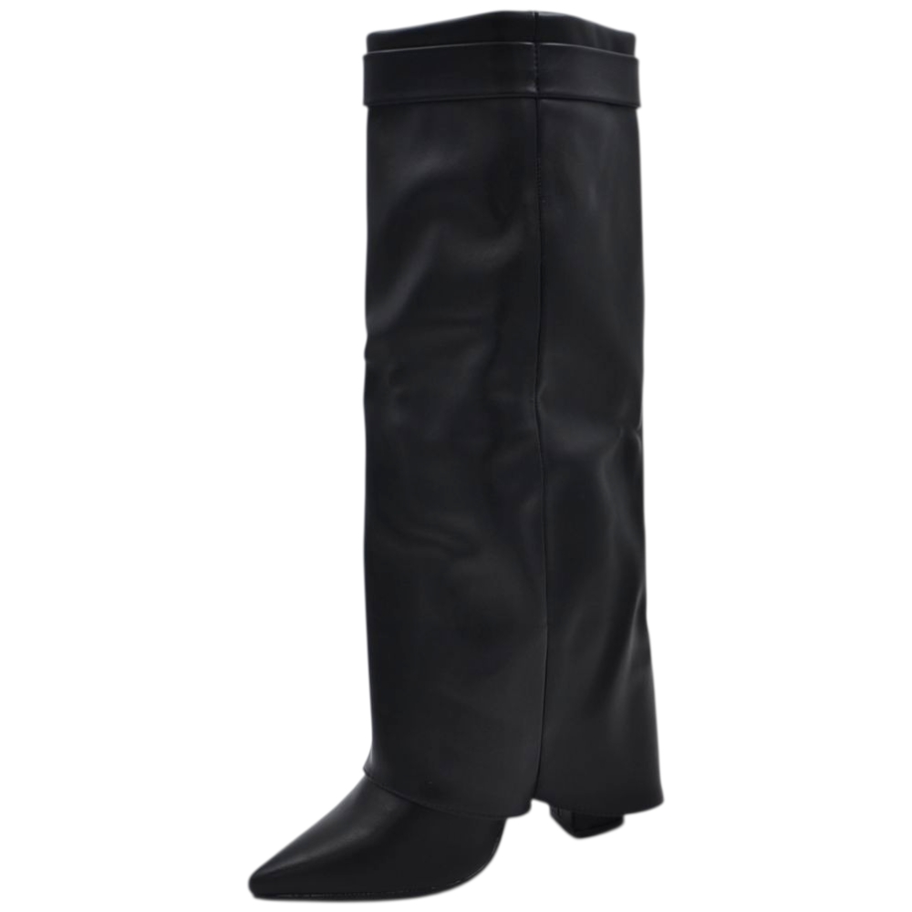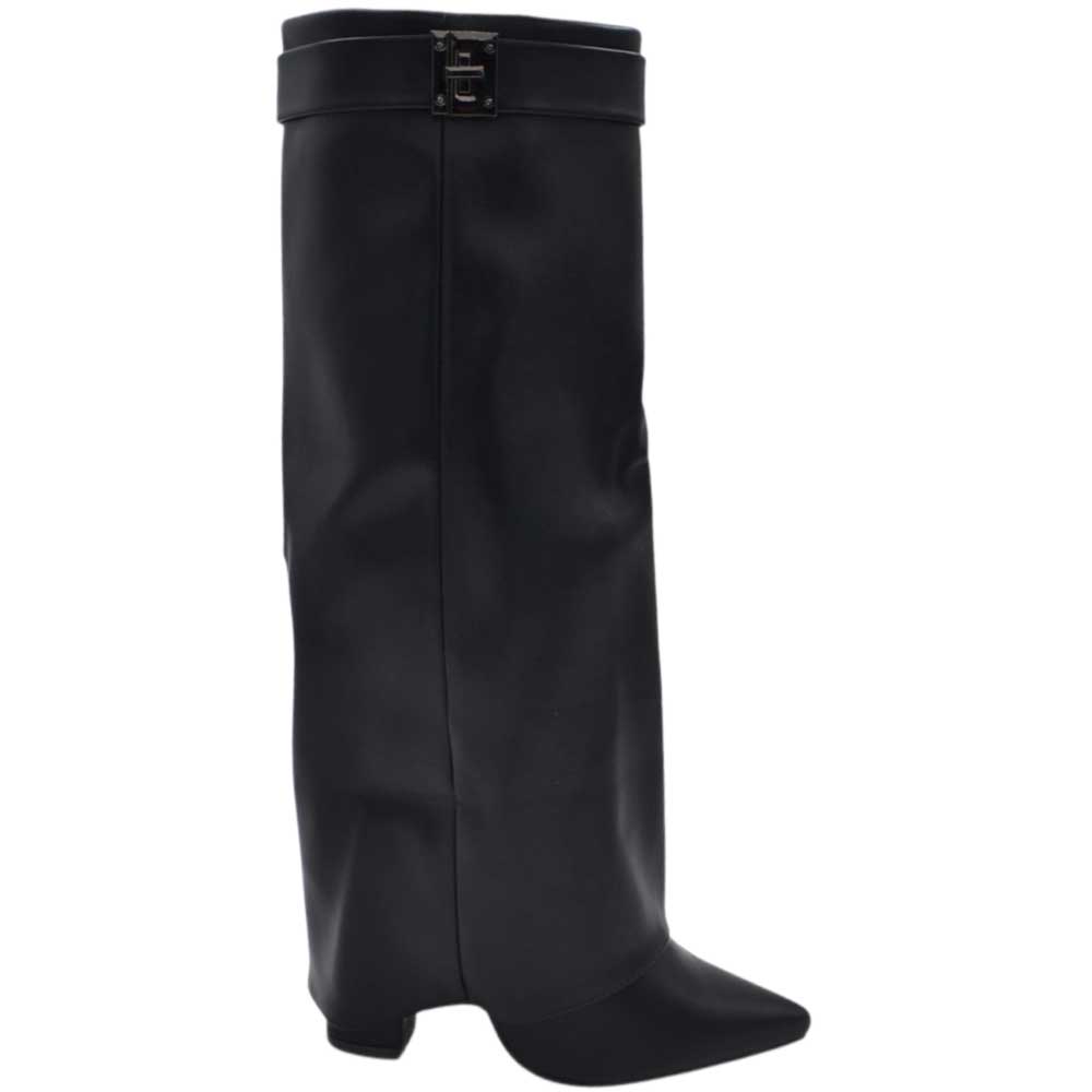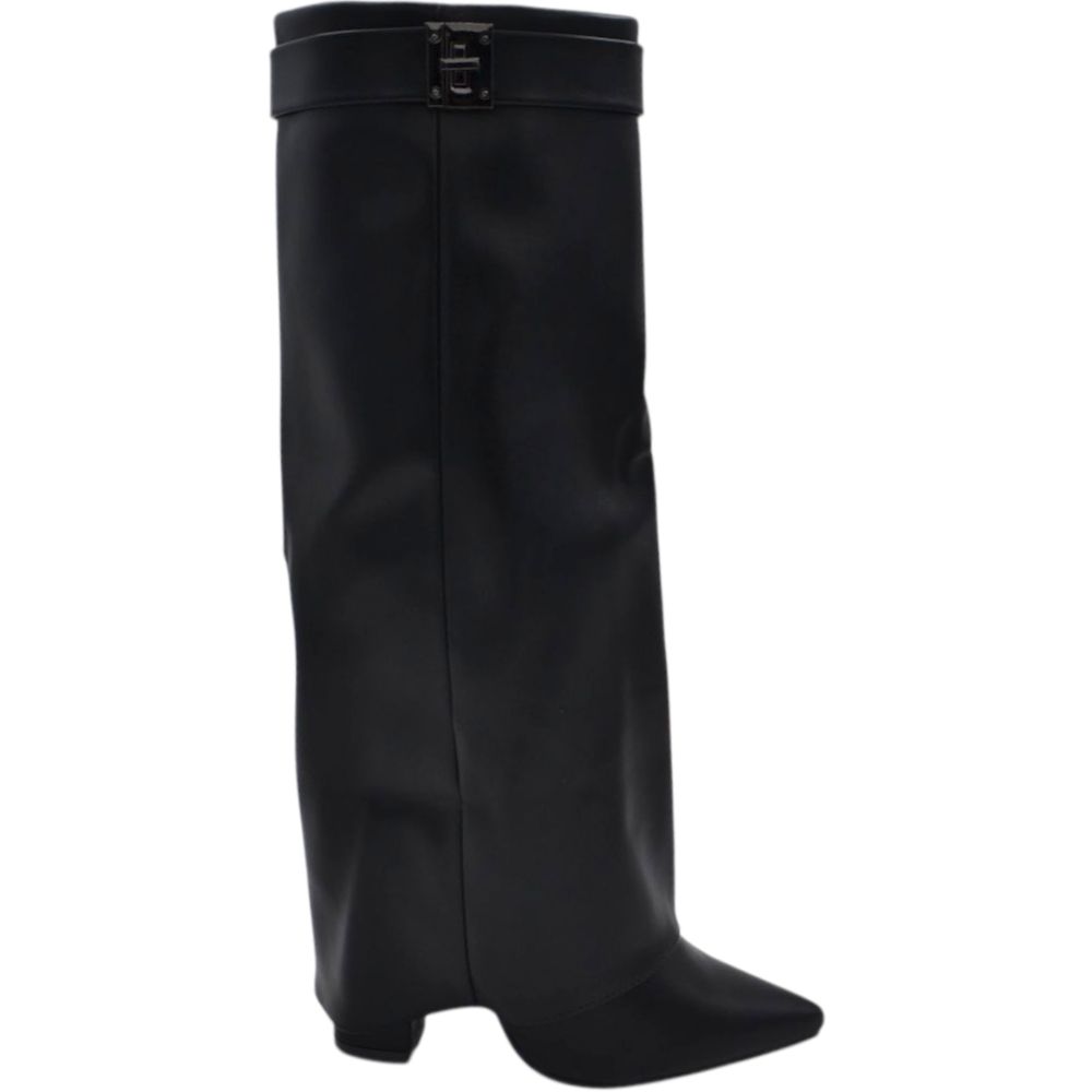 Stivali donna al ginocchio shark a punta in pelle nero con risvolto gancio argento tacco largo 10 zip interna nascosta
