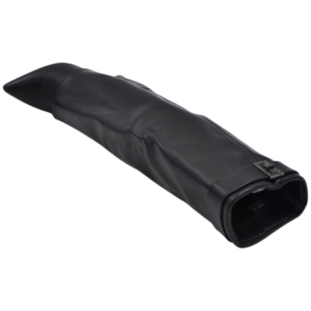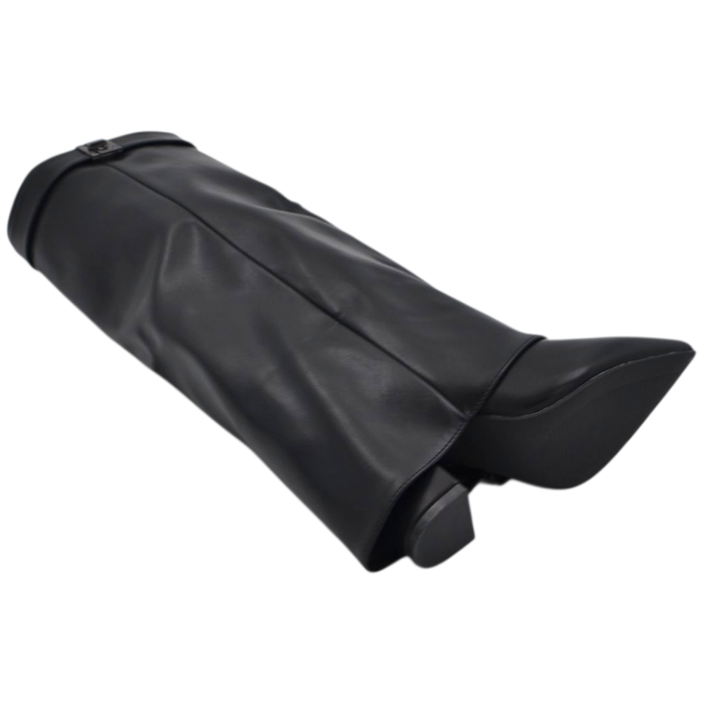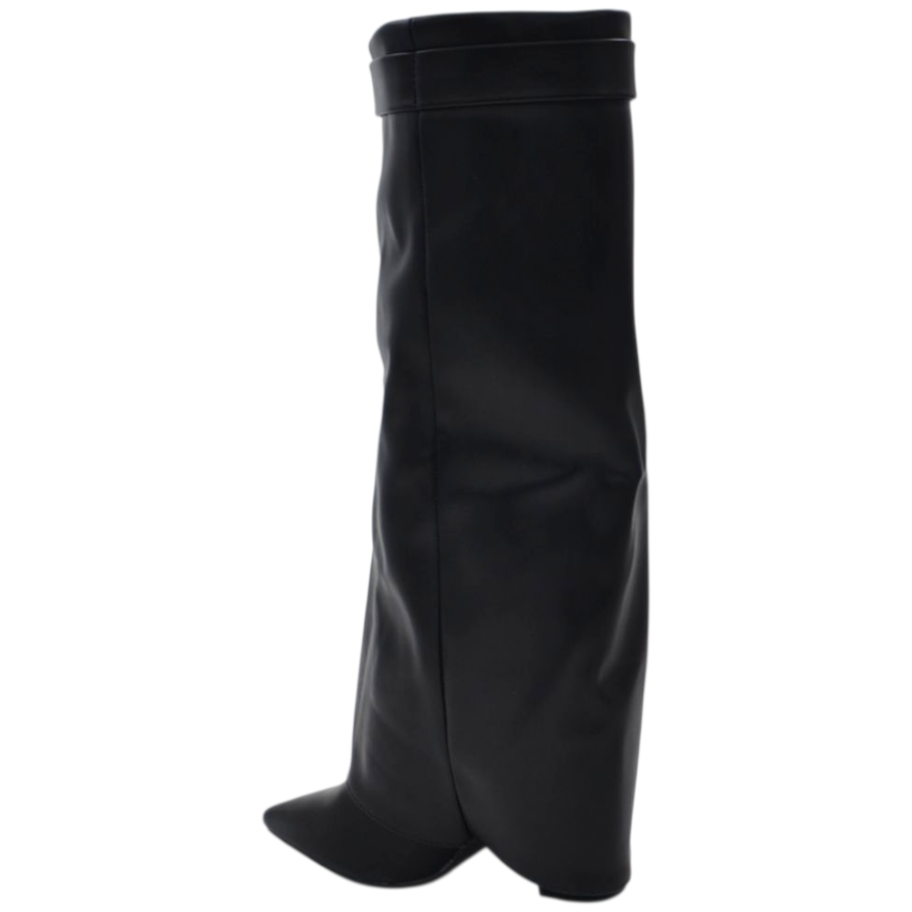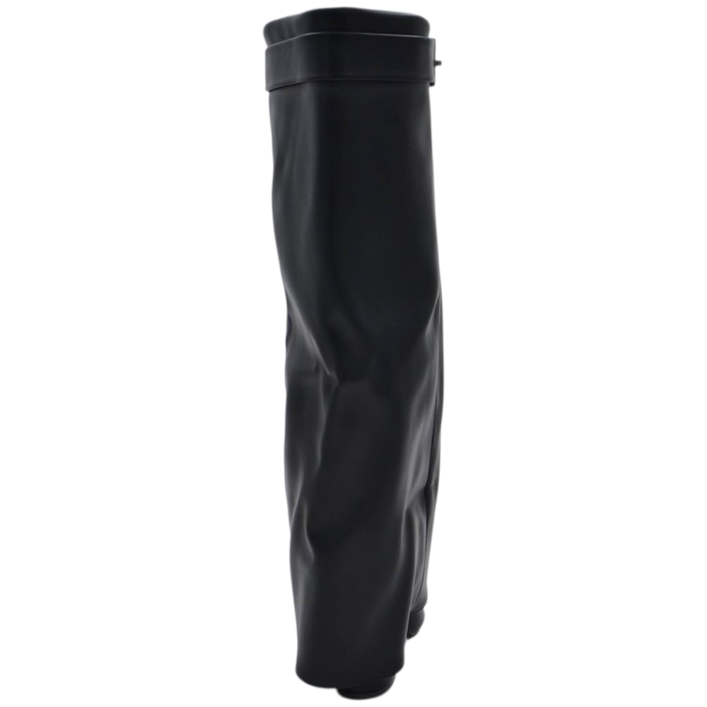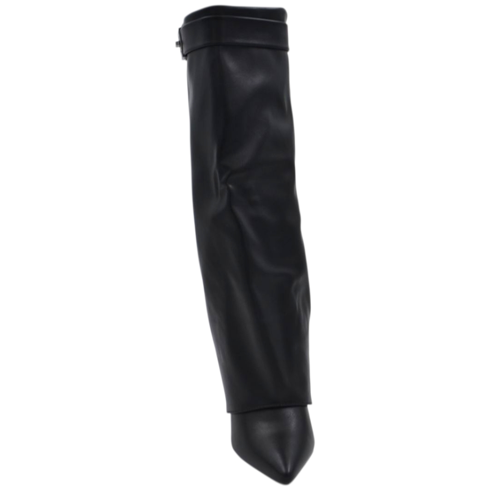 Stivali donna al ginocchio shark a punta in pelle nero con risvolto gancio argento tacco largo 10 zip interna nascosta