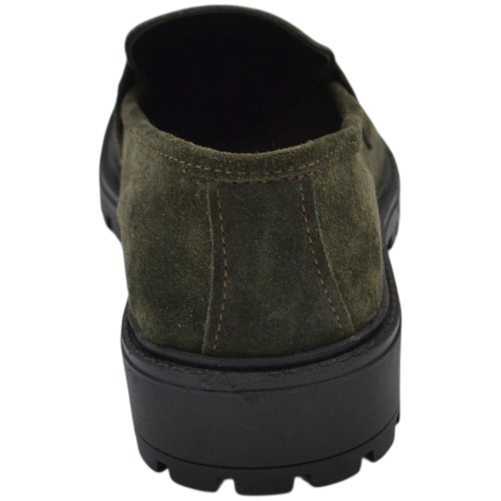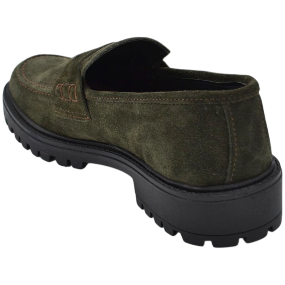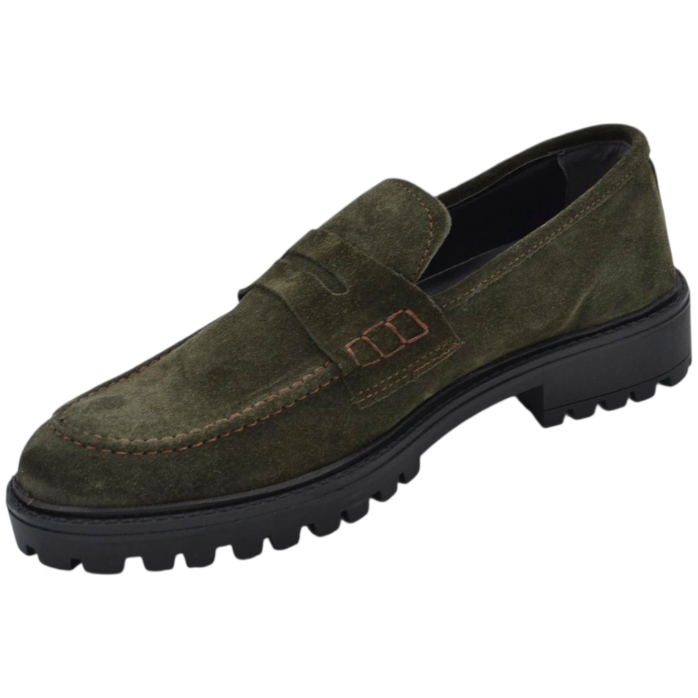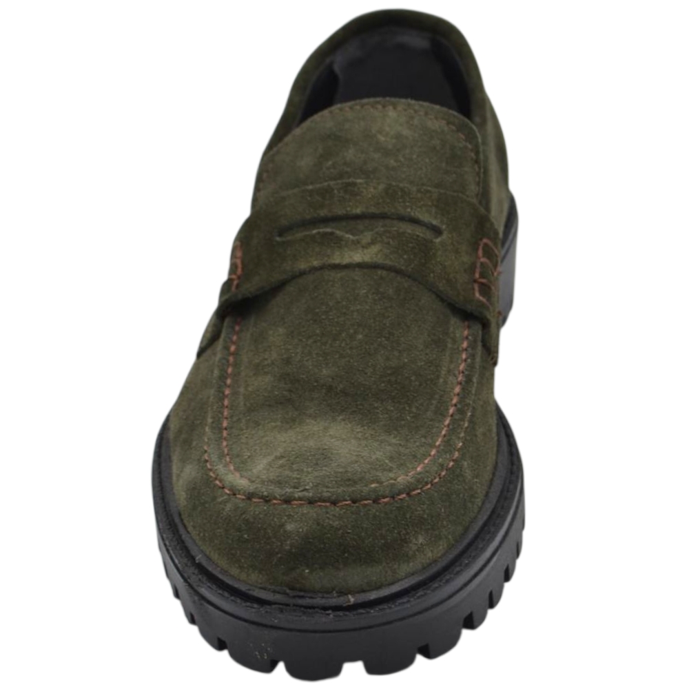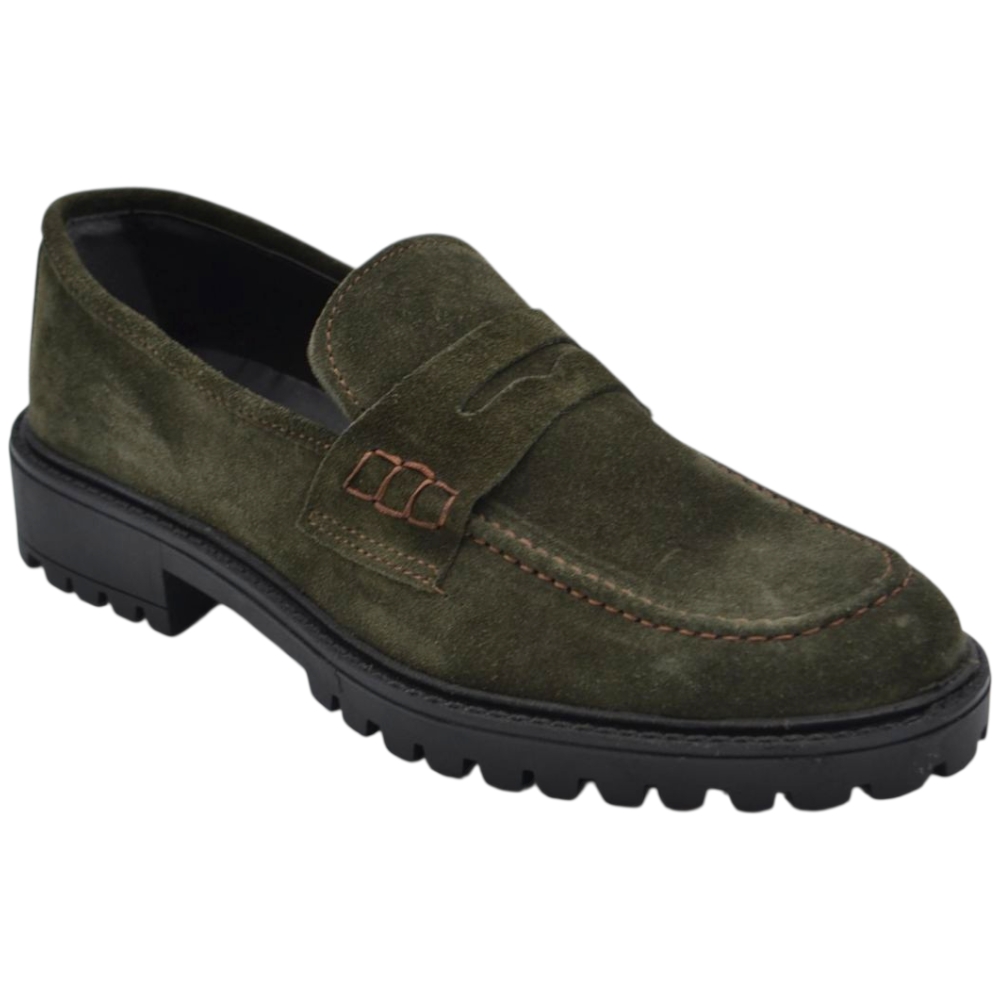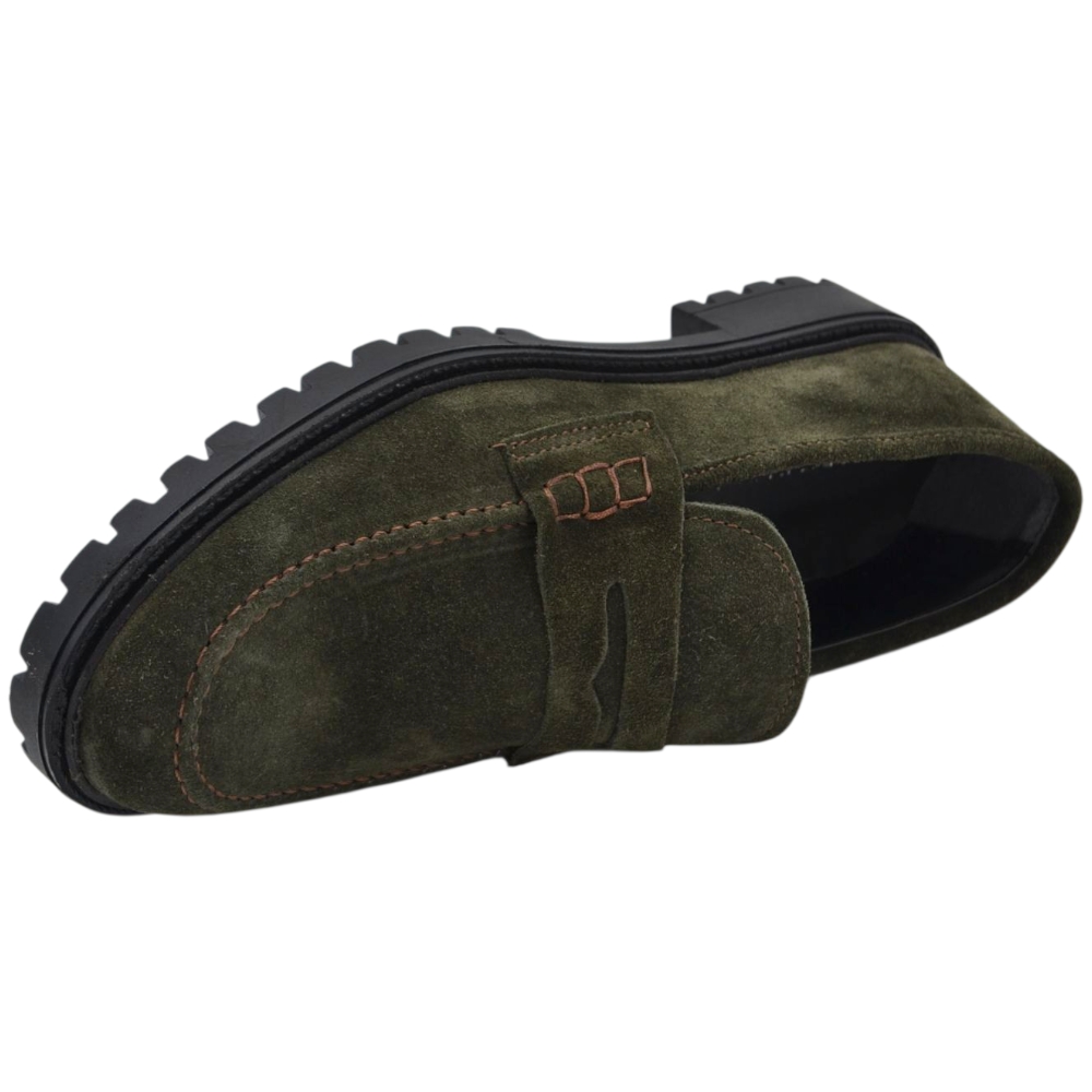 Scarpe uomo mocassino con bendina verde in vera pelle scamosciata business fondo gomma zigrinato alto