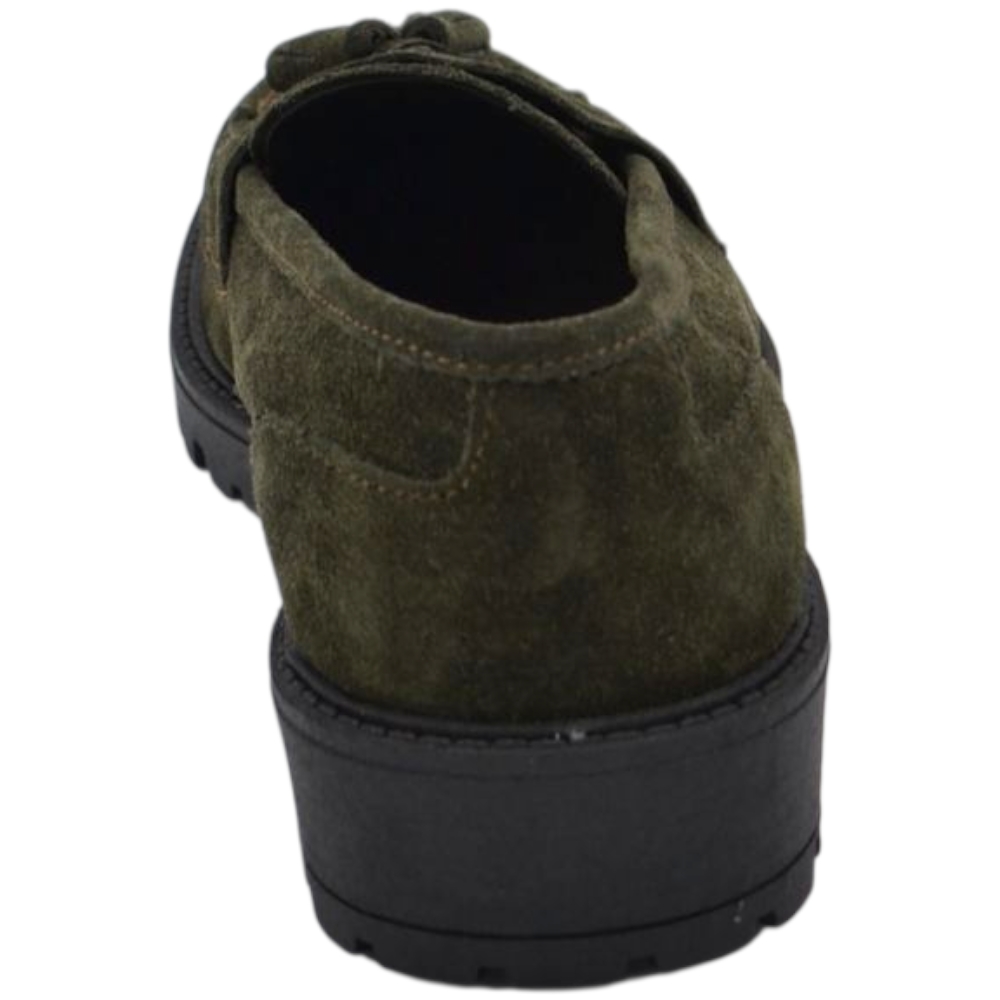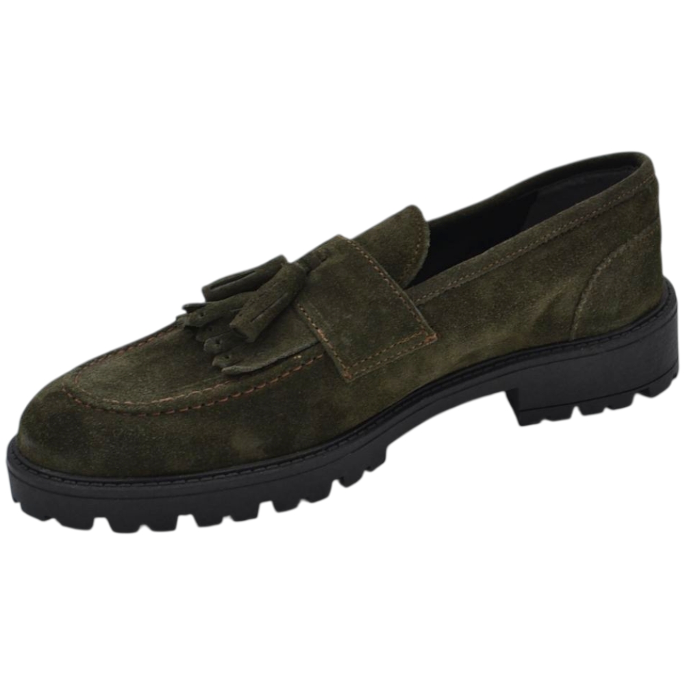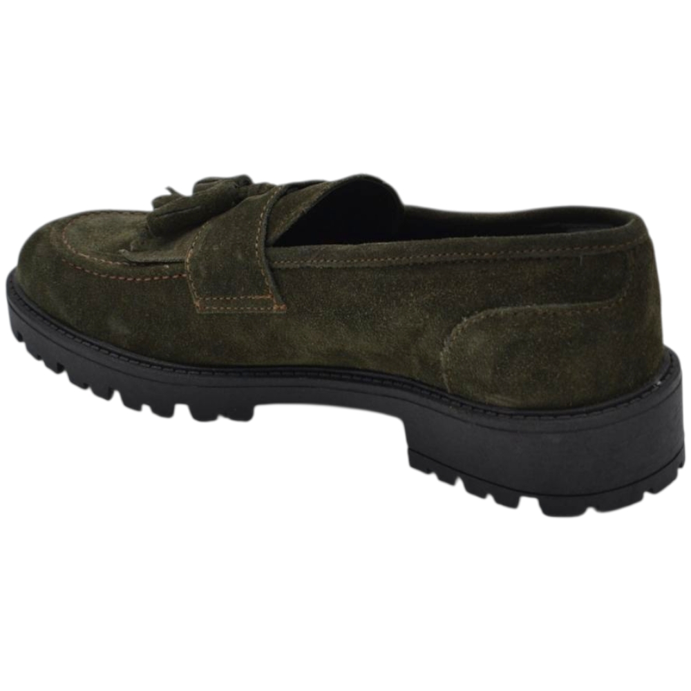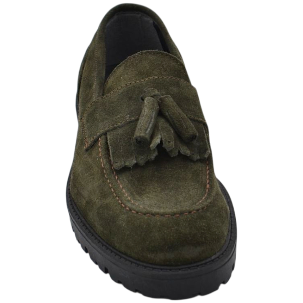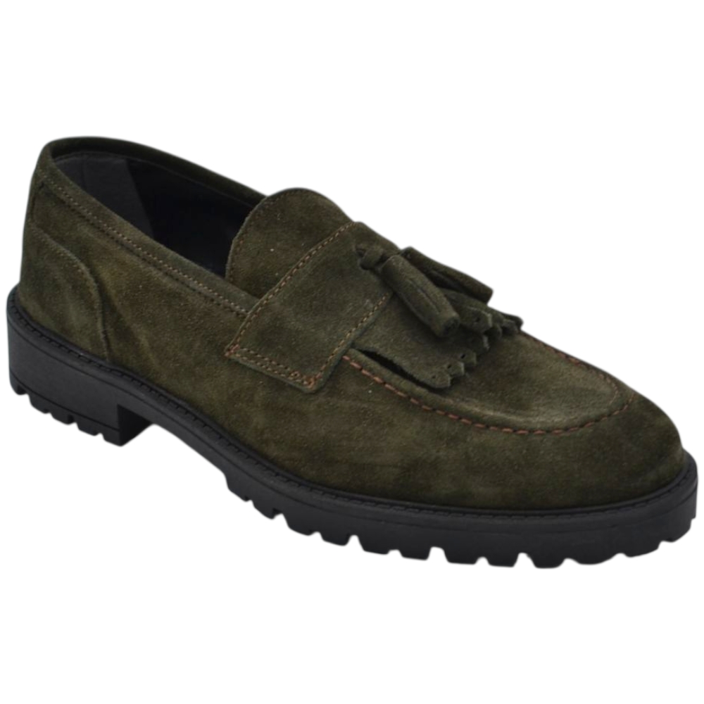 Scarpe uomo mocassino con bendina e bon bon verde in vera pelle scamosciata business fondo gomma zigrinato alto