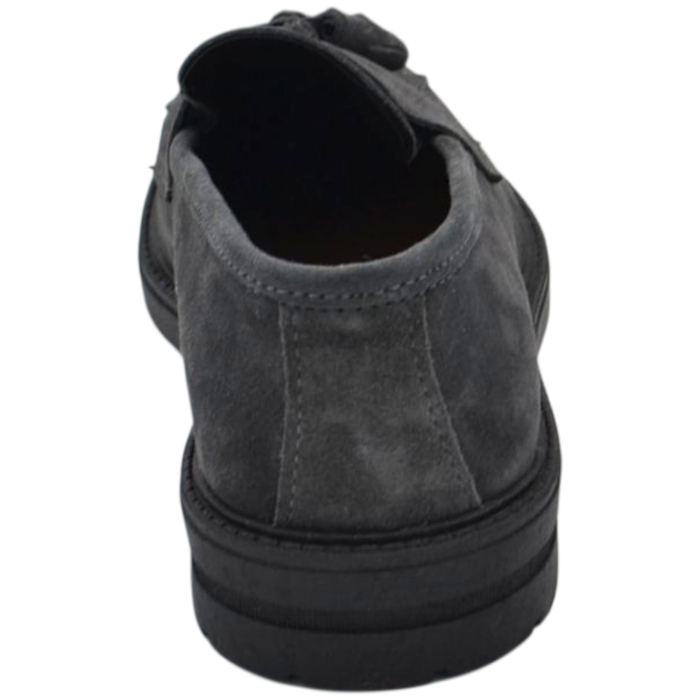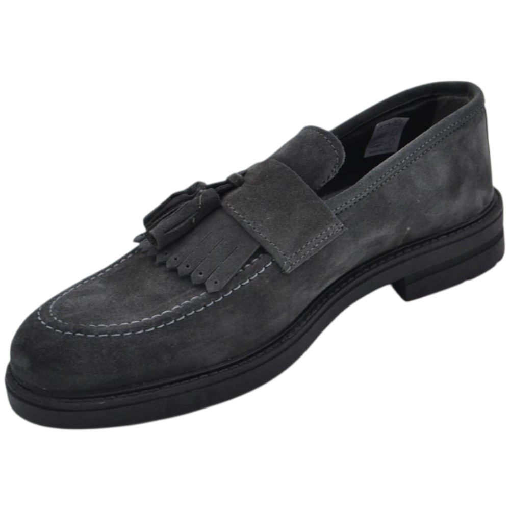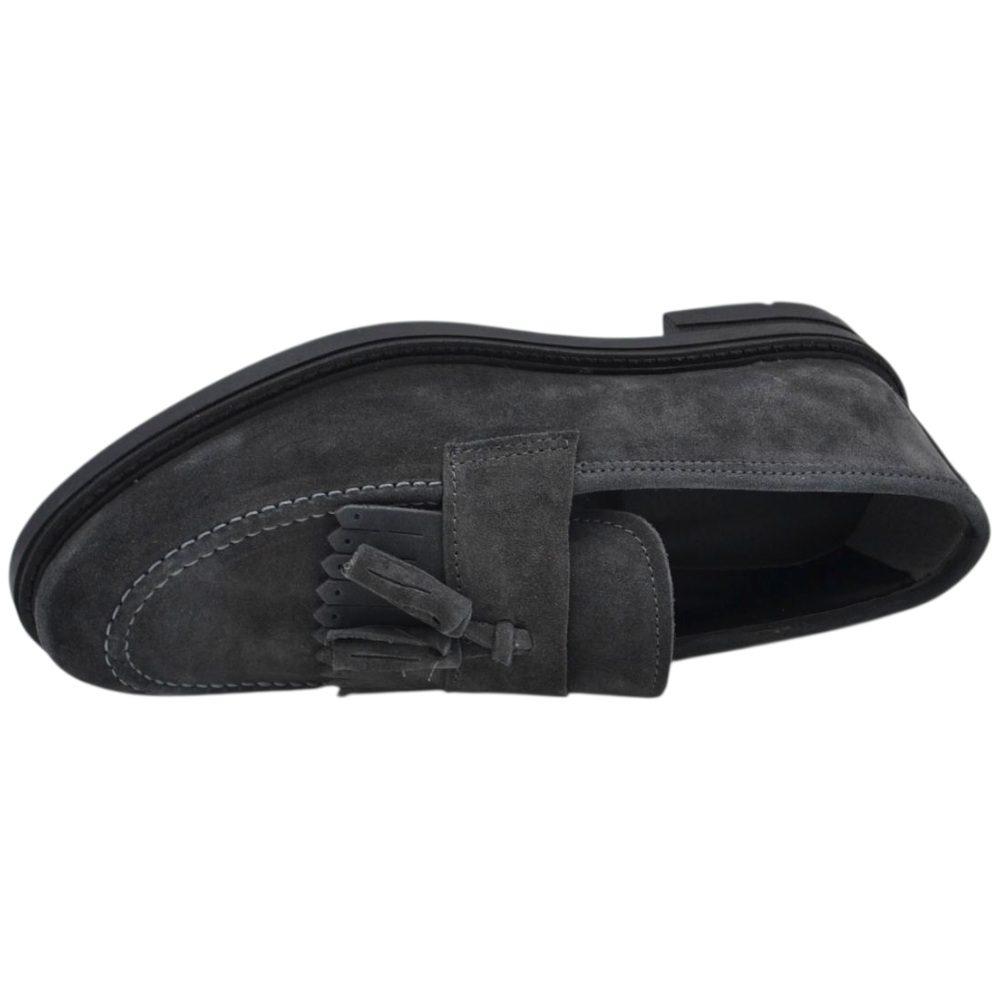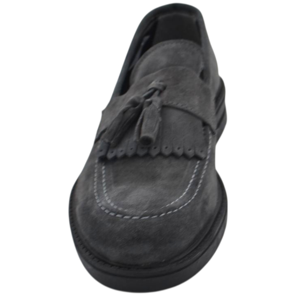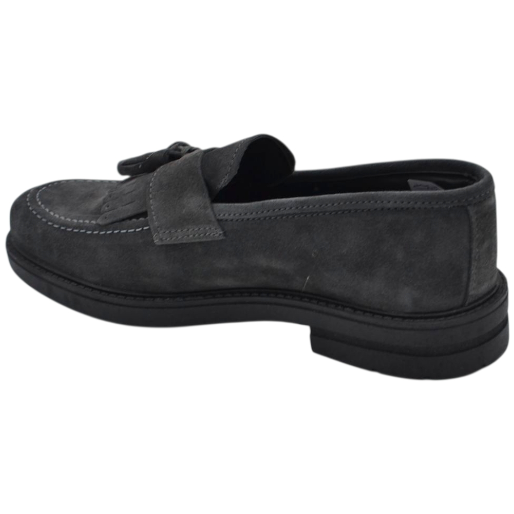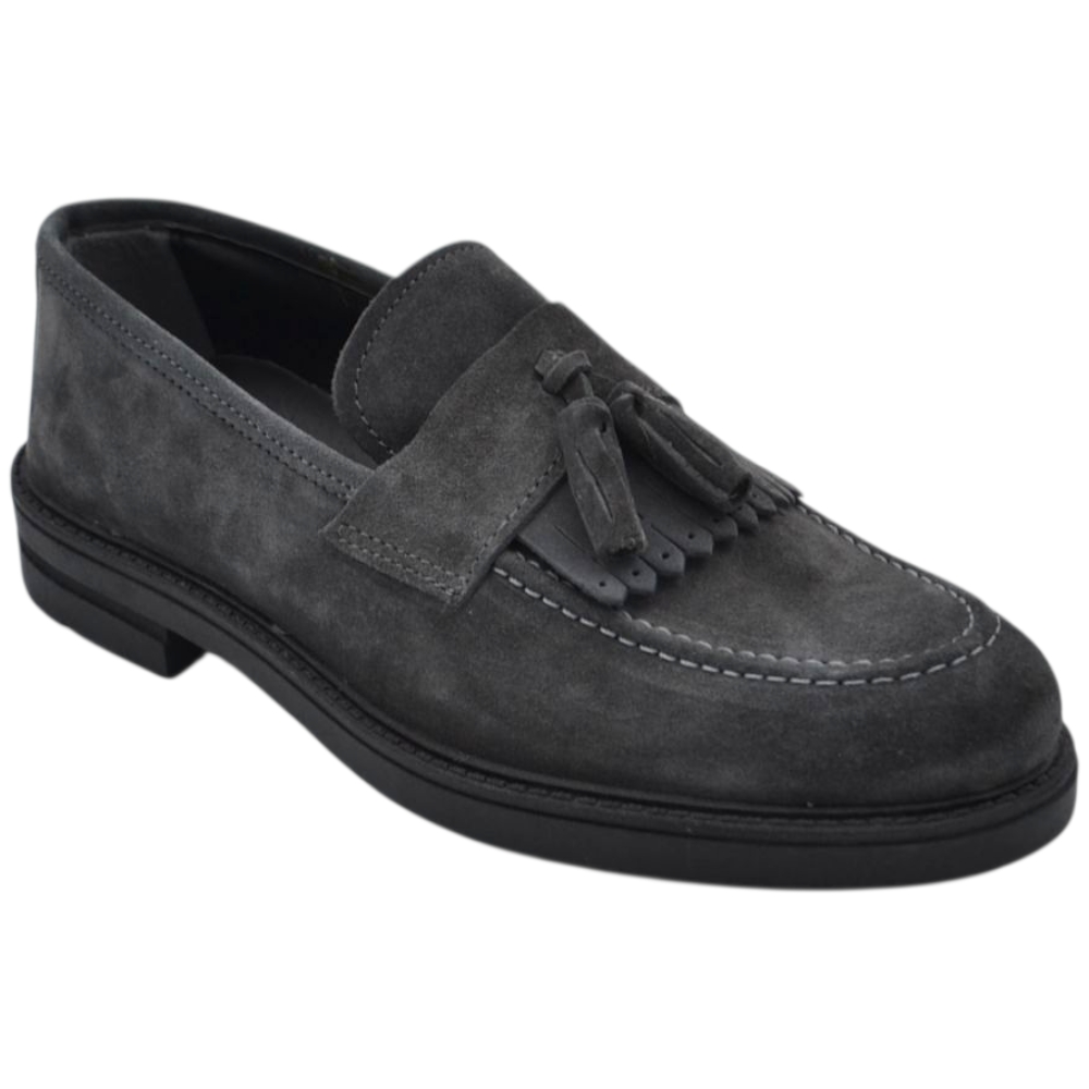 Scarpe uomo mocassino con bendina e bon bon grigio in vera pelle scamosciata business fondo gomma zigrinato alto