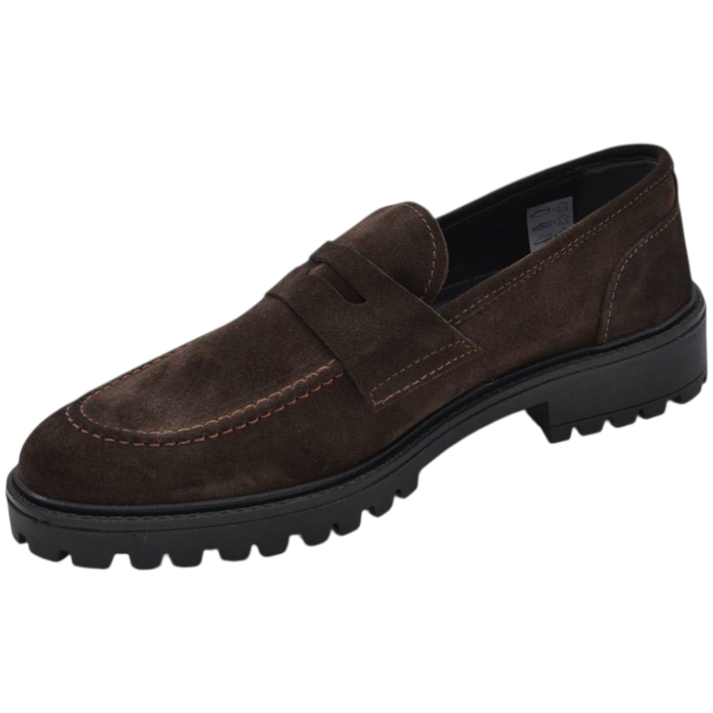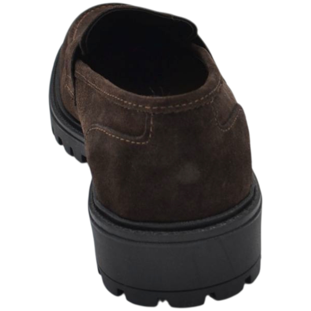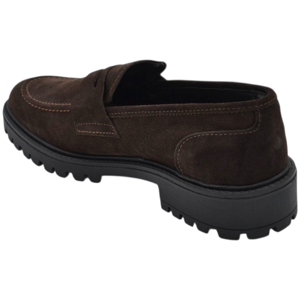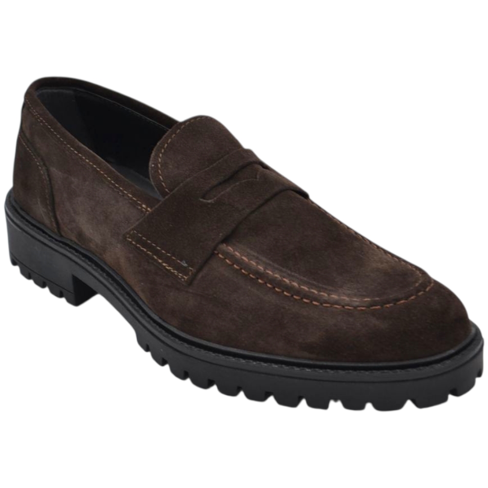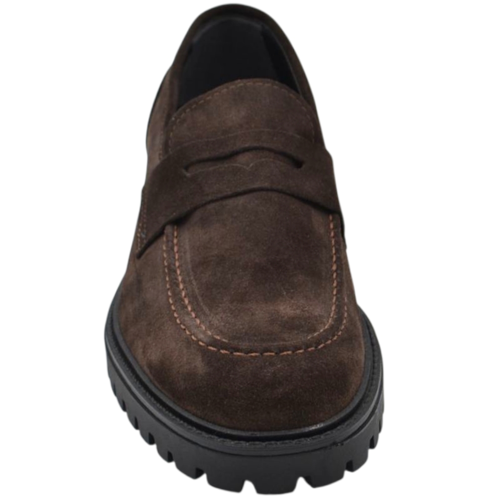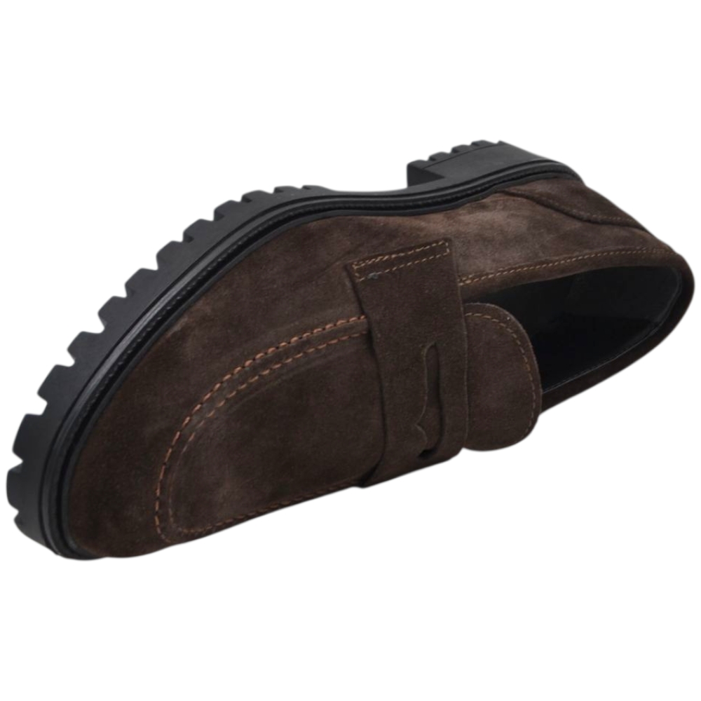 Scarpe uomo mocassino con bendina marrone in vera pelle scamosciata business fondo gomma zigrinato alto