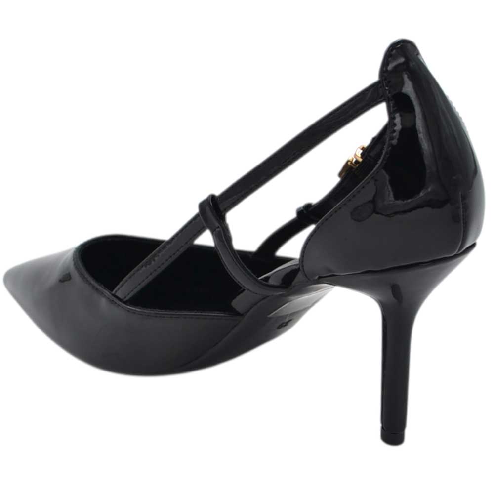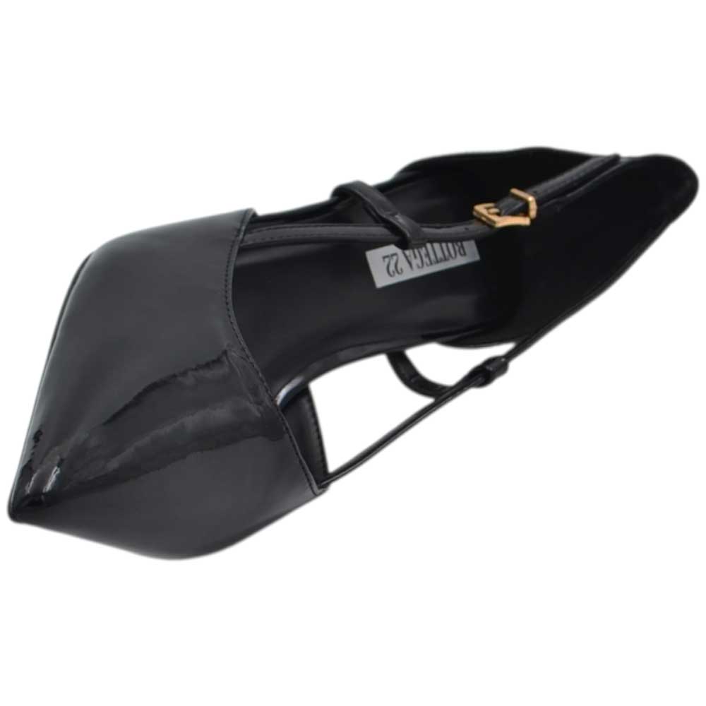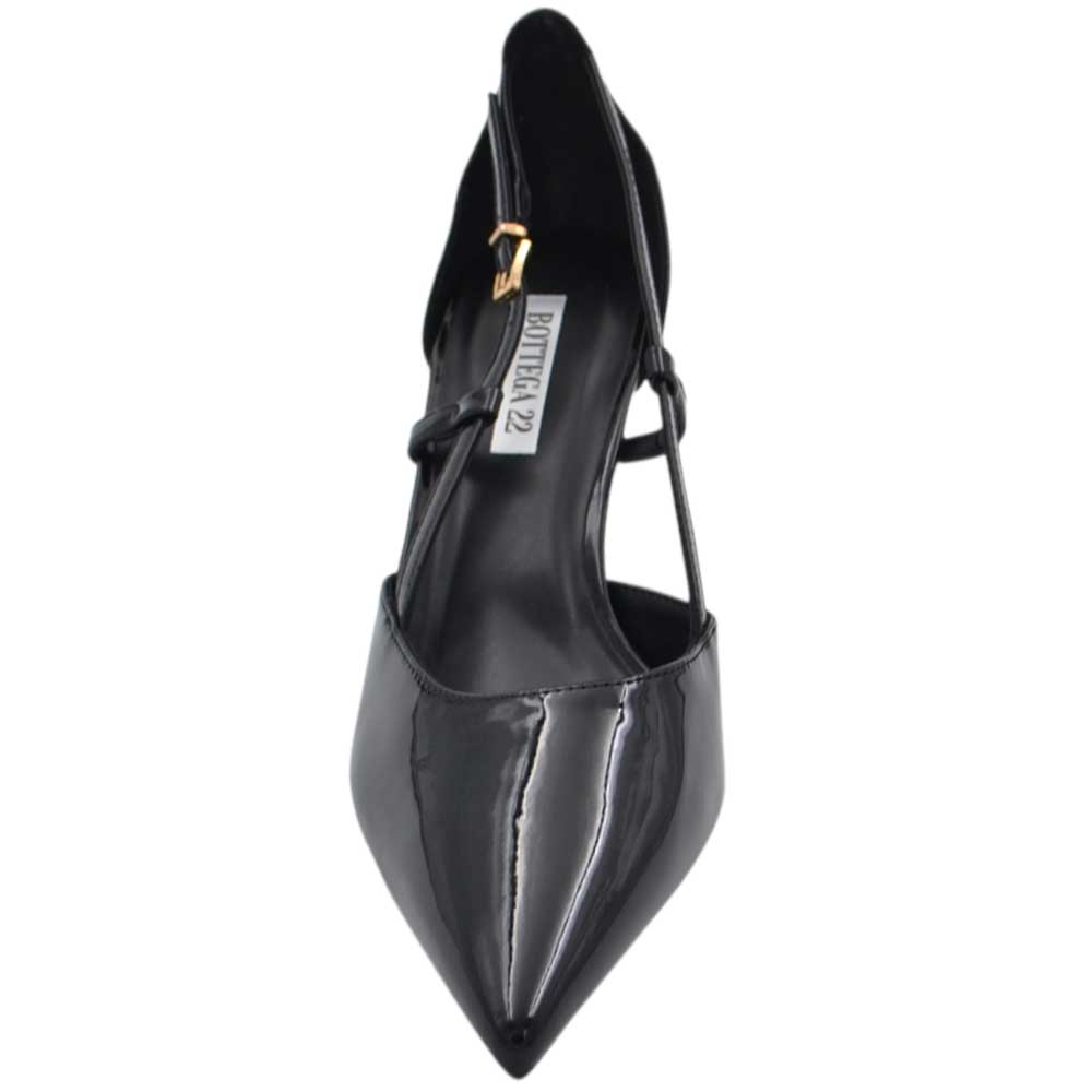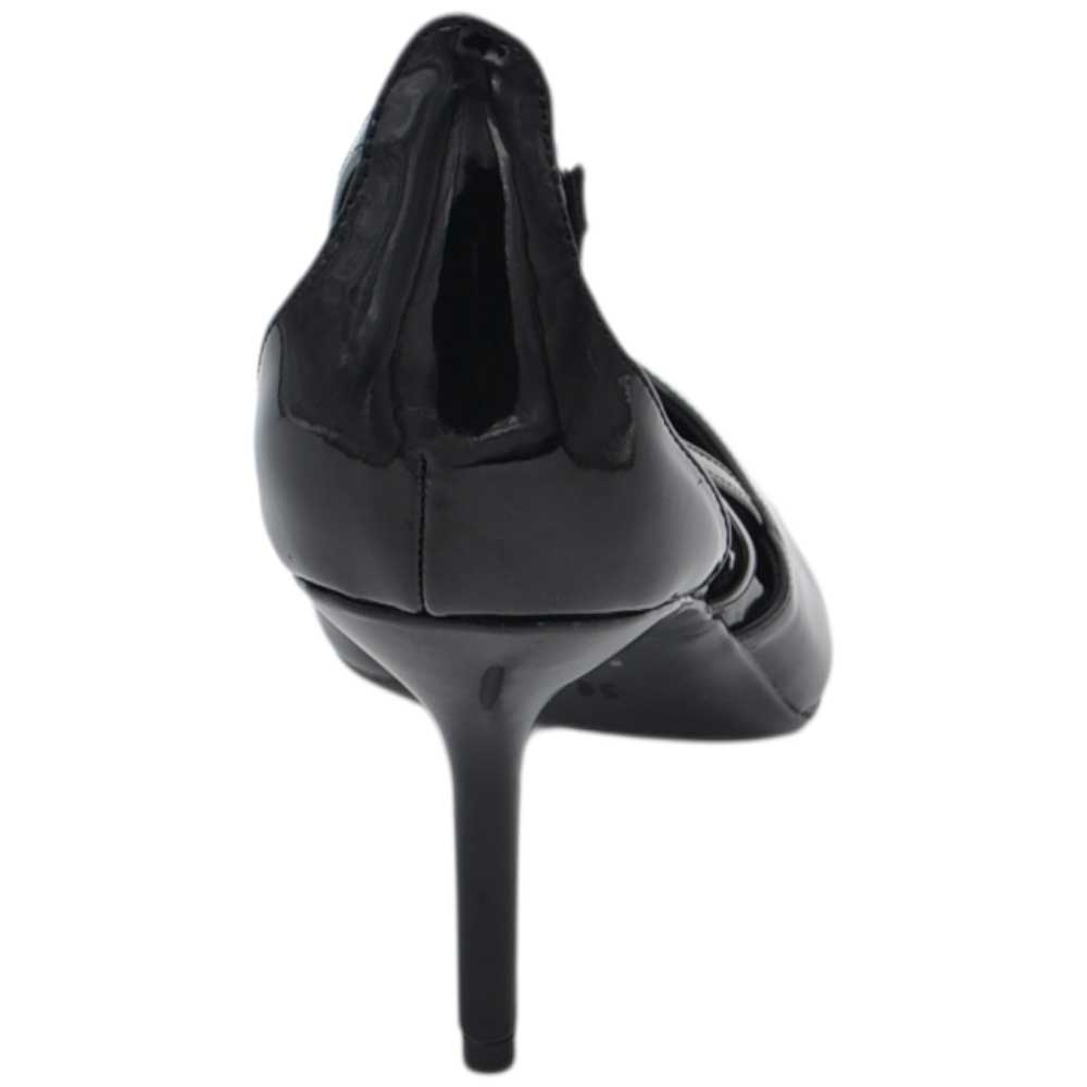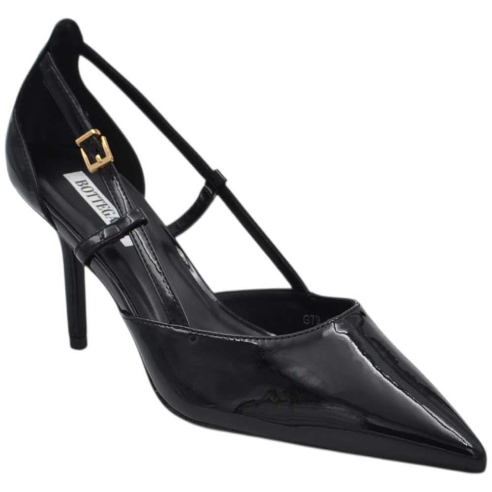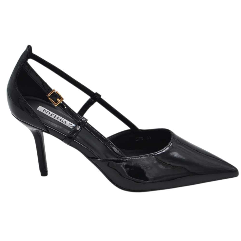Decollete donna a punta in vernice nero con tacco a spillo 10 con aperture laterali e cinturino regolabile