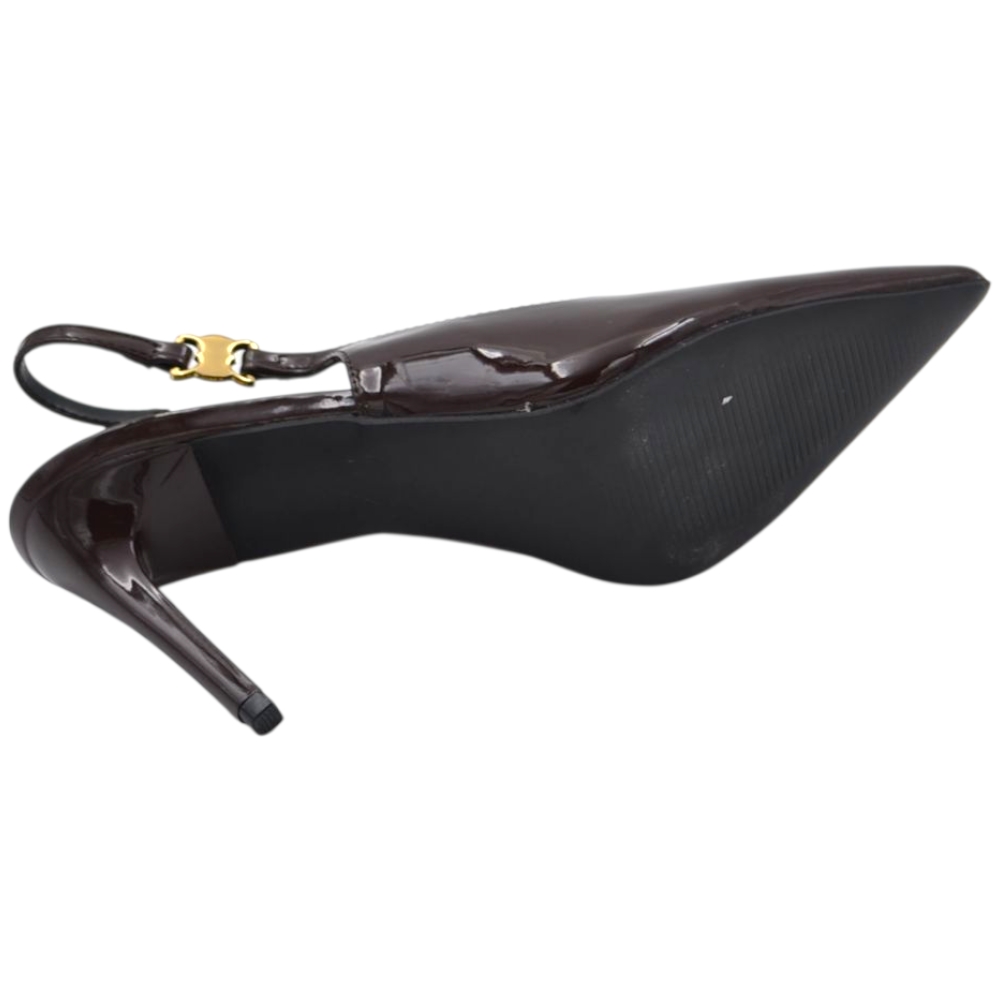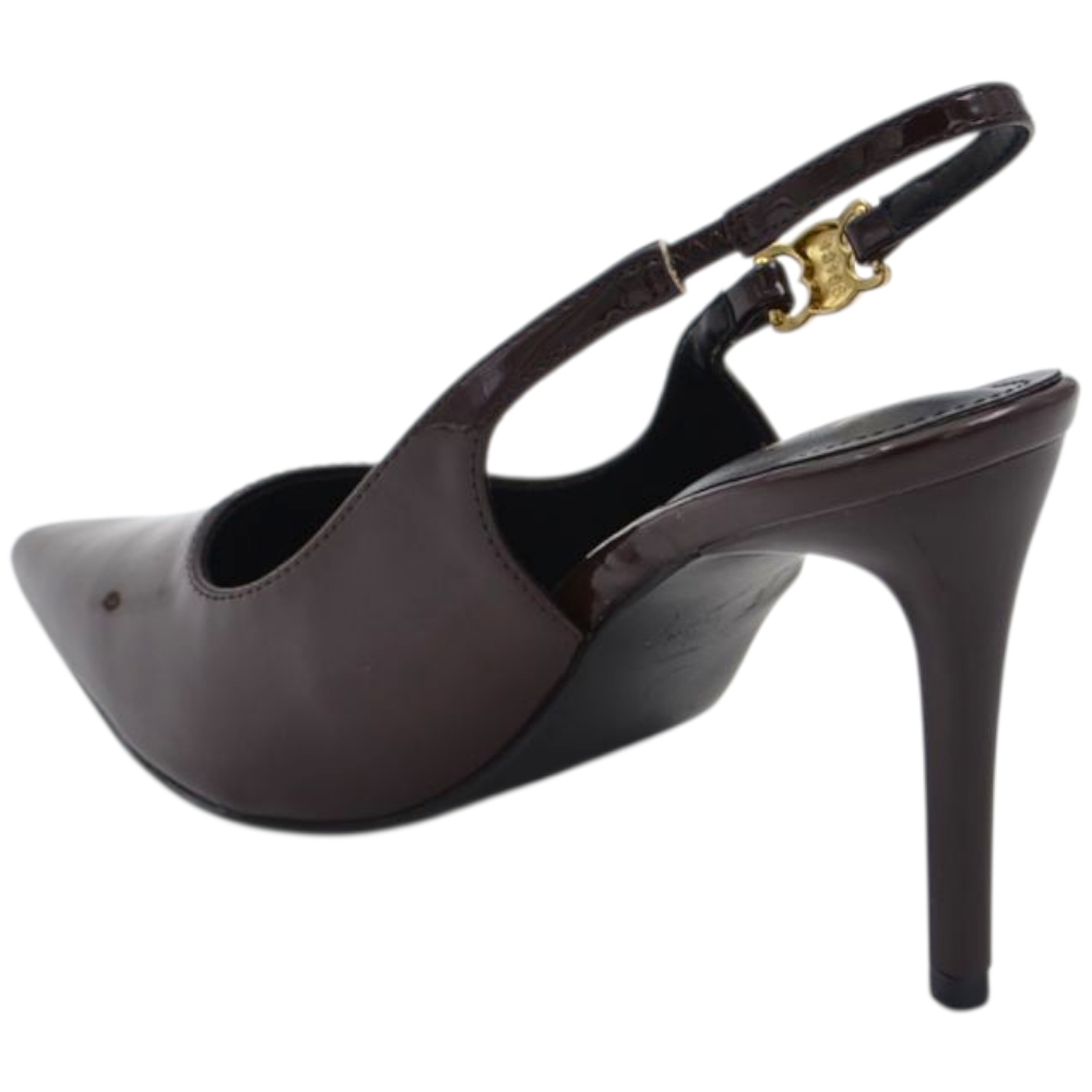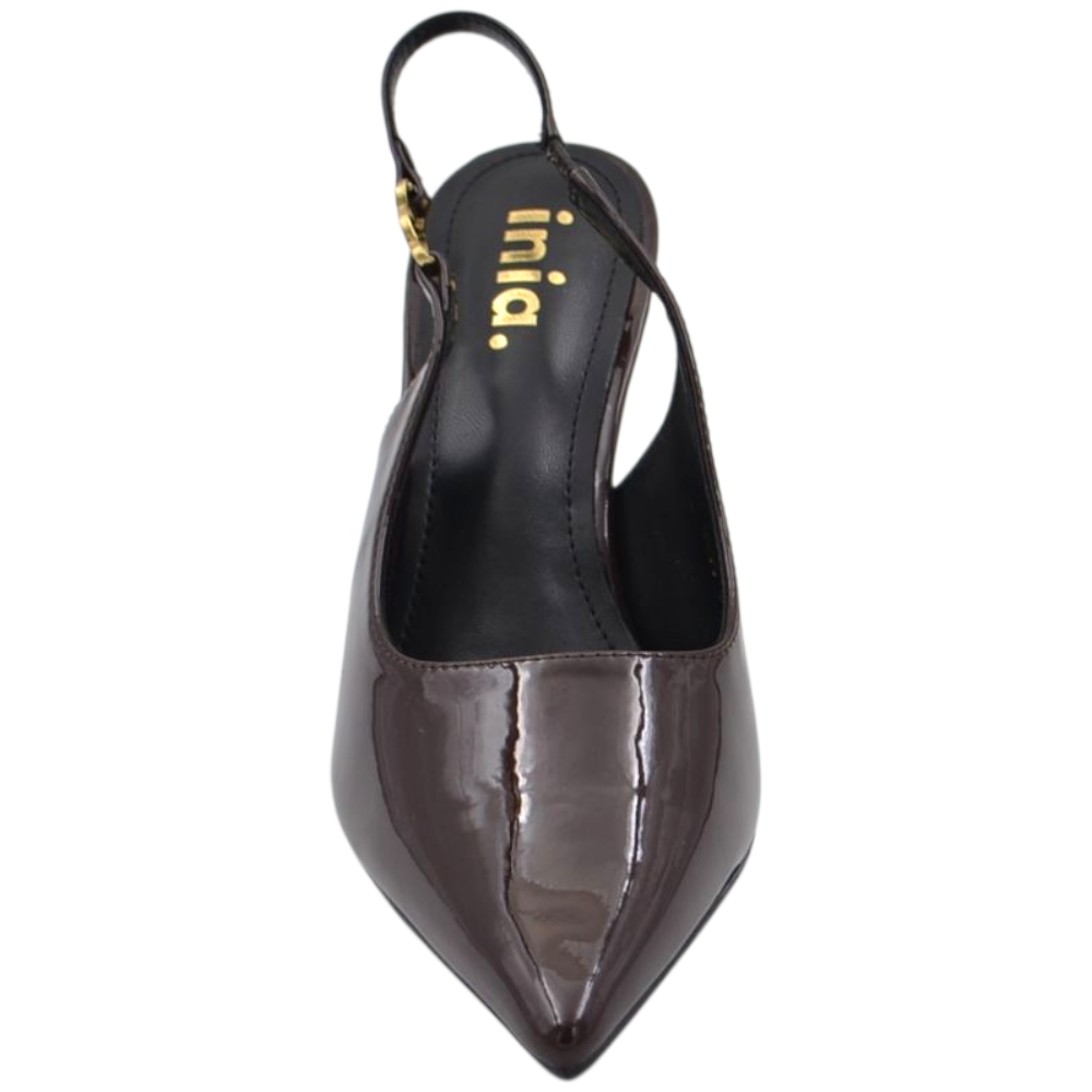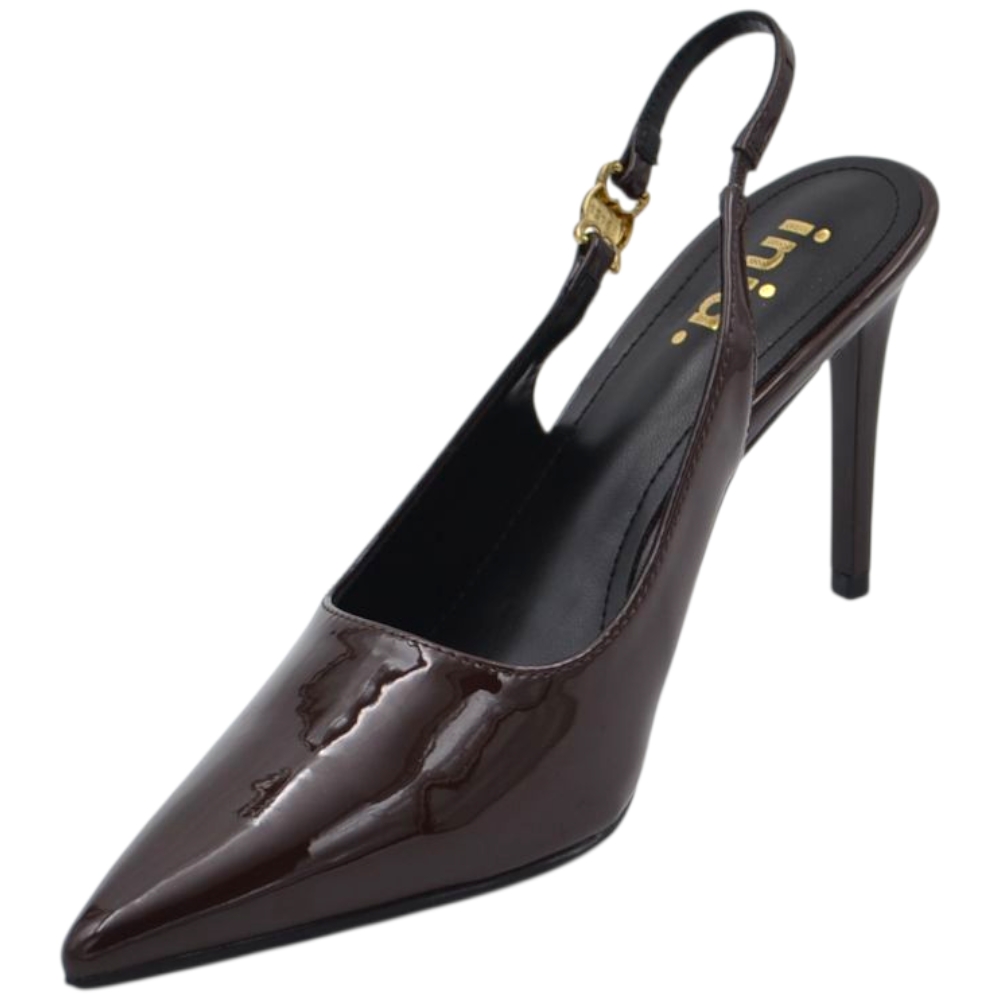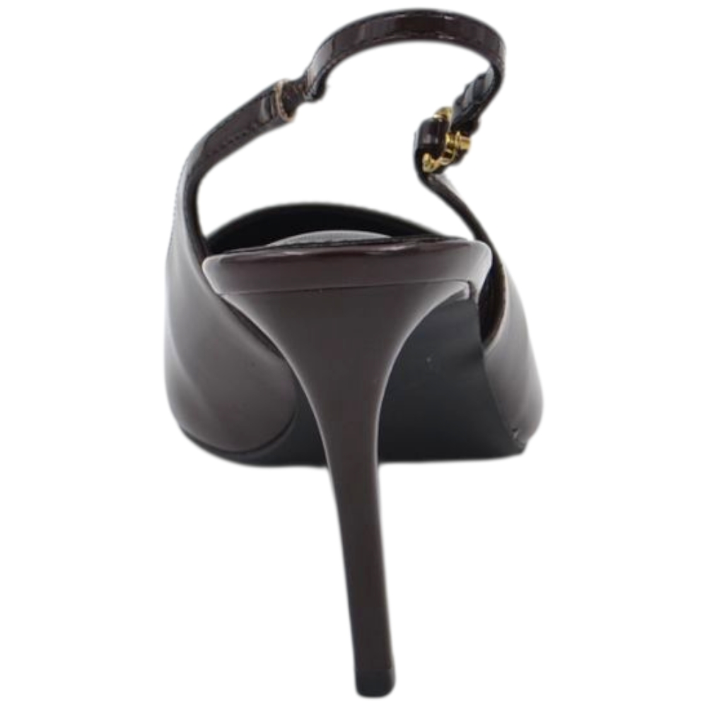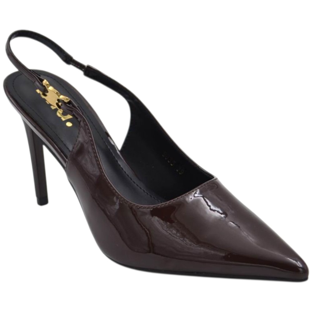 Decollete donna a punta slingback in vernice lucida testa di moro marrone con gancio oro tacco a spillo 12