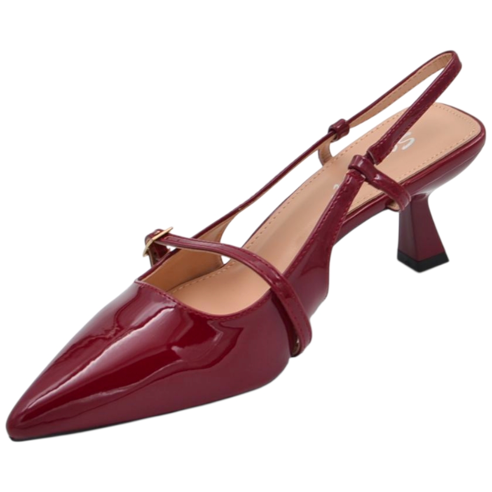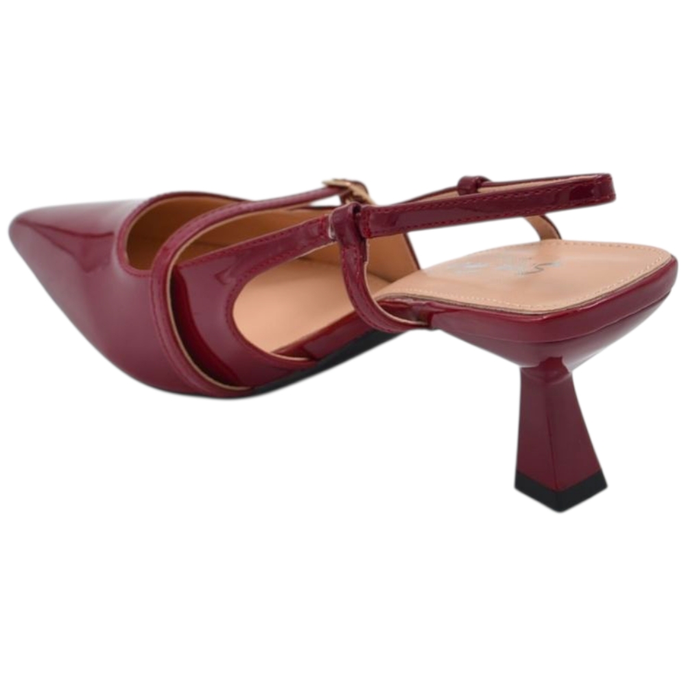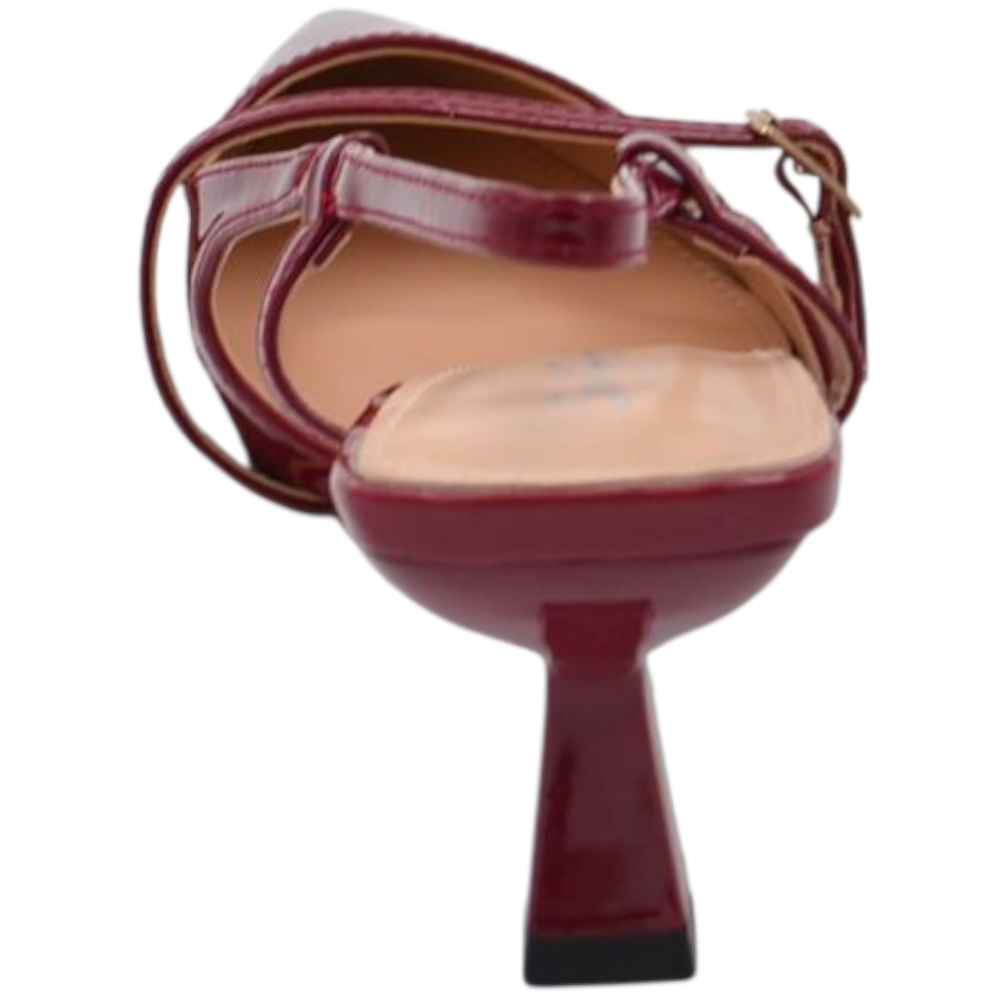 Decollete donna a punta in vernice bordeaux tacco spillo 4 cm con aperture laterali e cinturino alla caviglia regolabile