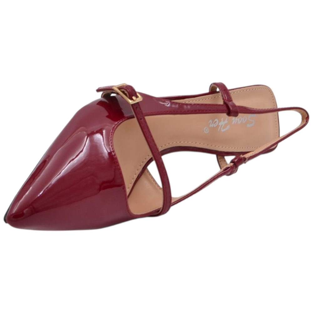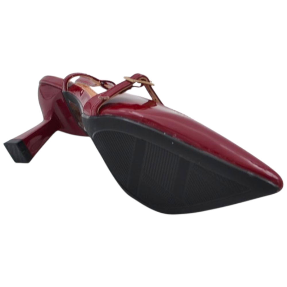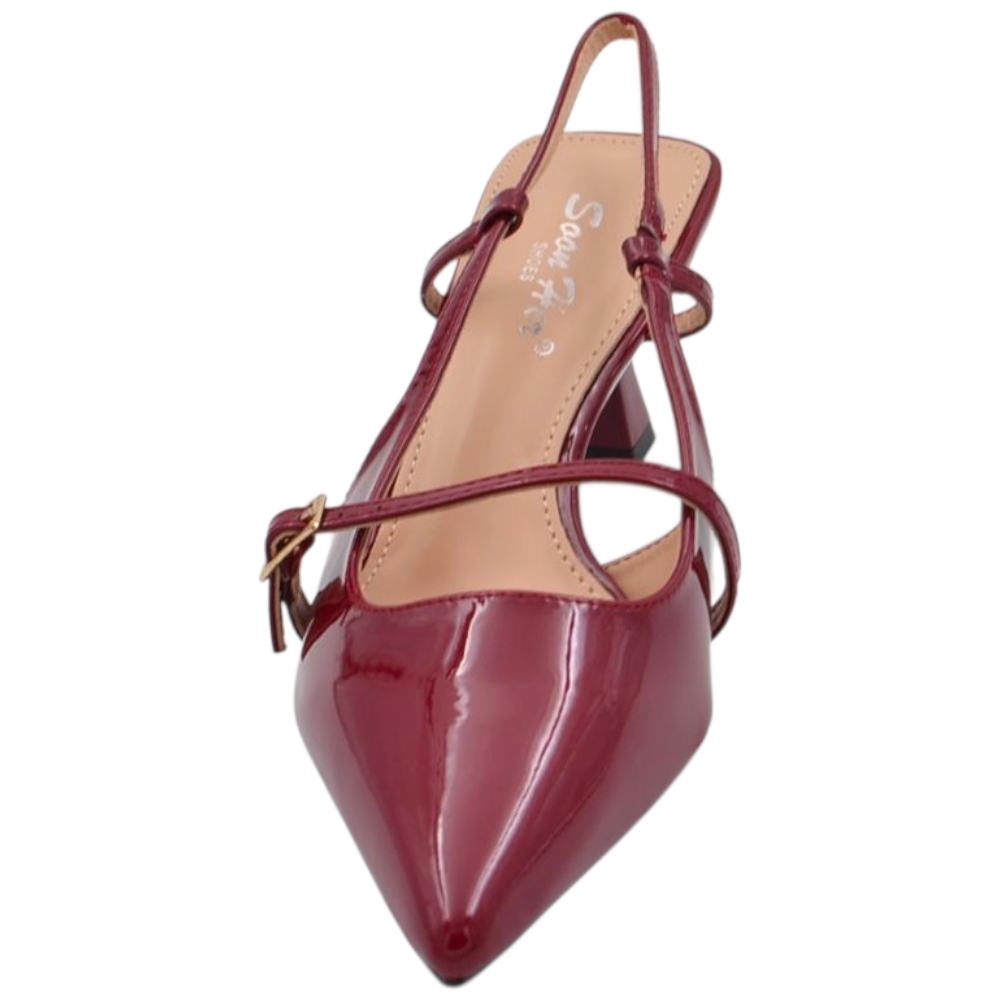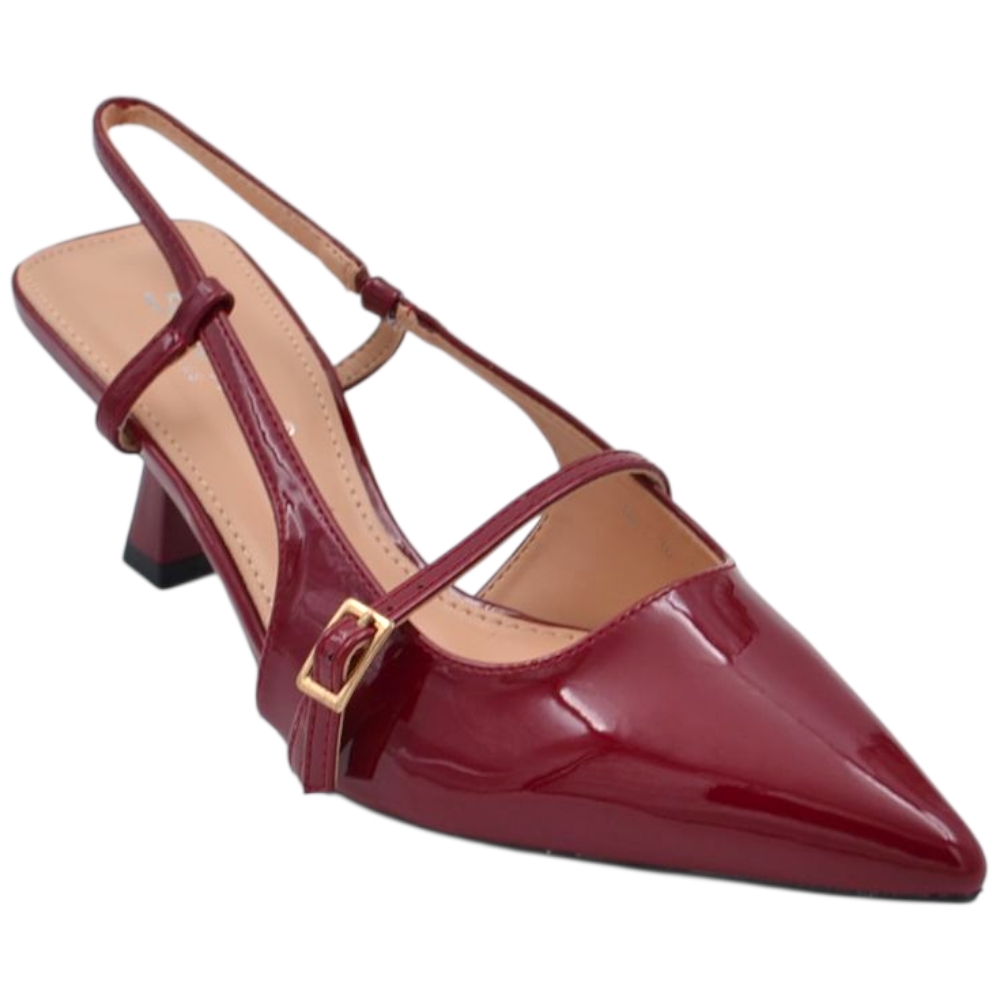 Decollete donna a punta in vernice bordeaux tacco spillo 4 cm con aperture laterali e cinturino alla caviglia regolabile