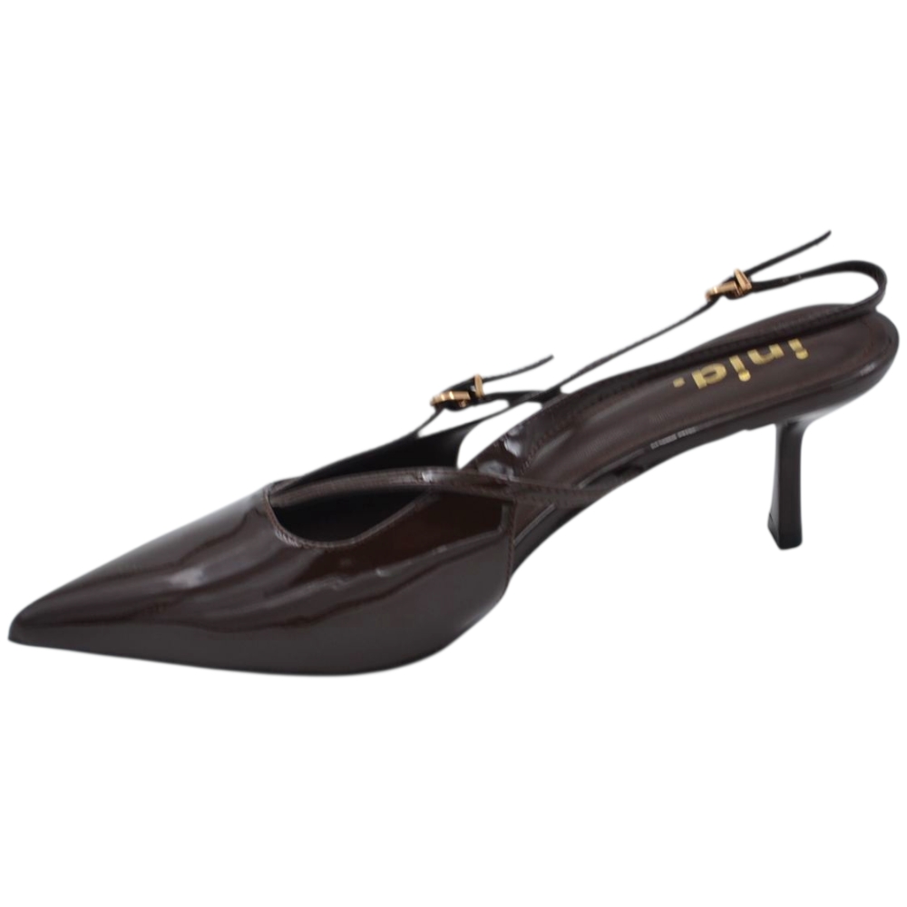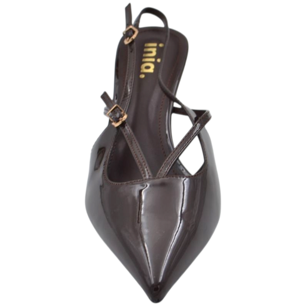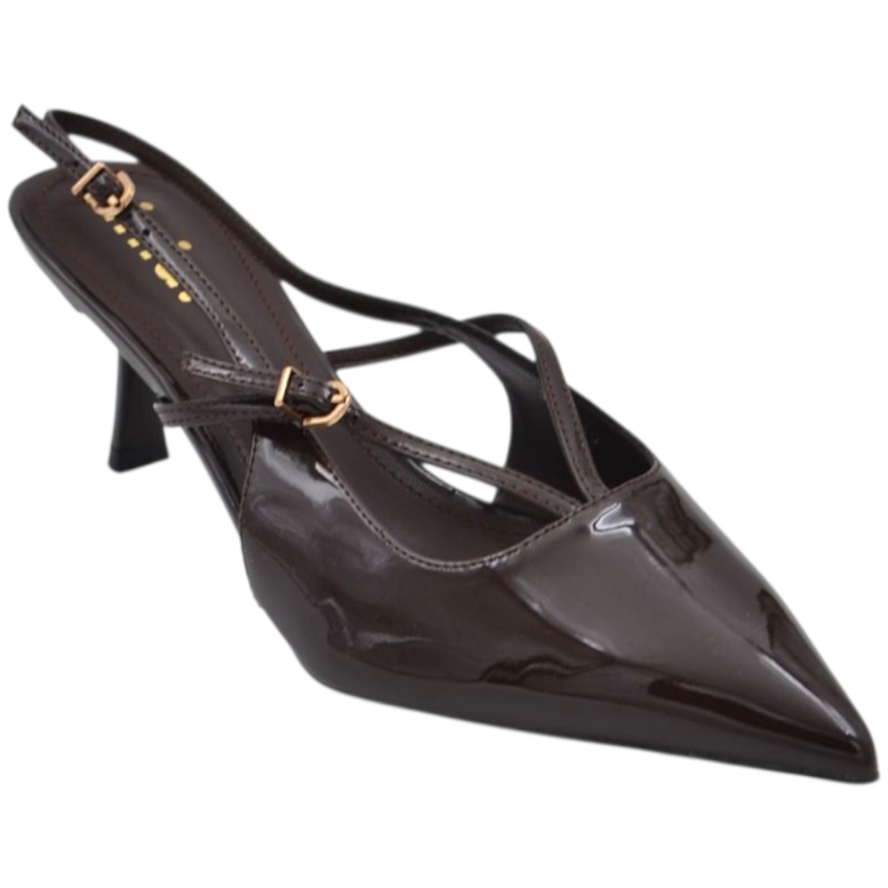 Decollete donna a punta tacco kitten 5 cm in pelle lucida testa di moro marrone slinkback con cinturini a V