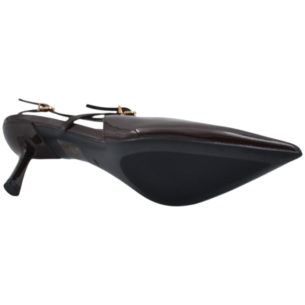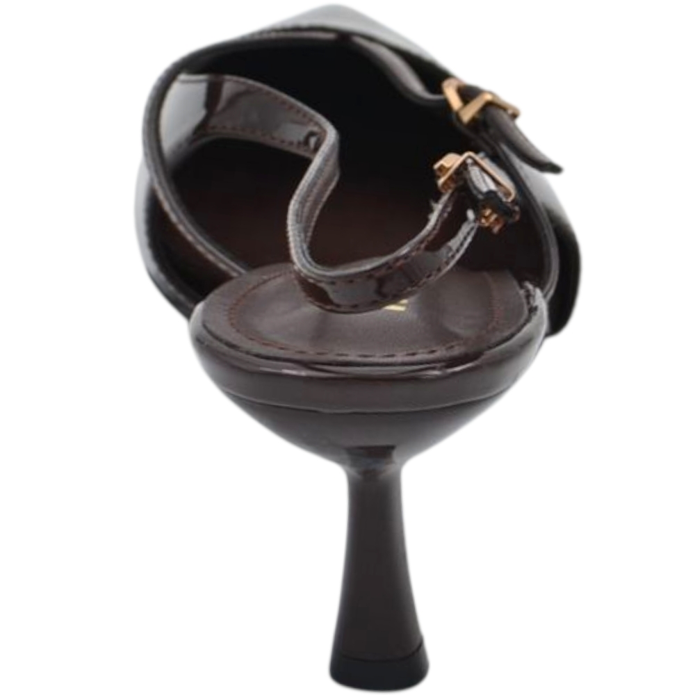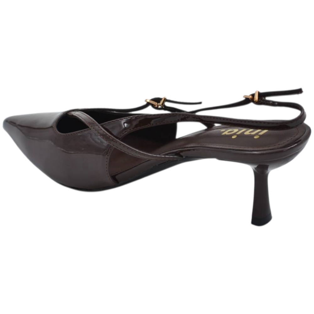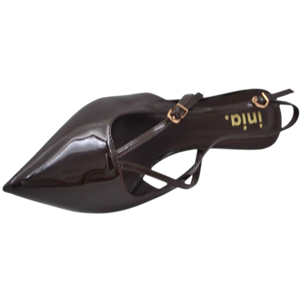 Decollete donna a punta tacco kitten 5 cm in pelle lucida testa di moro marrone slinkback con cinturini a V
