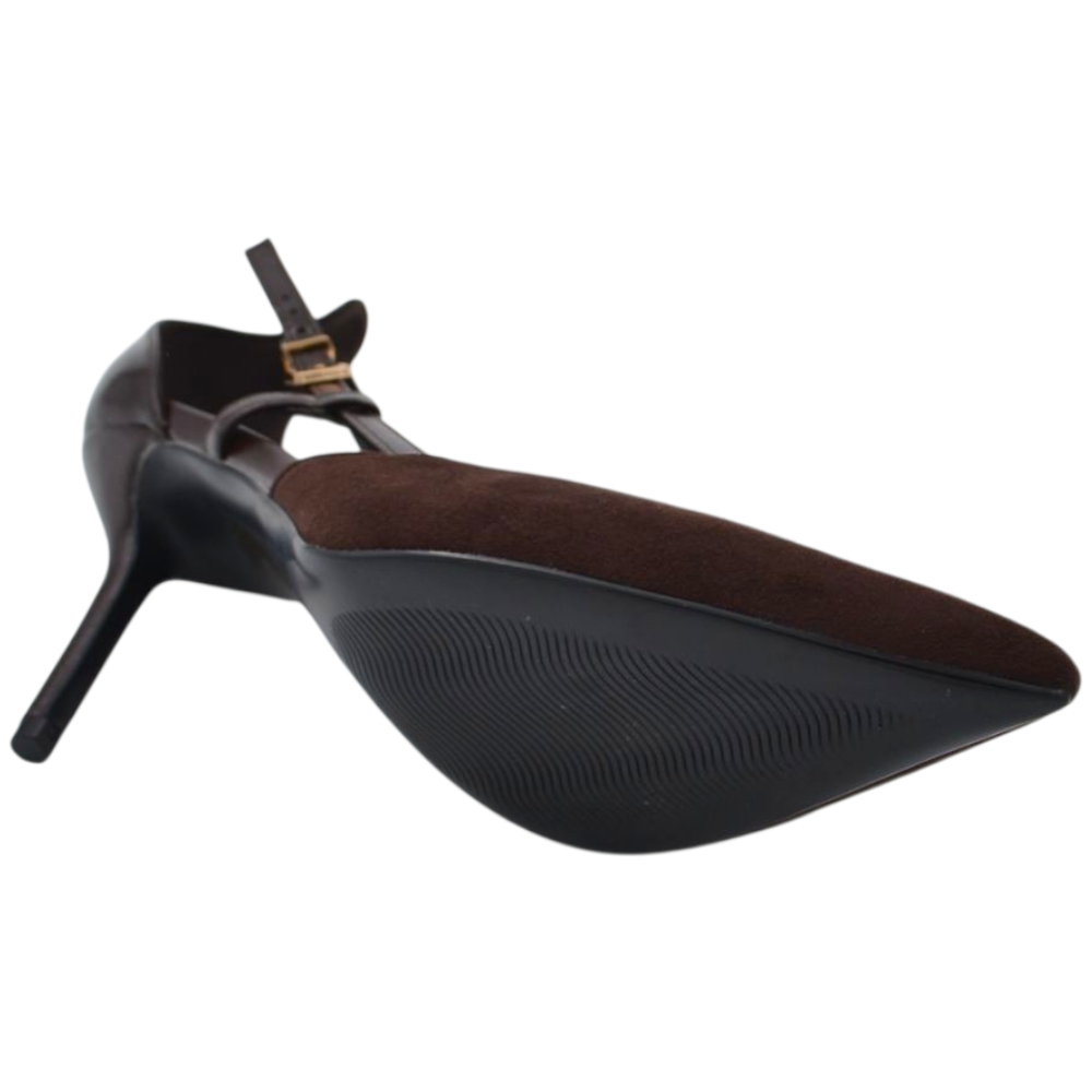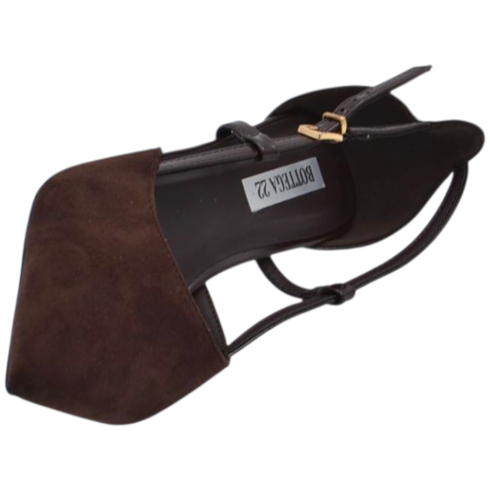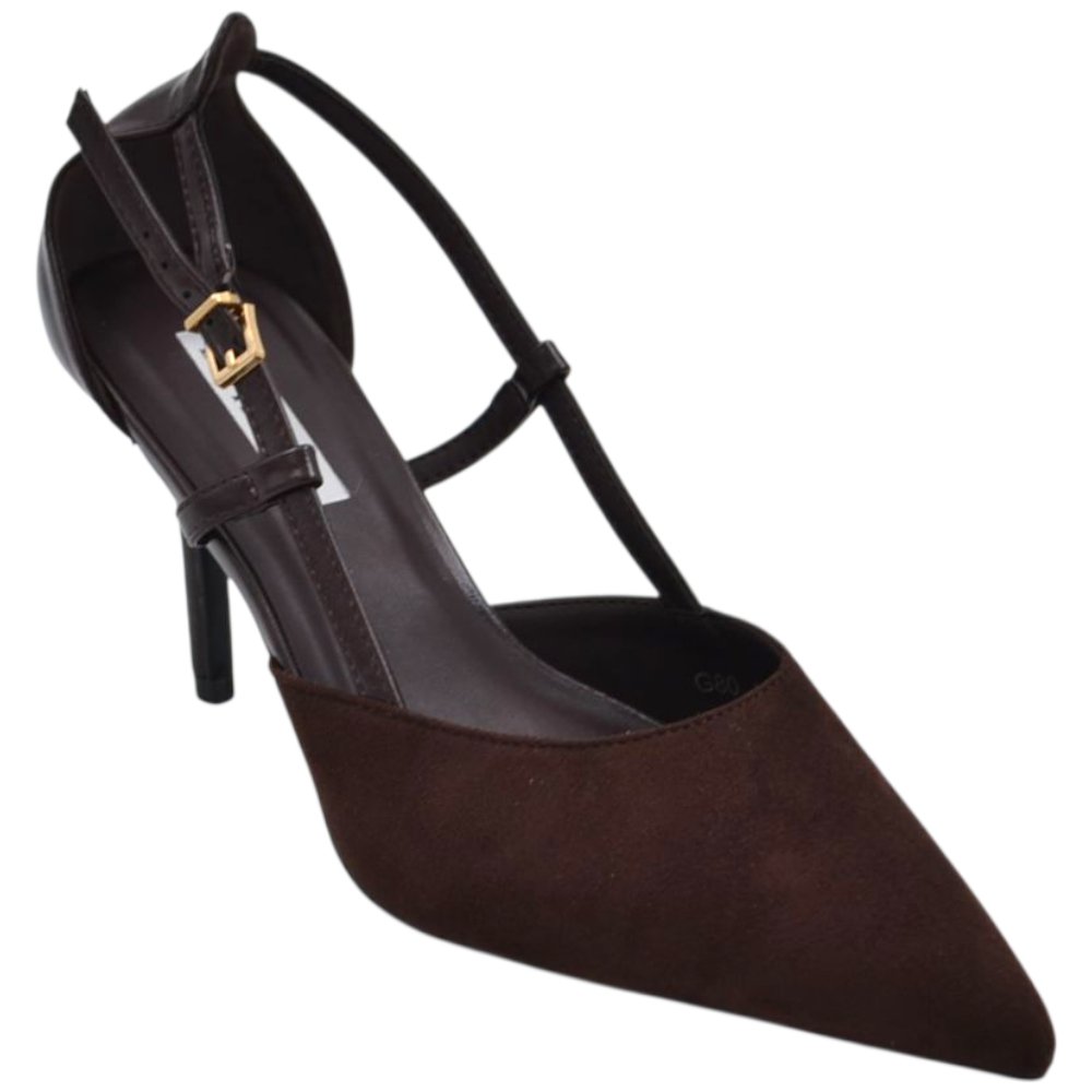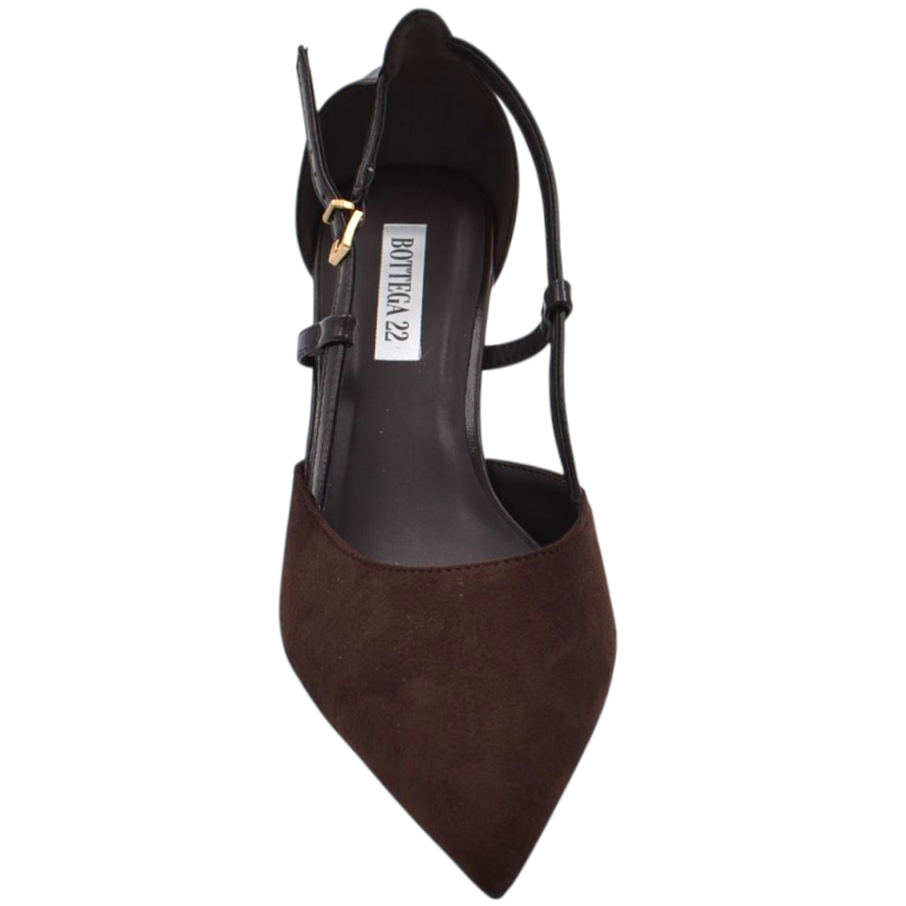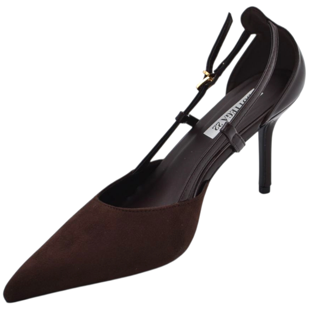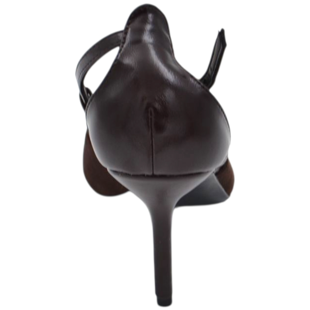 Decollete donna a punta in camoscio e pelle marrone con tacco a spillo 10 con aperture laterali e cinturino regolabile