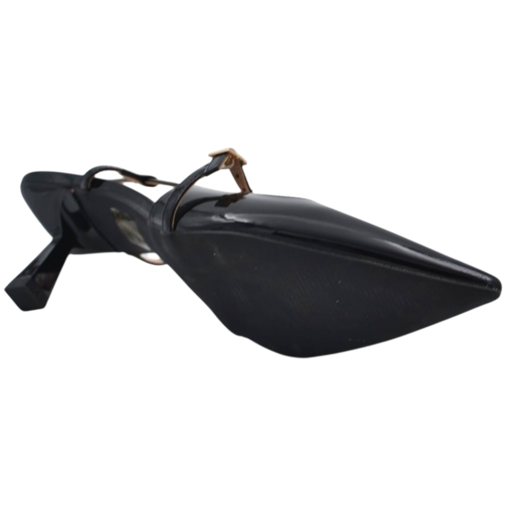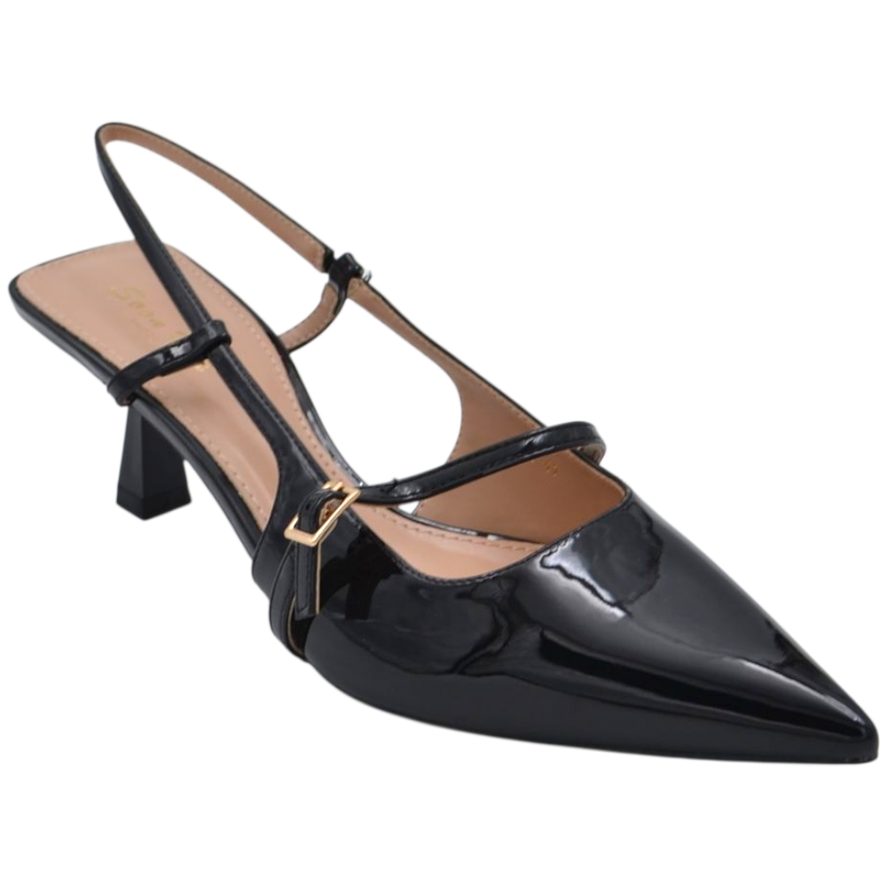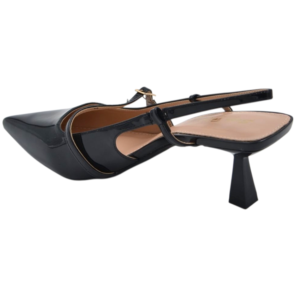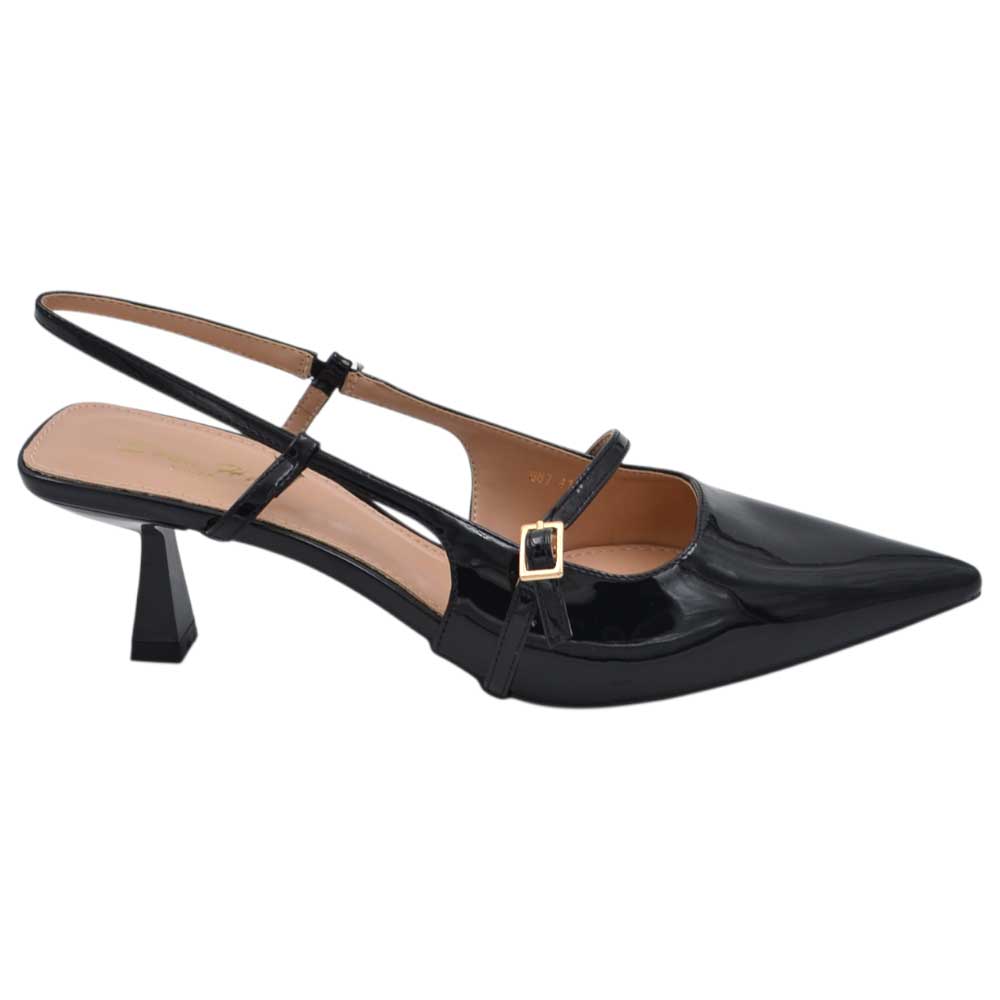 Decollete donna a punta in vernice nera con tacco spillo 4 cm con aperture laterali e cinturino alla caviglia regolabile