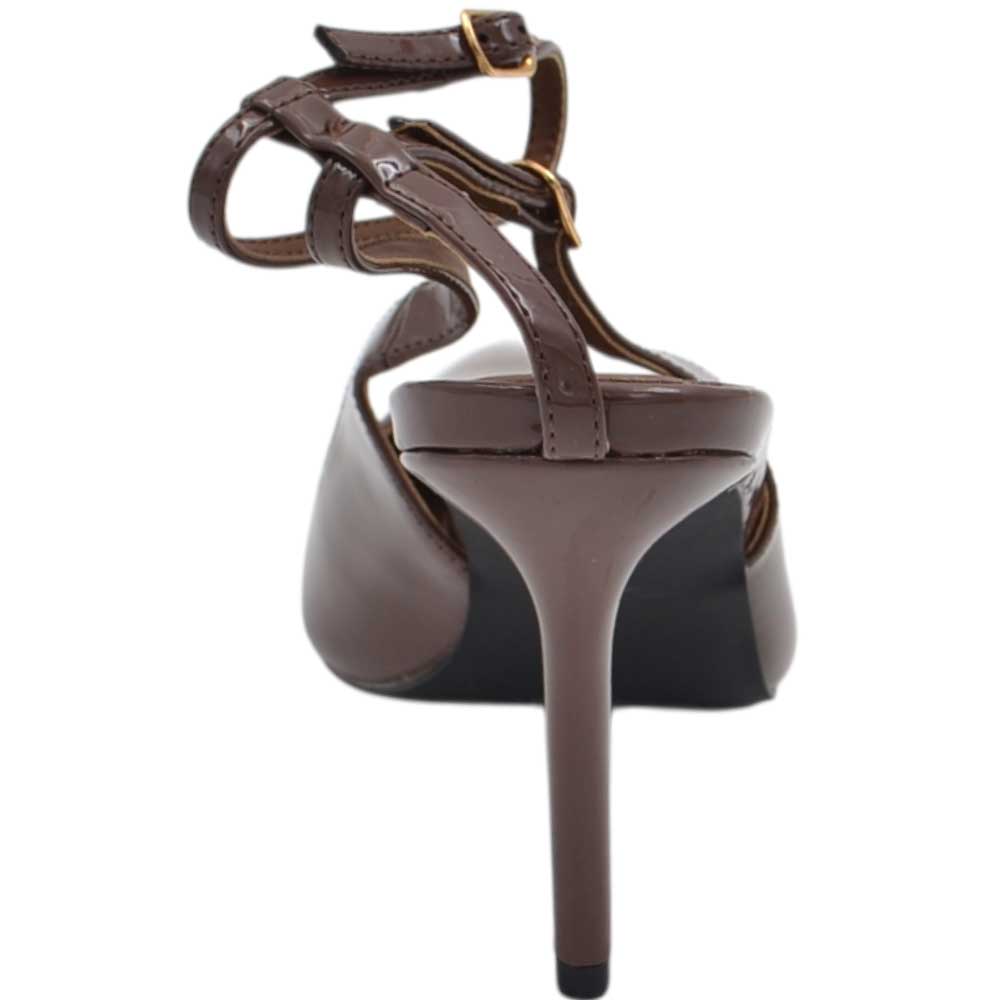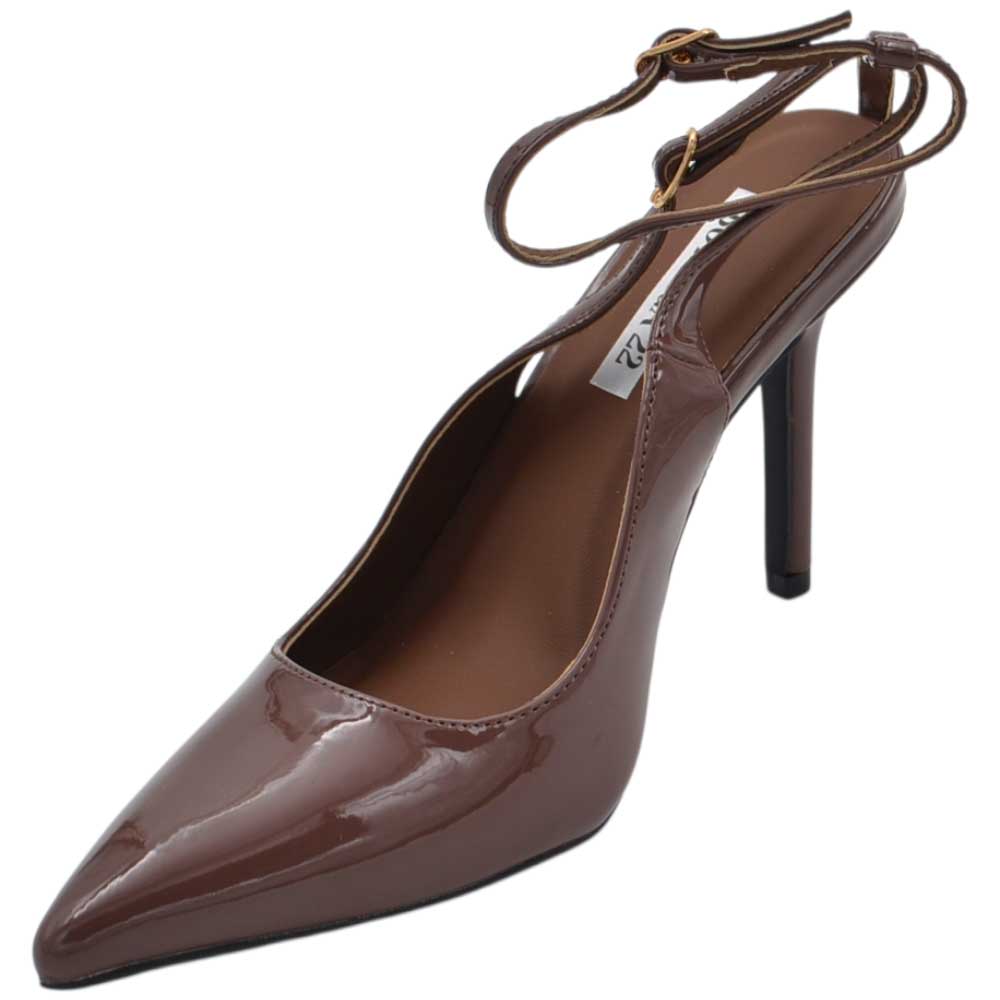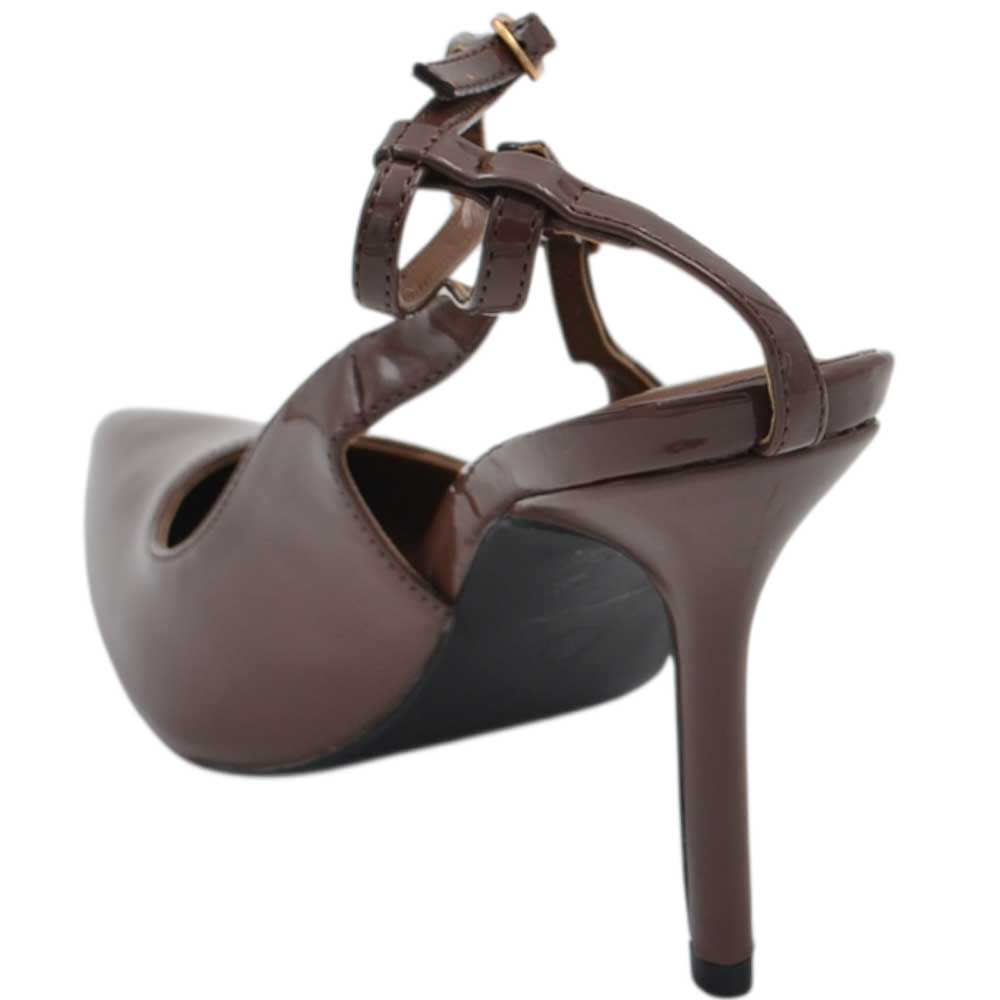 Decollete donna a punta slingback in vernice marrone con gancio oro tacco a spillo 12 chiusura alla caviglia regolabile