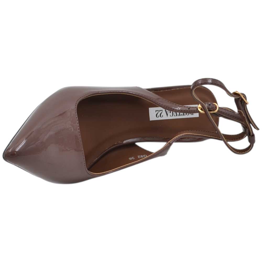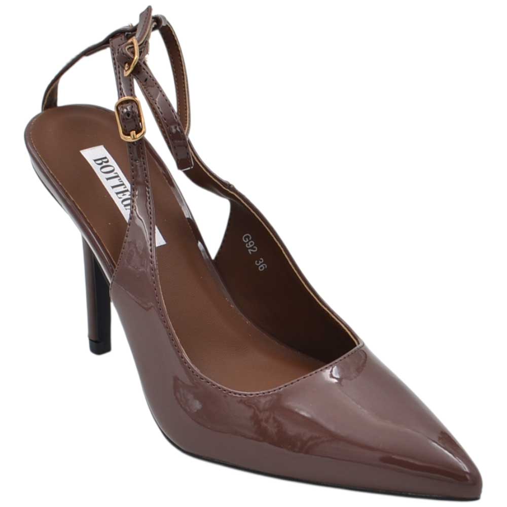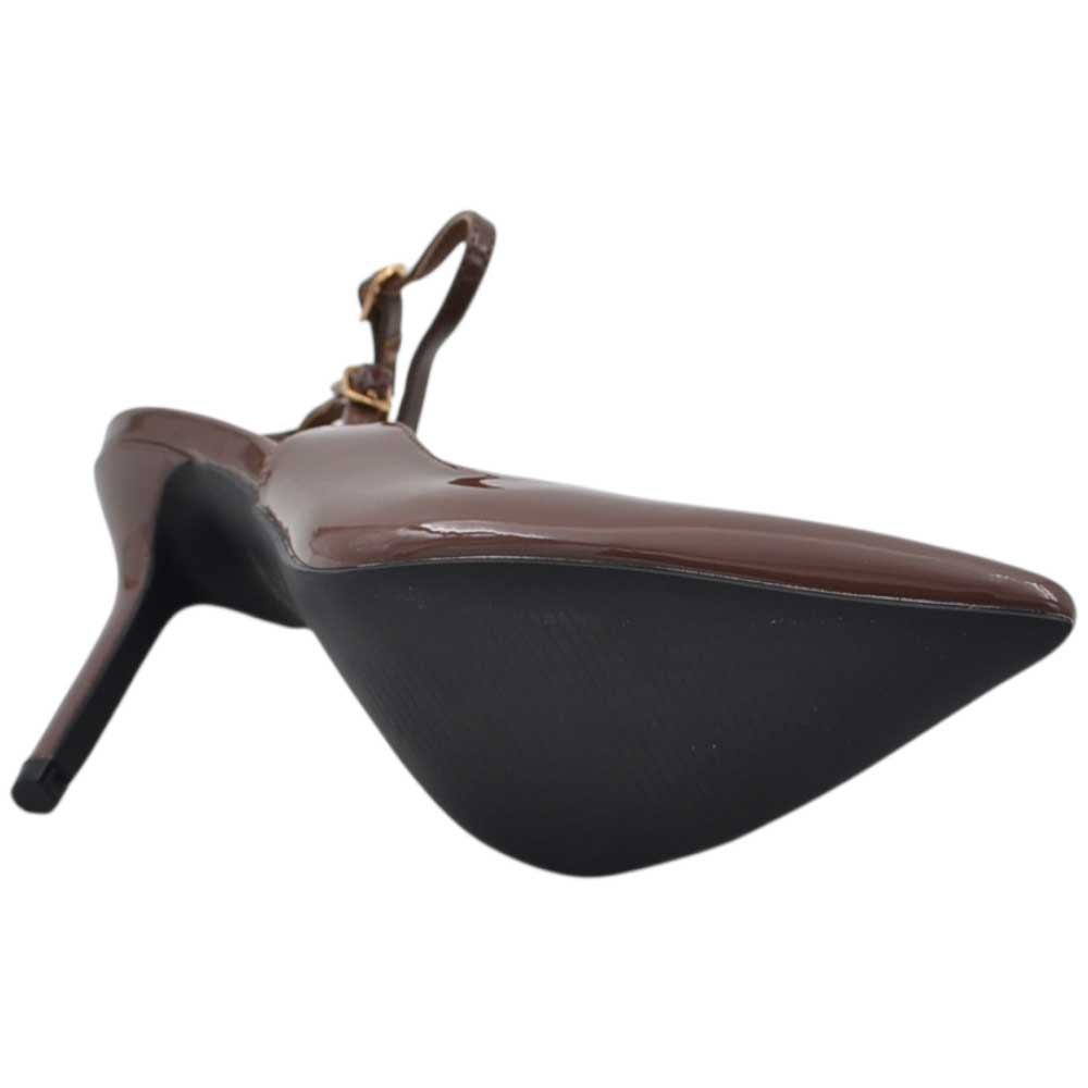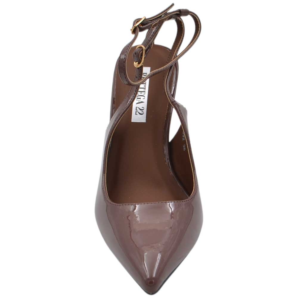 Decollete donna a punta slingback in vernice marrone con gancio oro tacco a spillo 12 chiusura alla caviglia regolabile