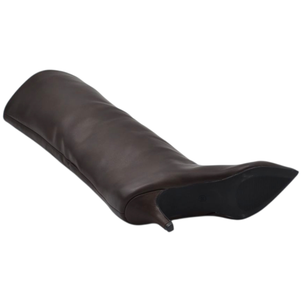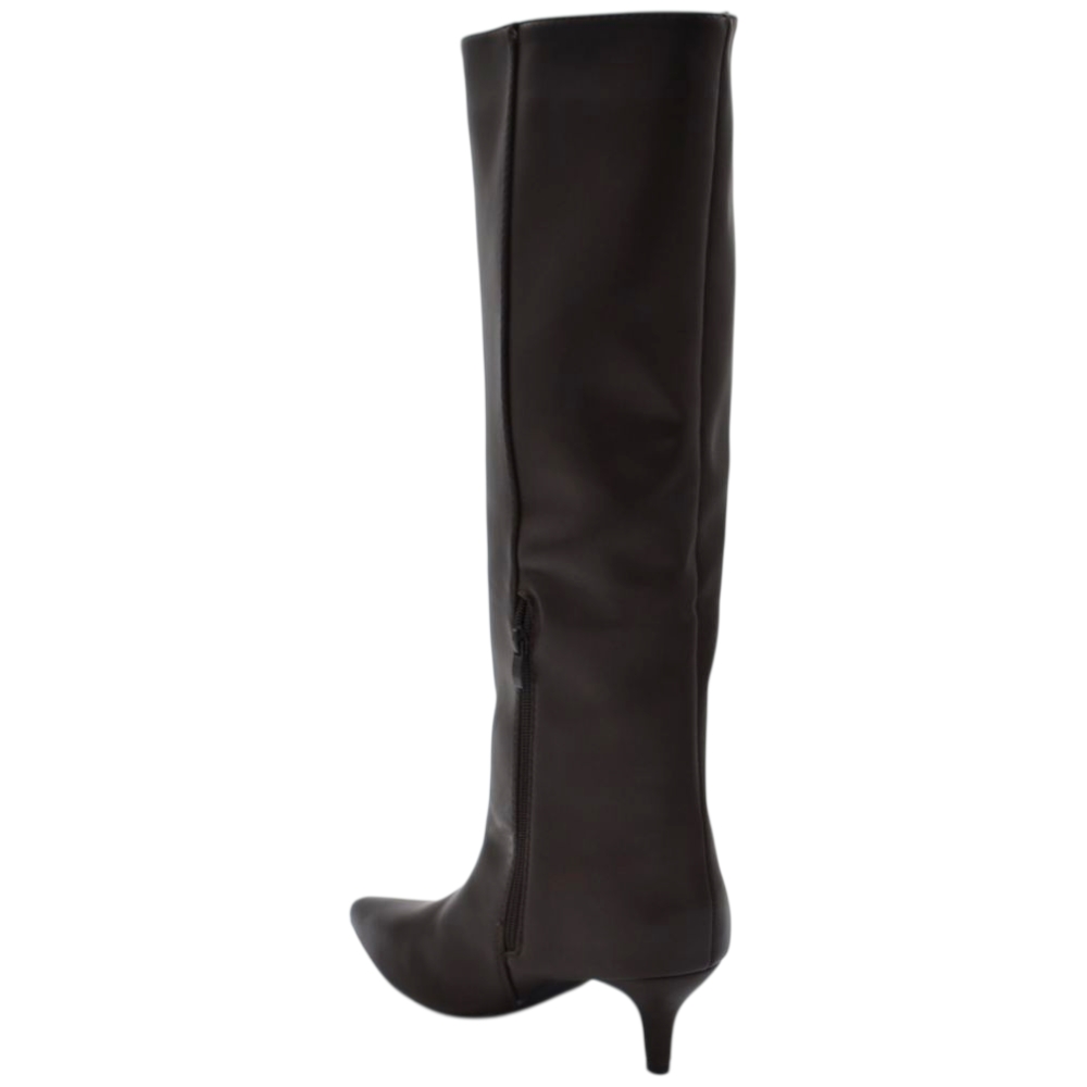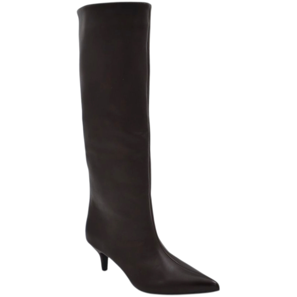 Stivali alti donna al ginocchio in pelle marrone a punta tacco a spillo 4 cm zip lunga aderente moda linea Basic