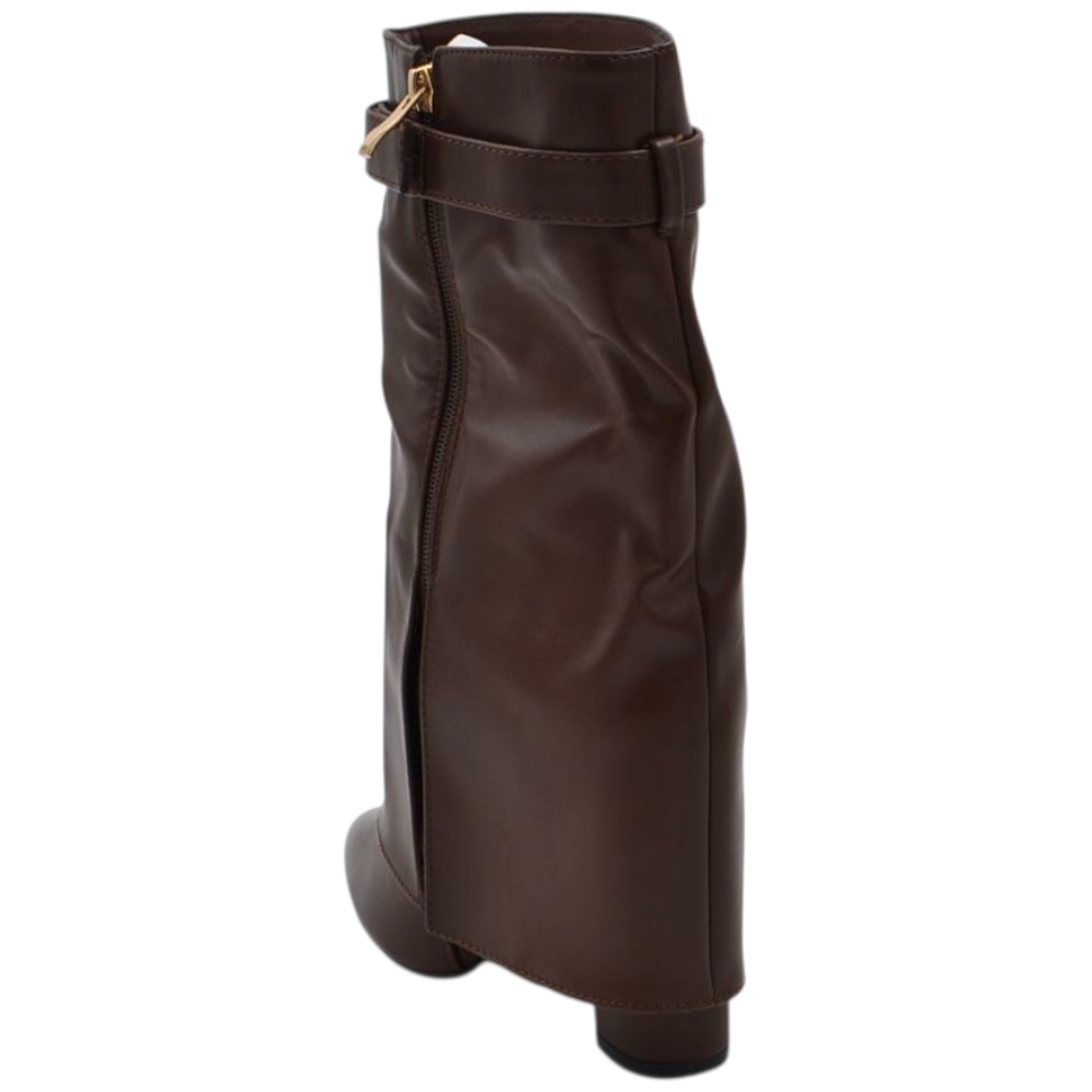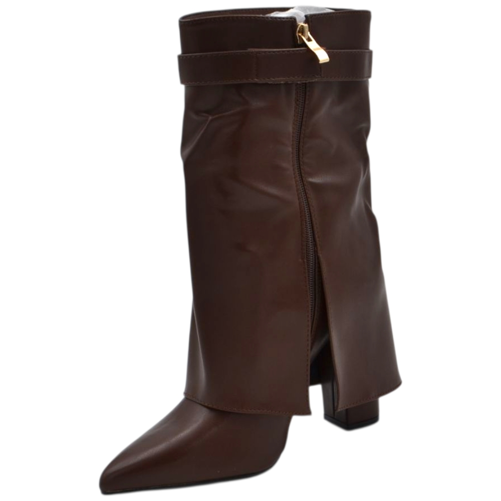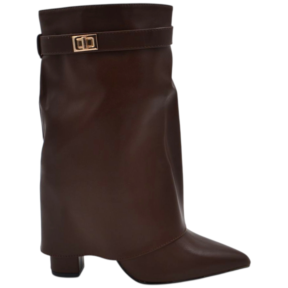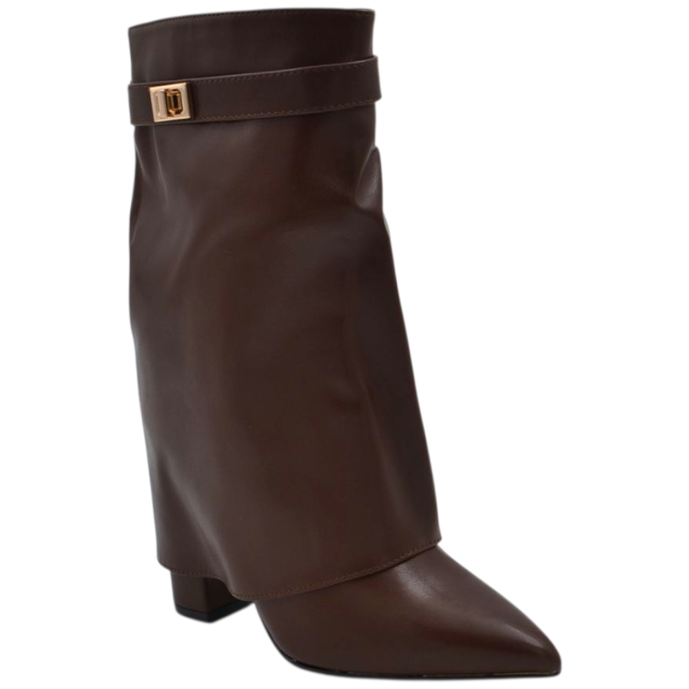 Stivaletto donna tronchetto meta' polpaccio shark a punta in pelle marrone risvolto gancio oro tacco largo 10 zip