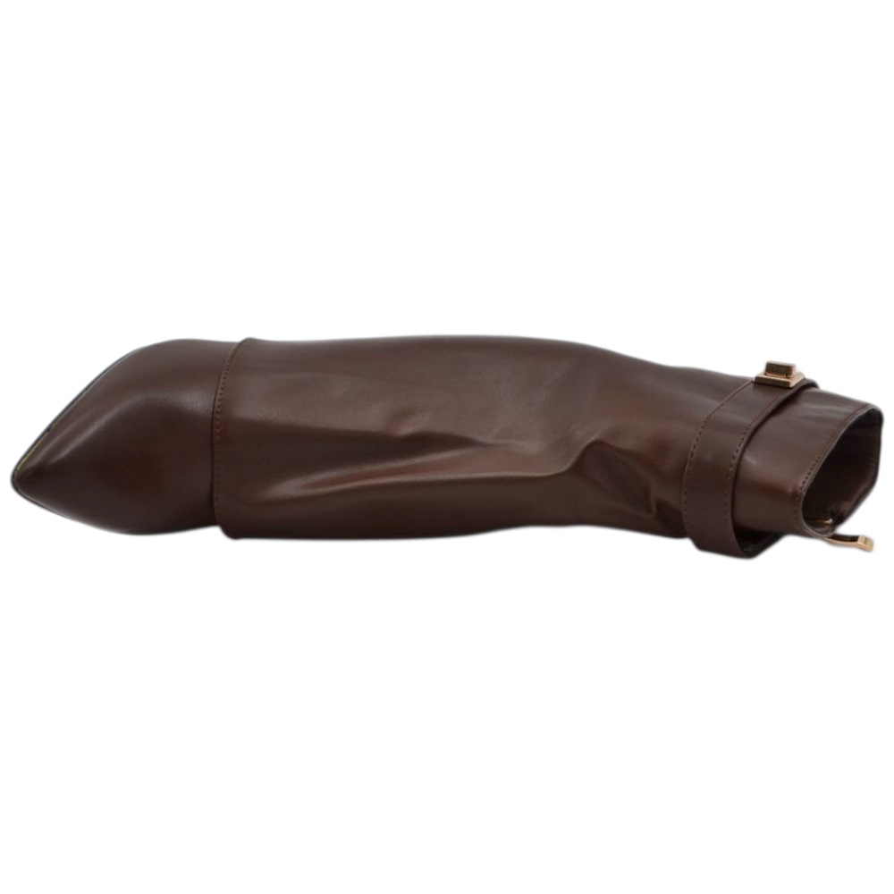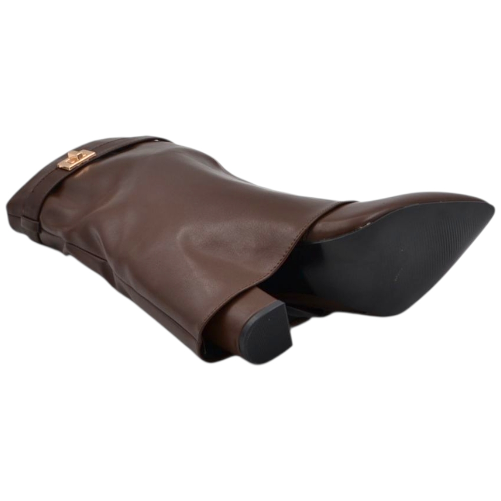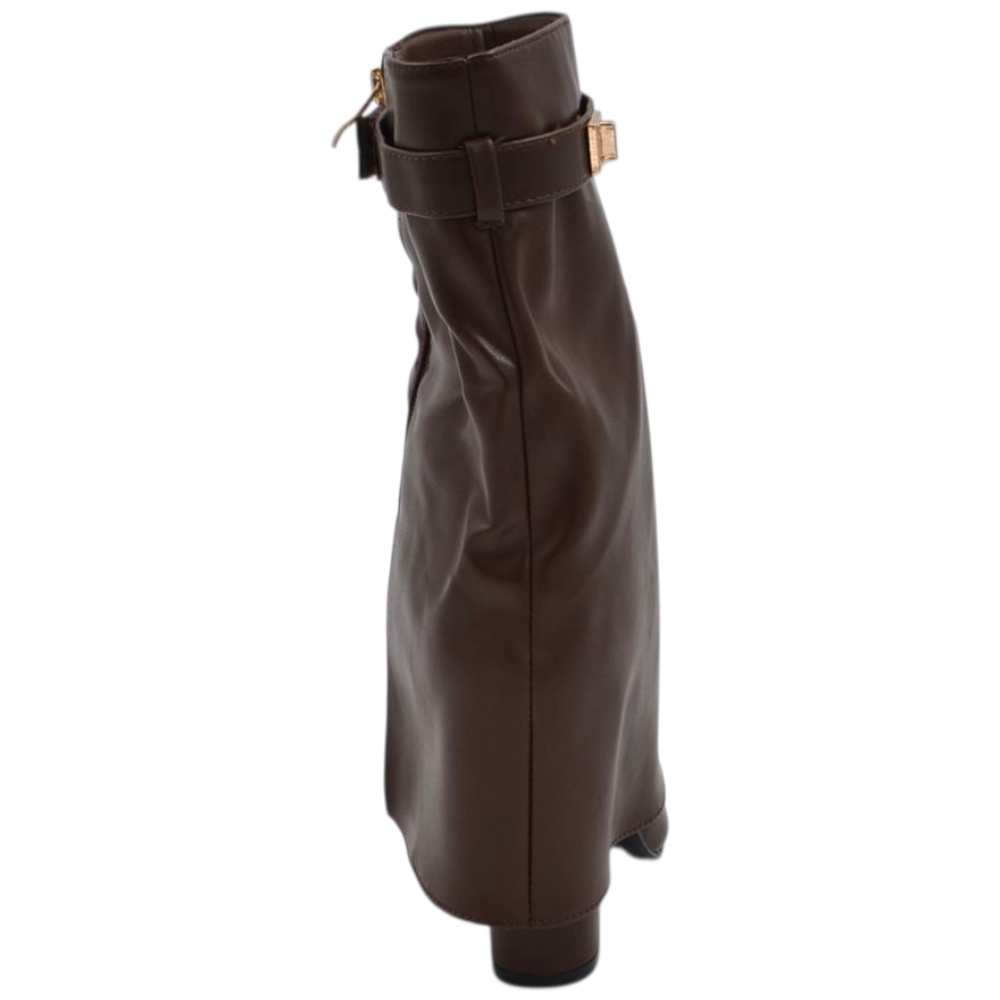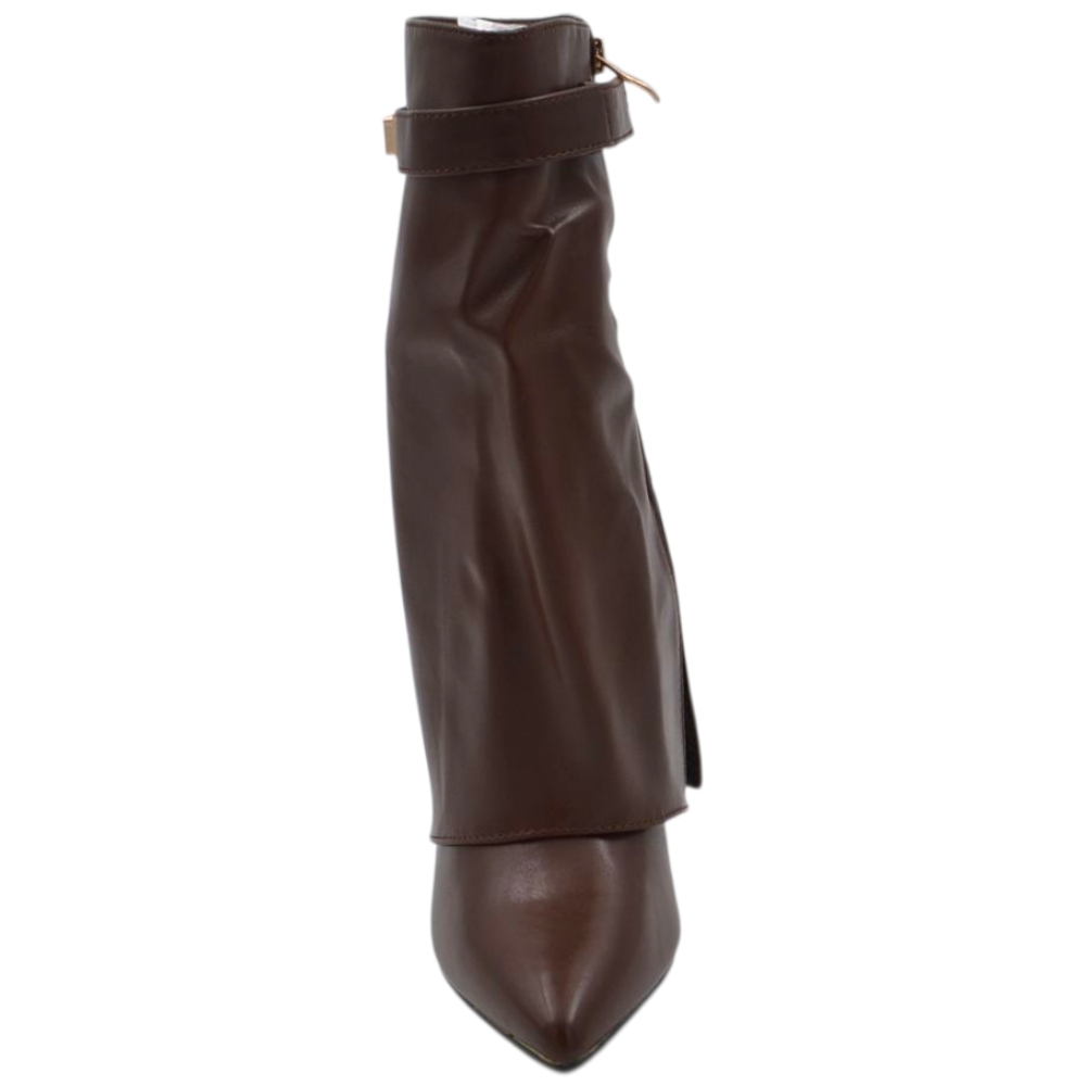 Stivaletto donna tronchetto meta' polpaccio shark a punta in pelle marrone risvolto gancio oro tacco largo 10 zip