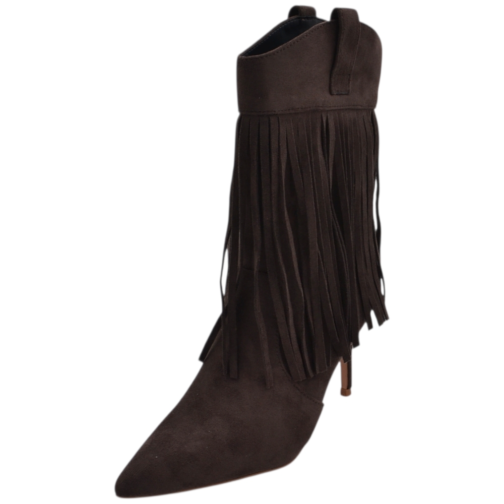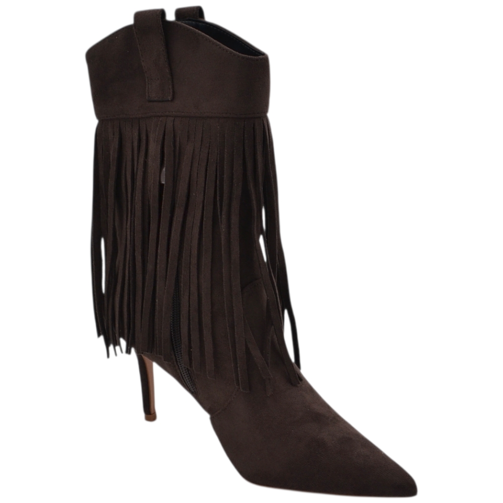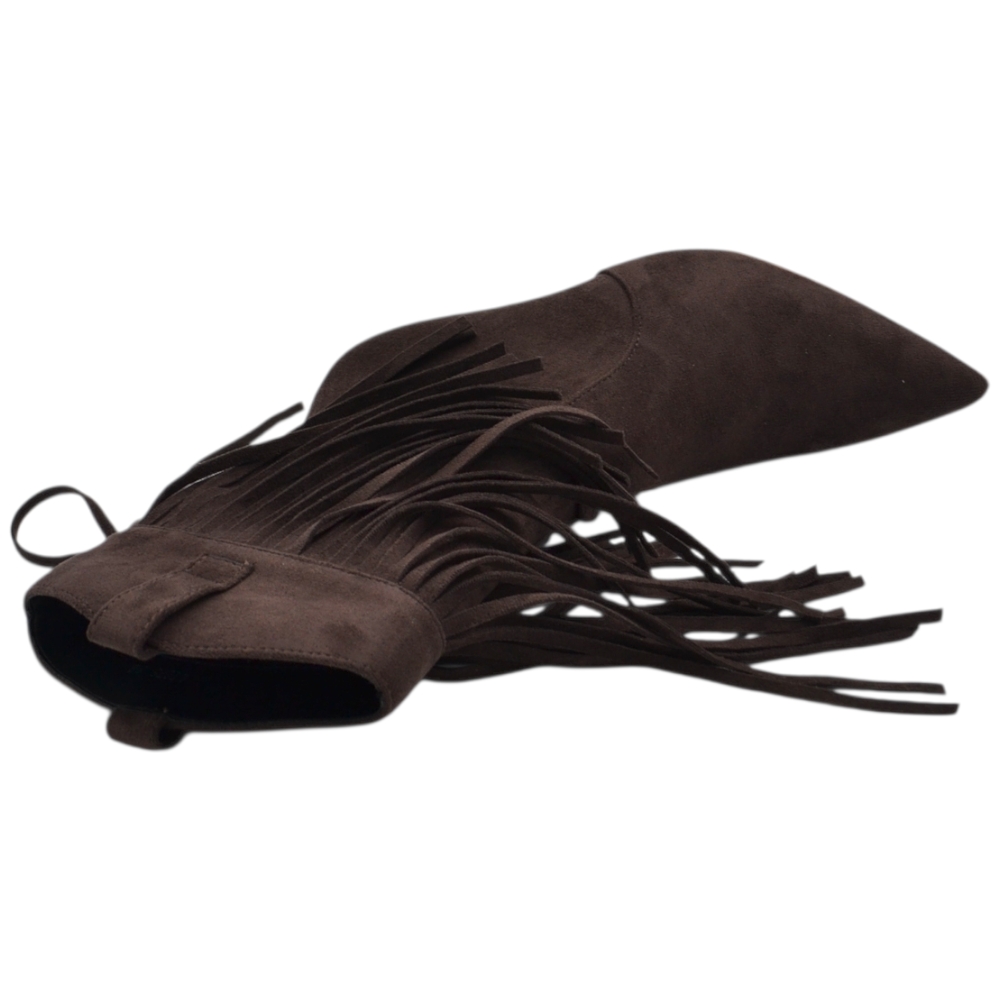 Stivaletto tronchetto donna meta' polpaccio a punta con frange camoscio marrone tacco a spillo 10 zip