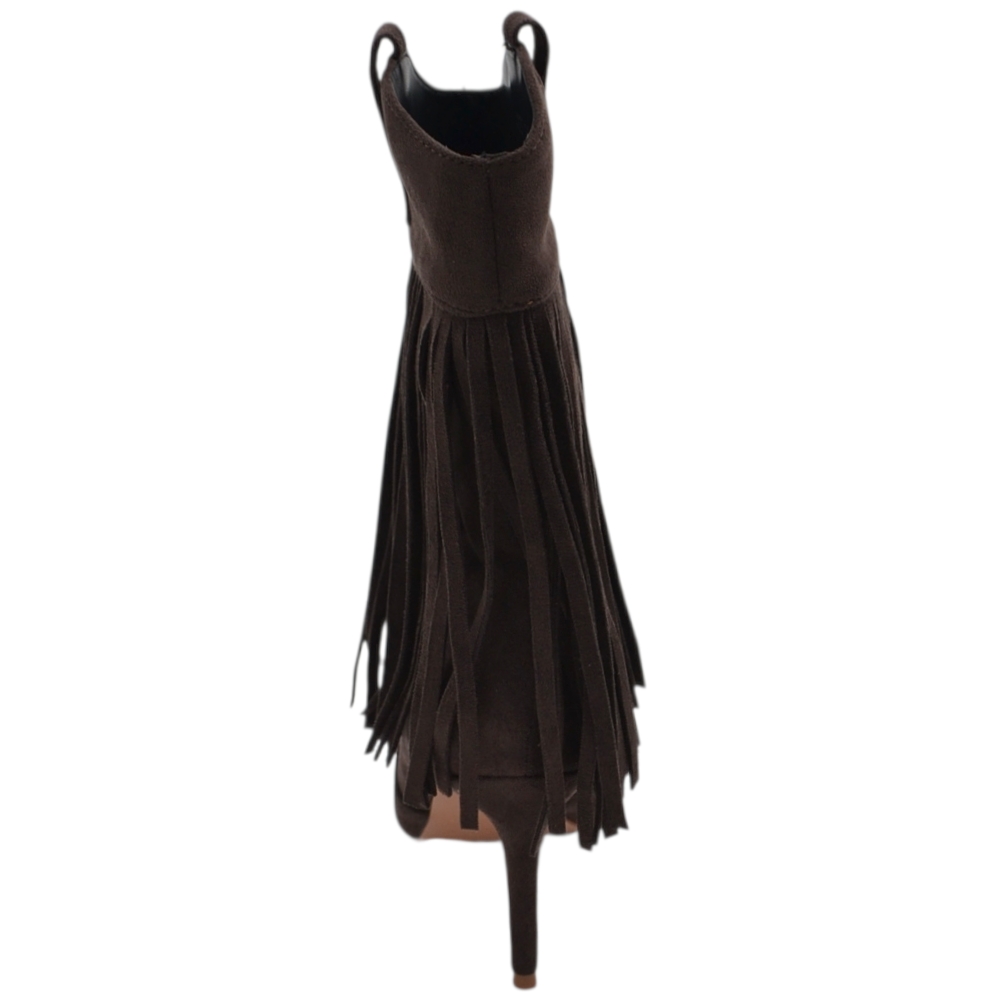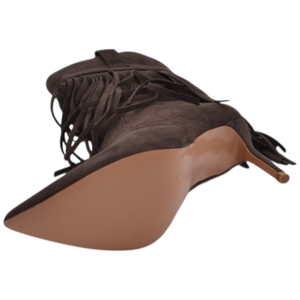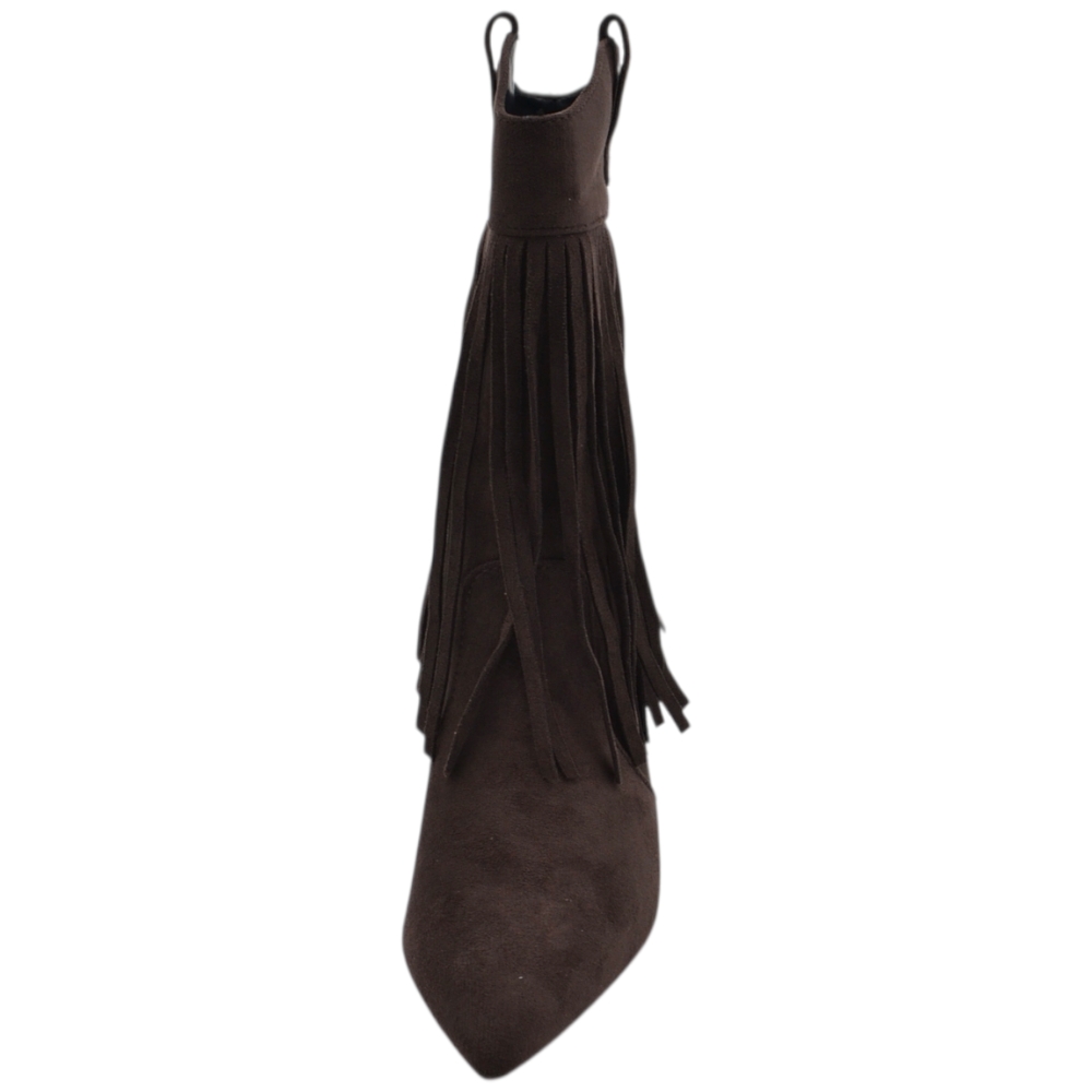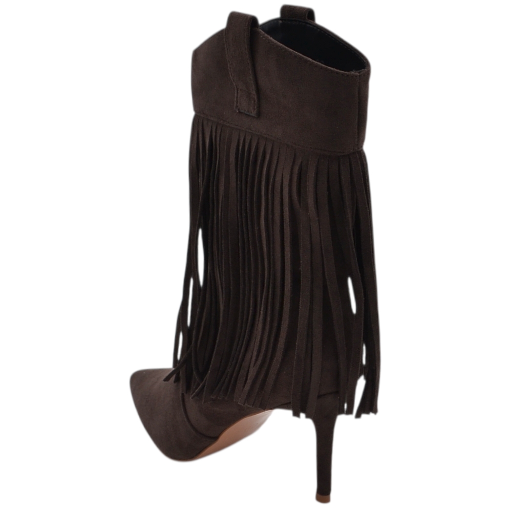 Stivaletto tronchetto donna meta' polpaccio a punta con frange camoscio marrone tacco a spillo 10 zip