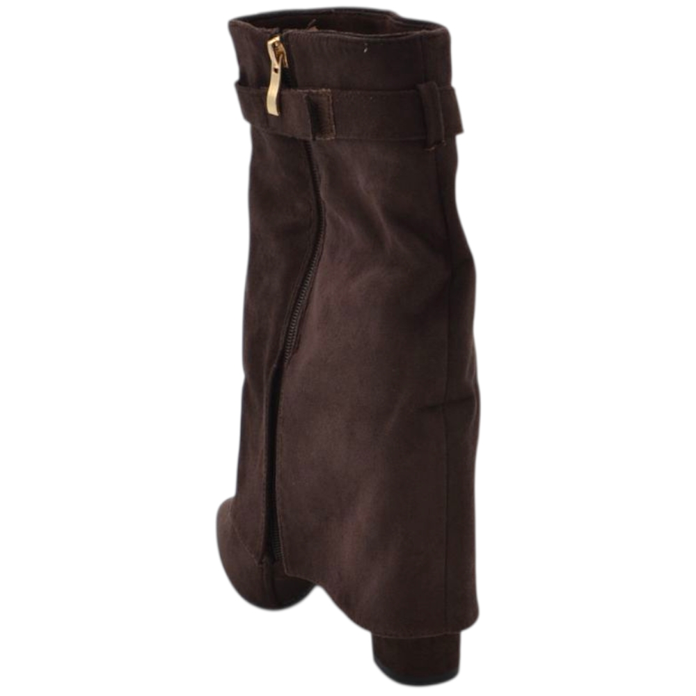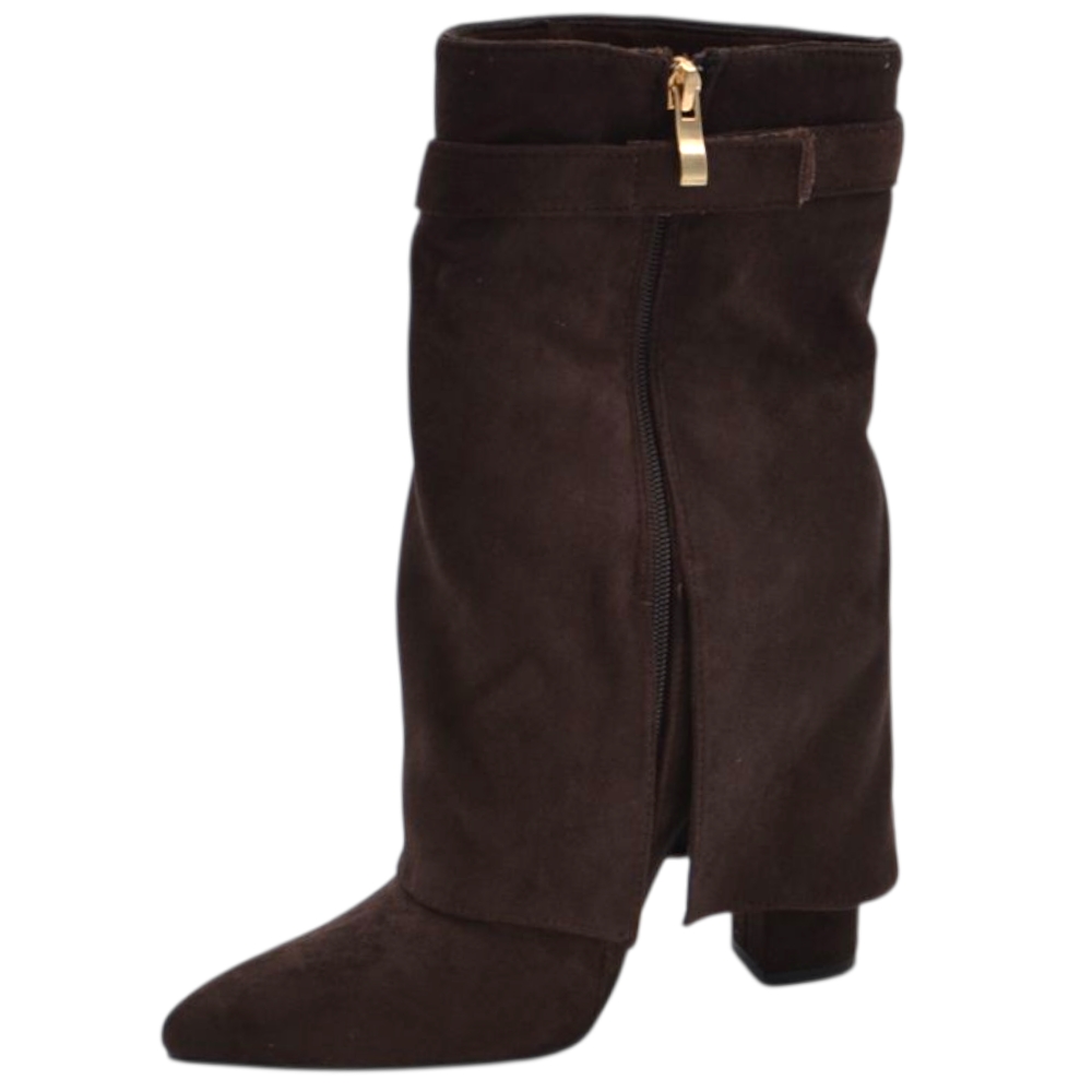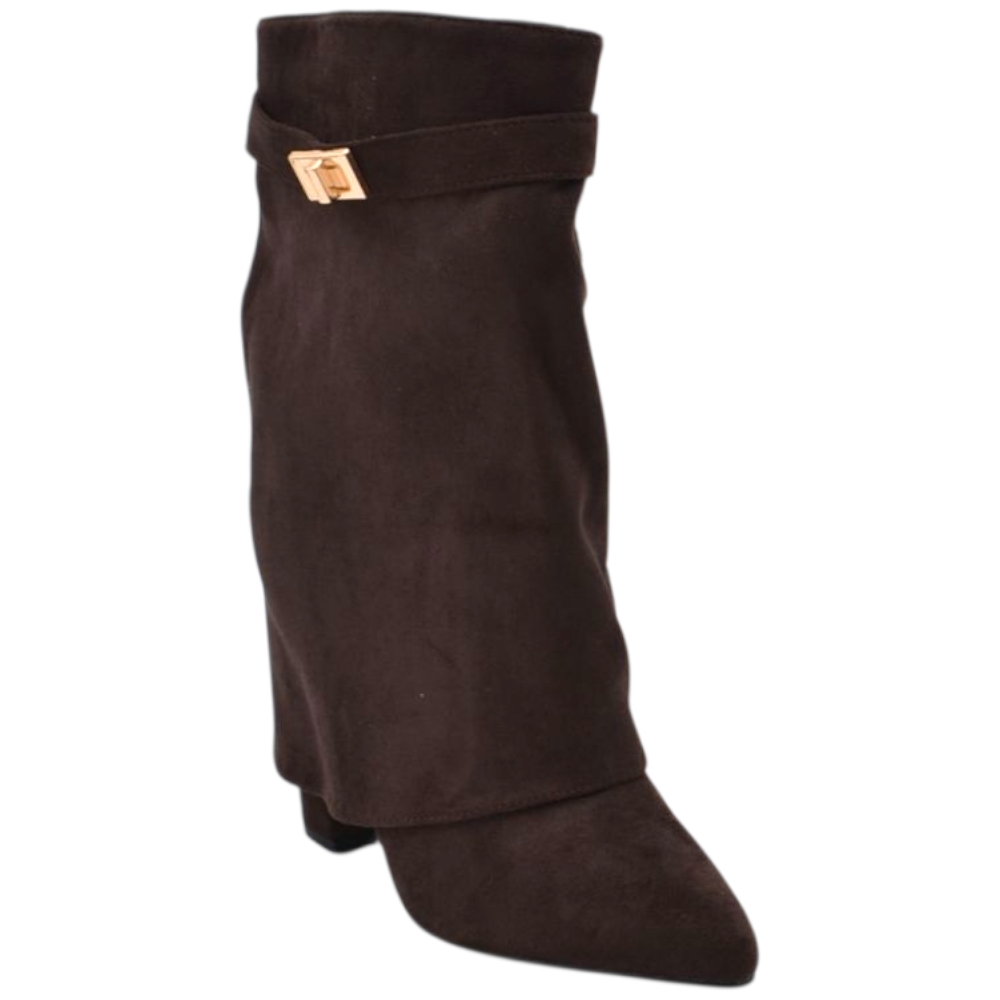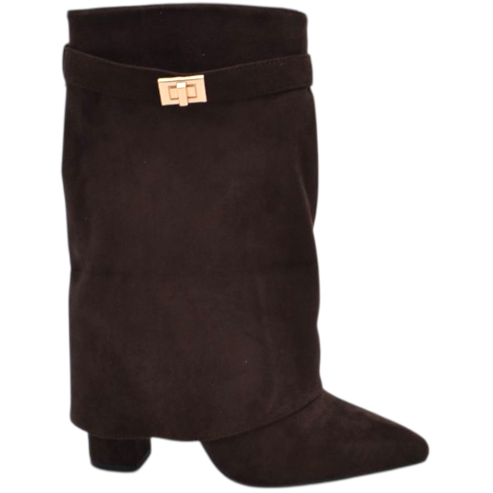 Stivaletto donna tronchetto meta' polpaccio shark a punta in camoscio marrone risvolto gancio oro tacco largo 10 zip