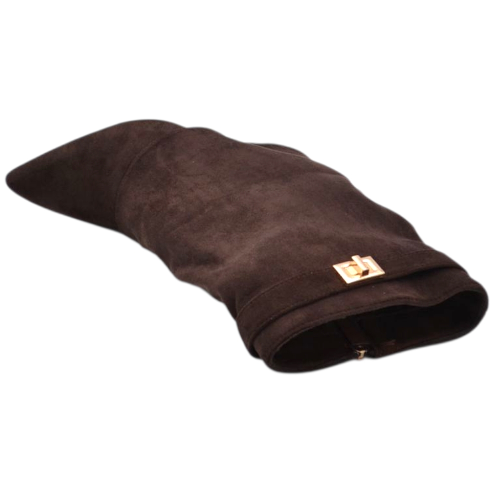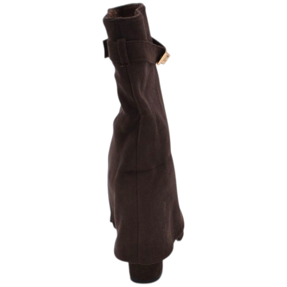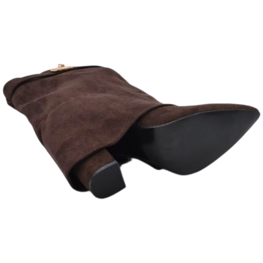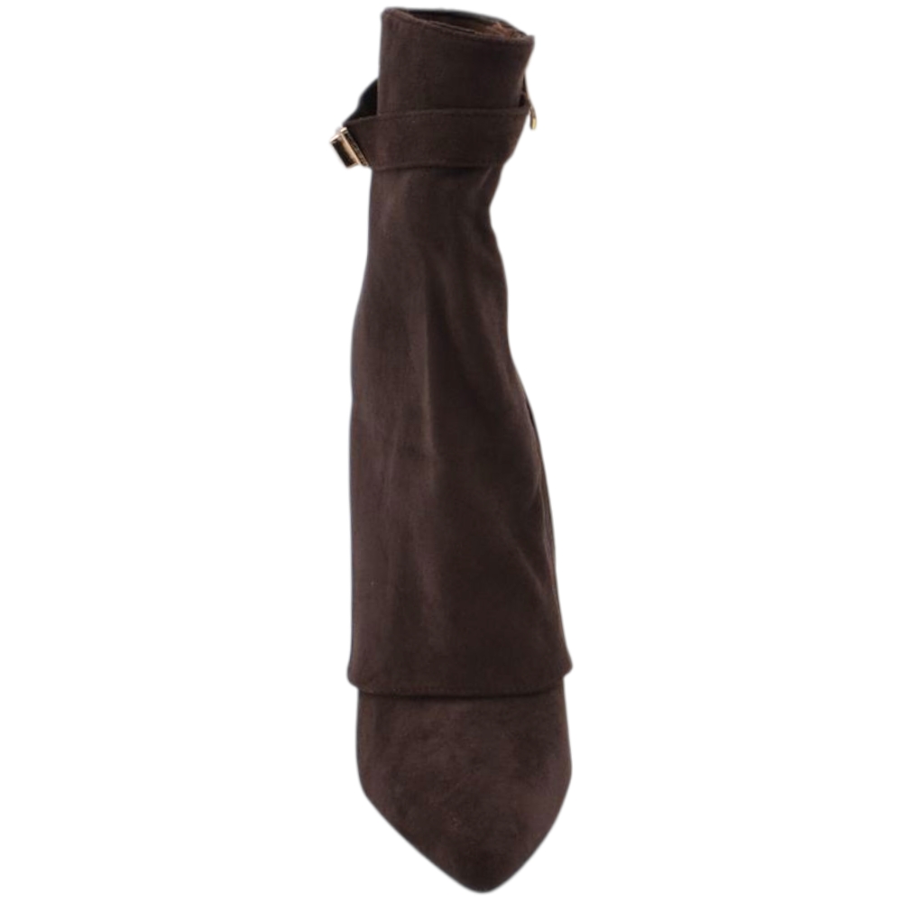 Stivaletto donna tronchetto meta' polpaccio shark a punta in camoscio marrone risvolto gancio oro tacco largo 10 zip