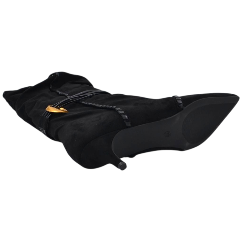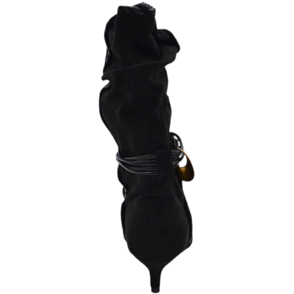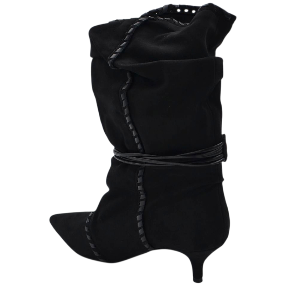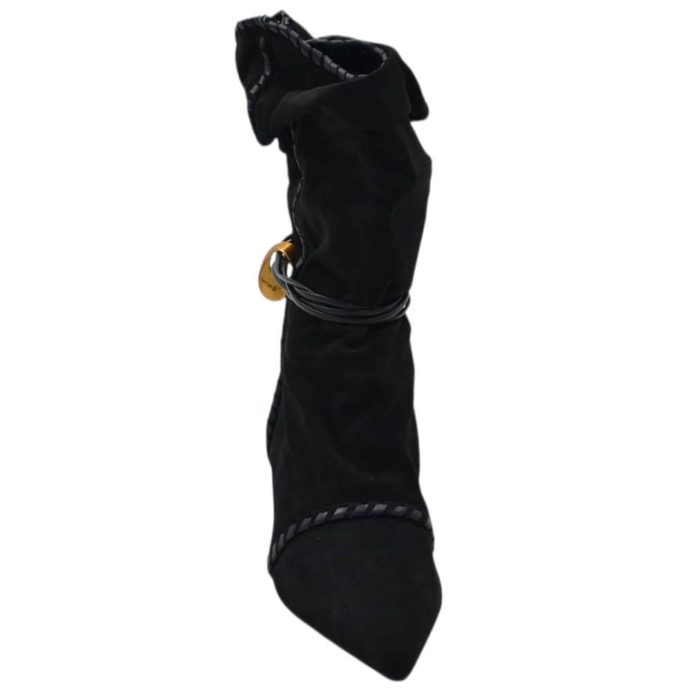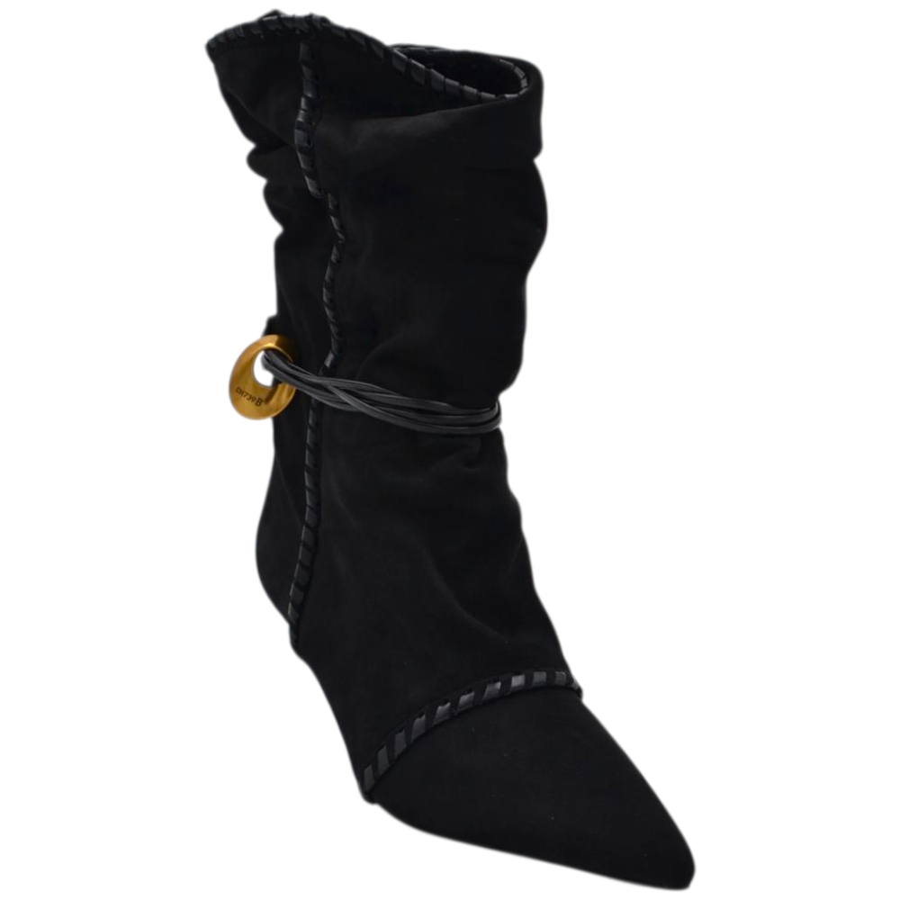 Stivaletto tronchetto donna a punta arricciato camoscio nero con coulisse oro removibile tacco kitten 3 cm