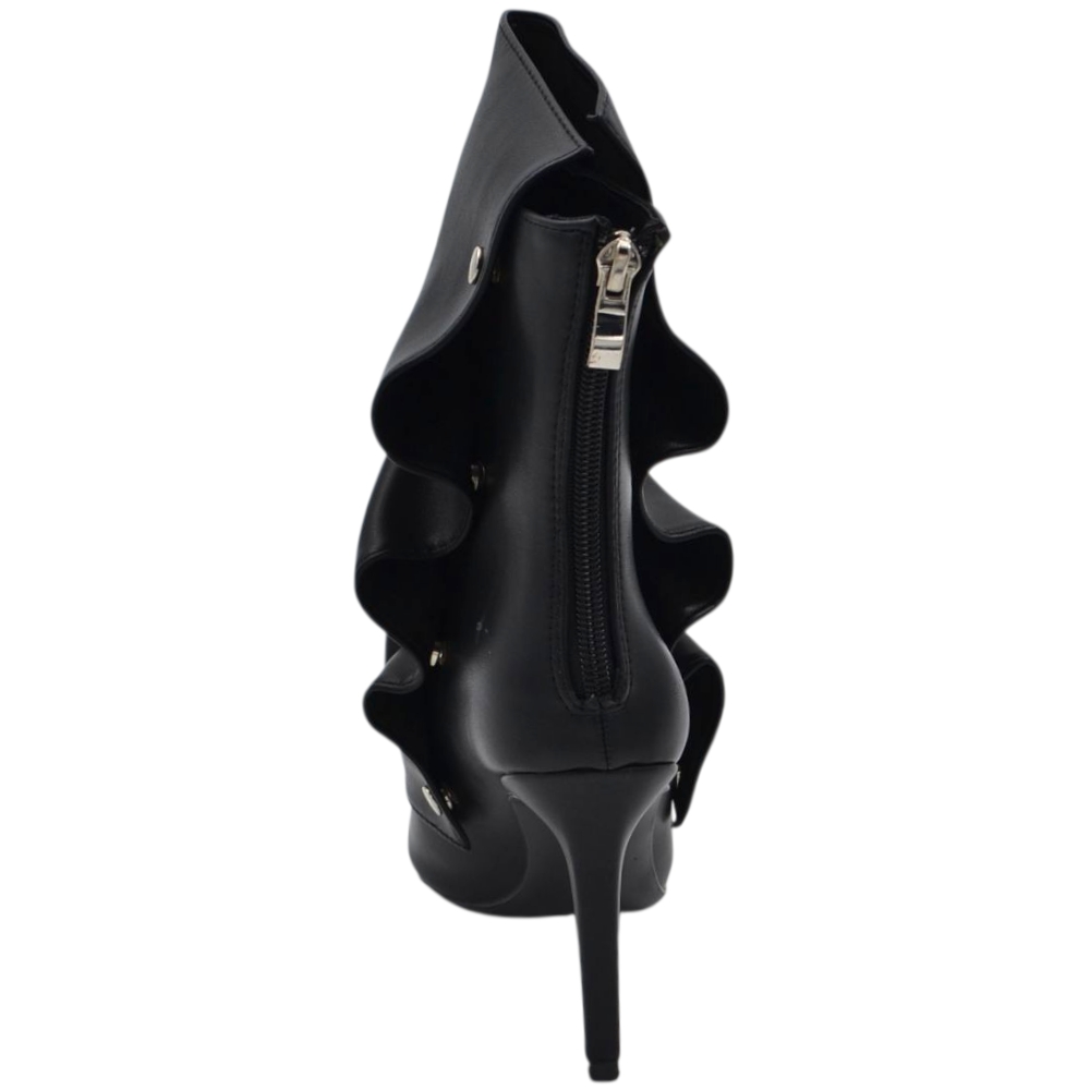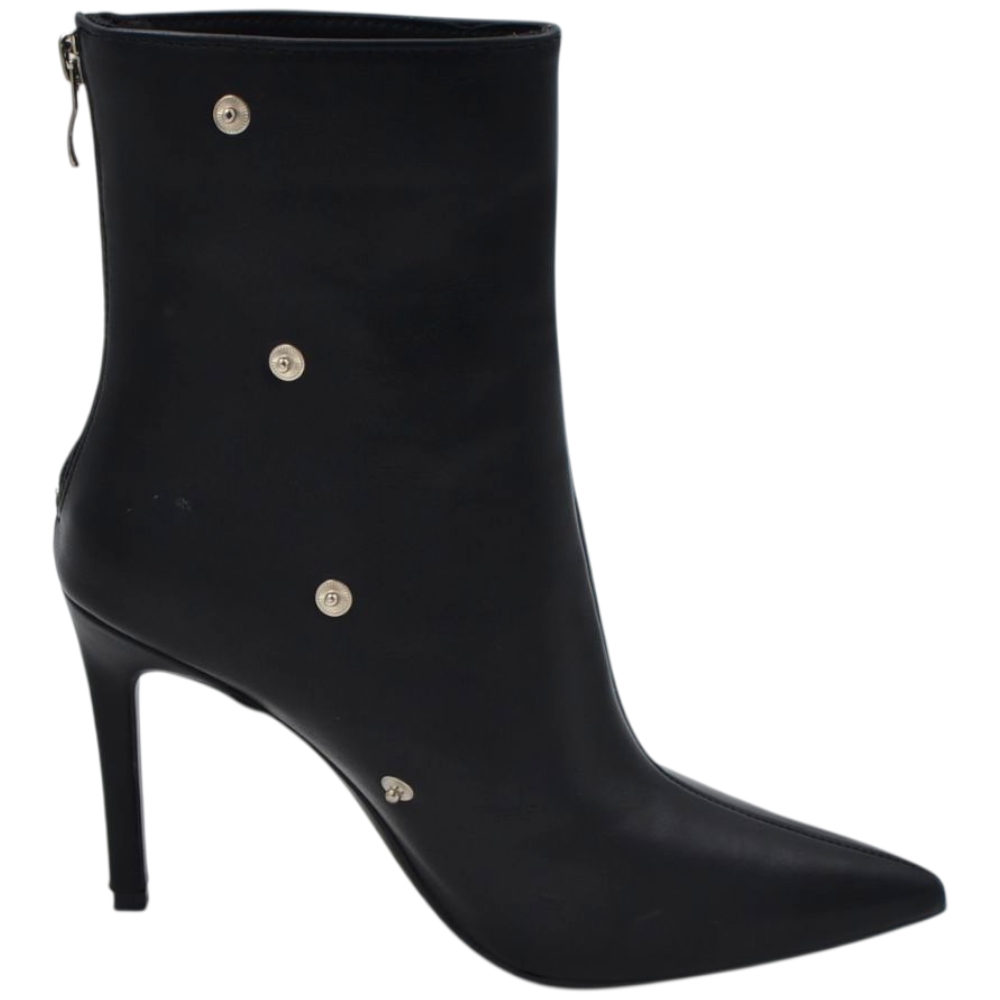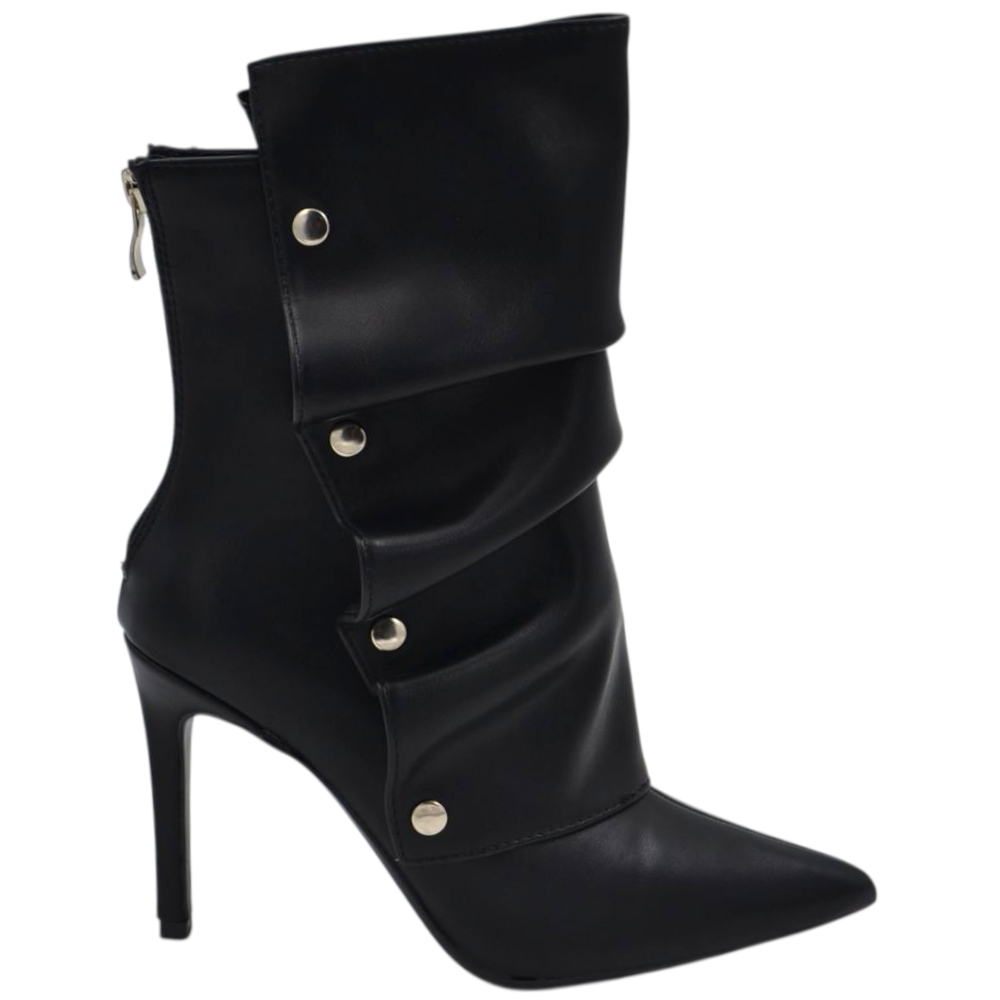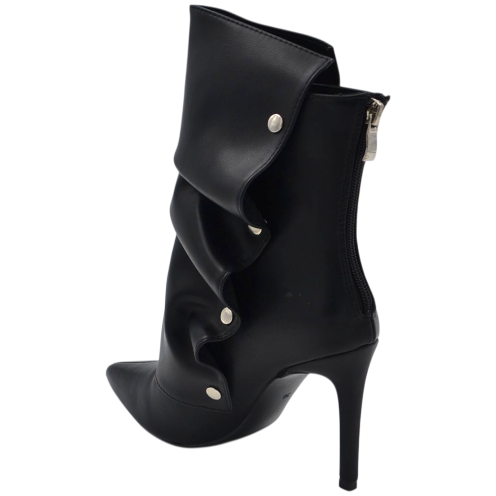 Stivaletto tronchetto donna a punta arricciato pelle nero con bottoni argento removibile tacco spillo cm