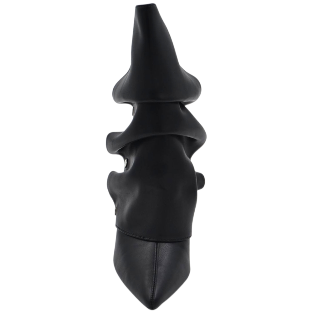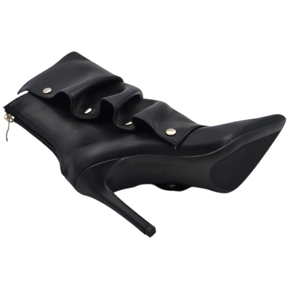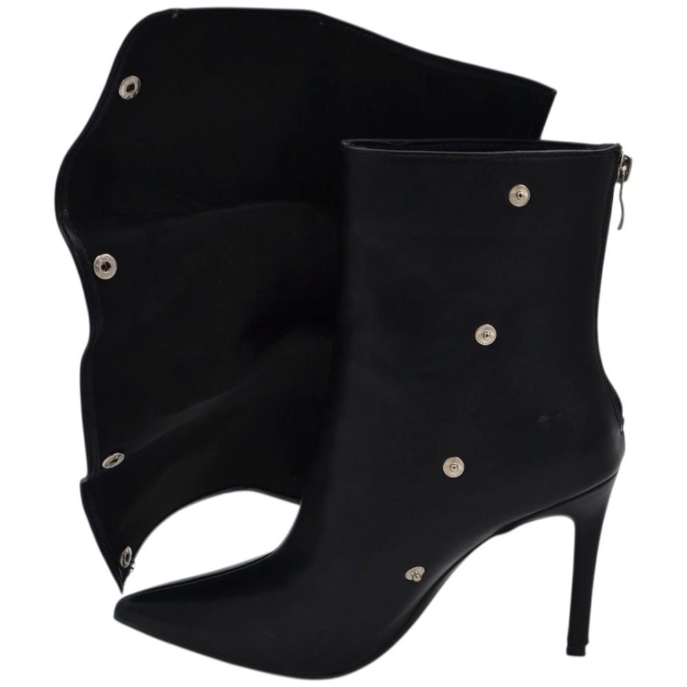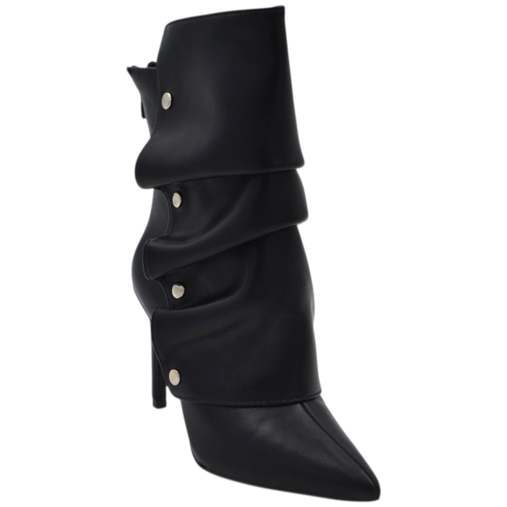 Stivaletto tronchetto donna a punta arricciato pelle nero con bottoni argento removibile tacco spillo cm