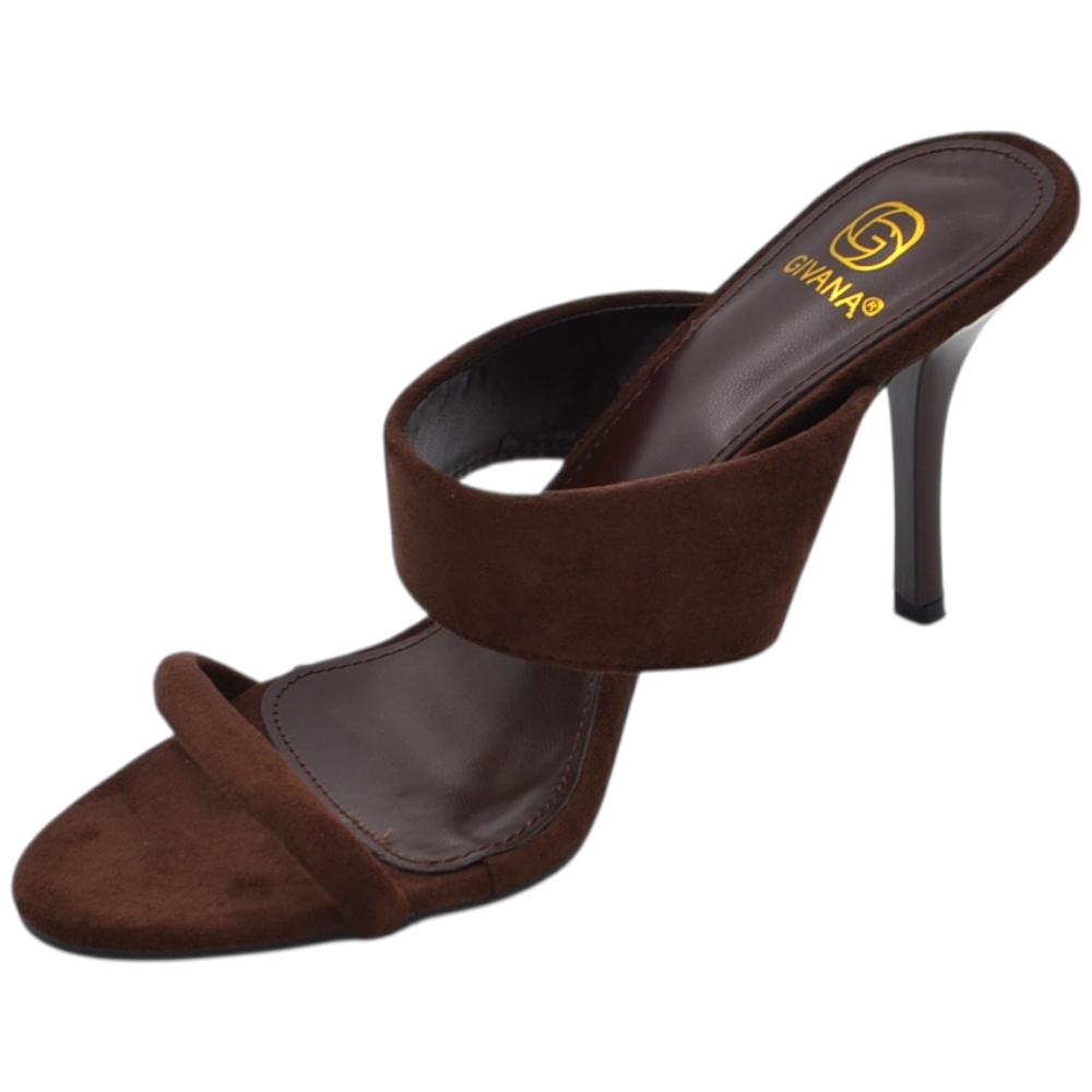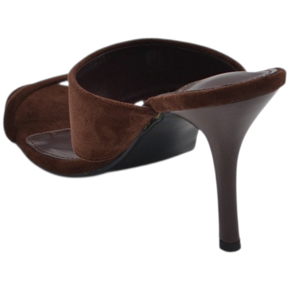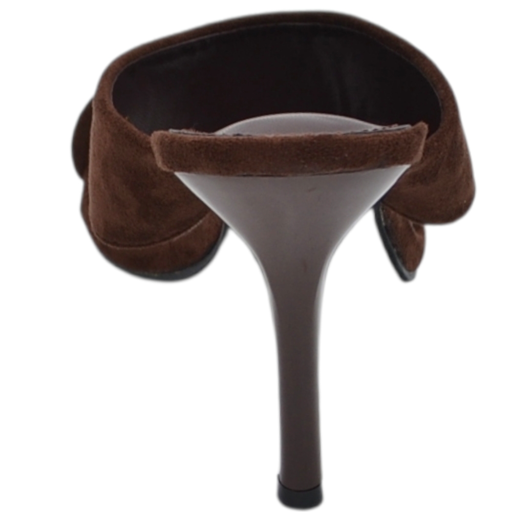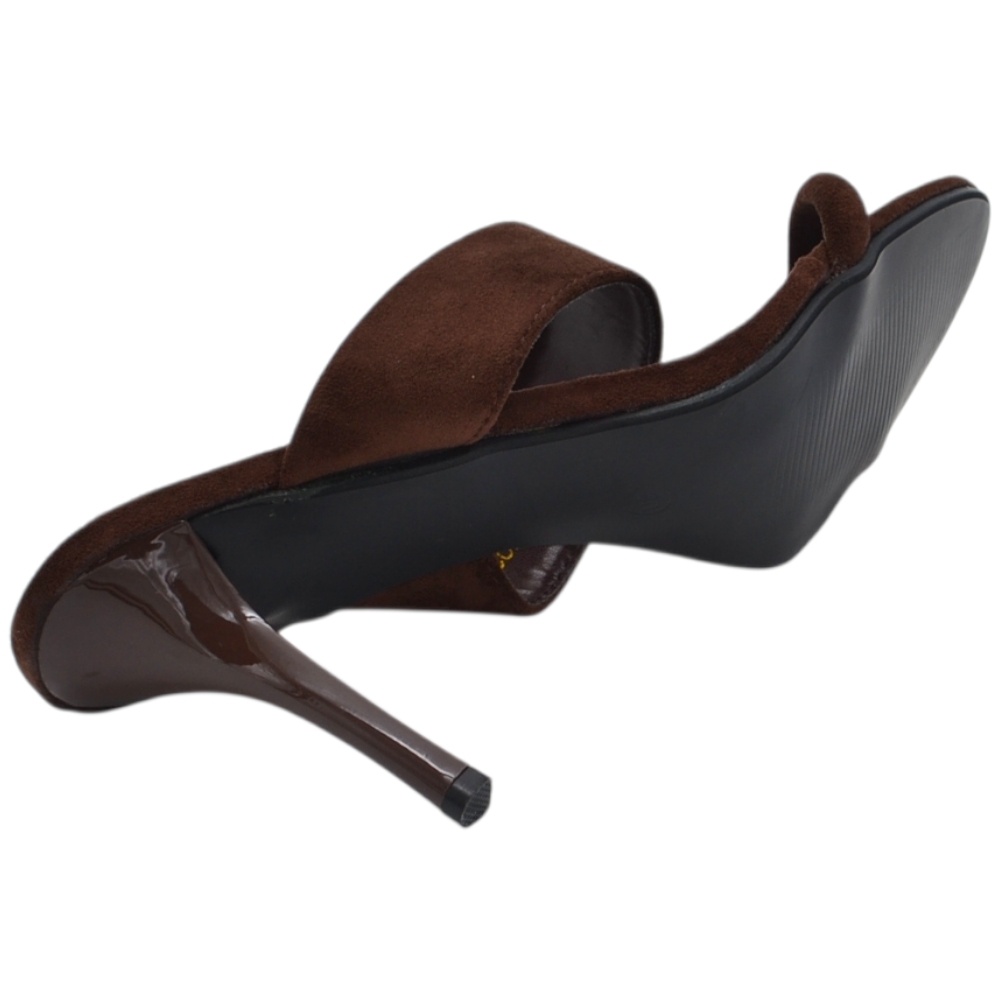 Sandalo donna tacco aperto dietro in camoscio marrone con doppia fascia su collo piede tacco a spillo 10 cm