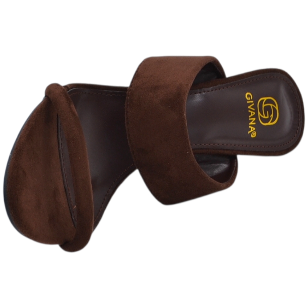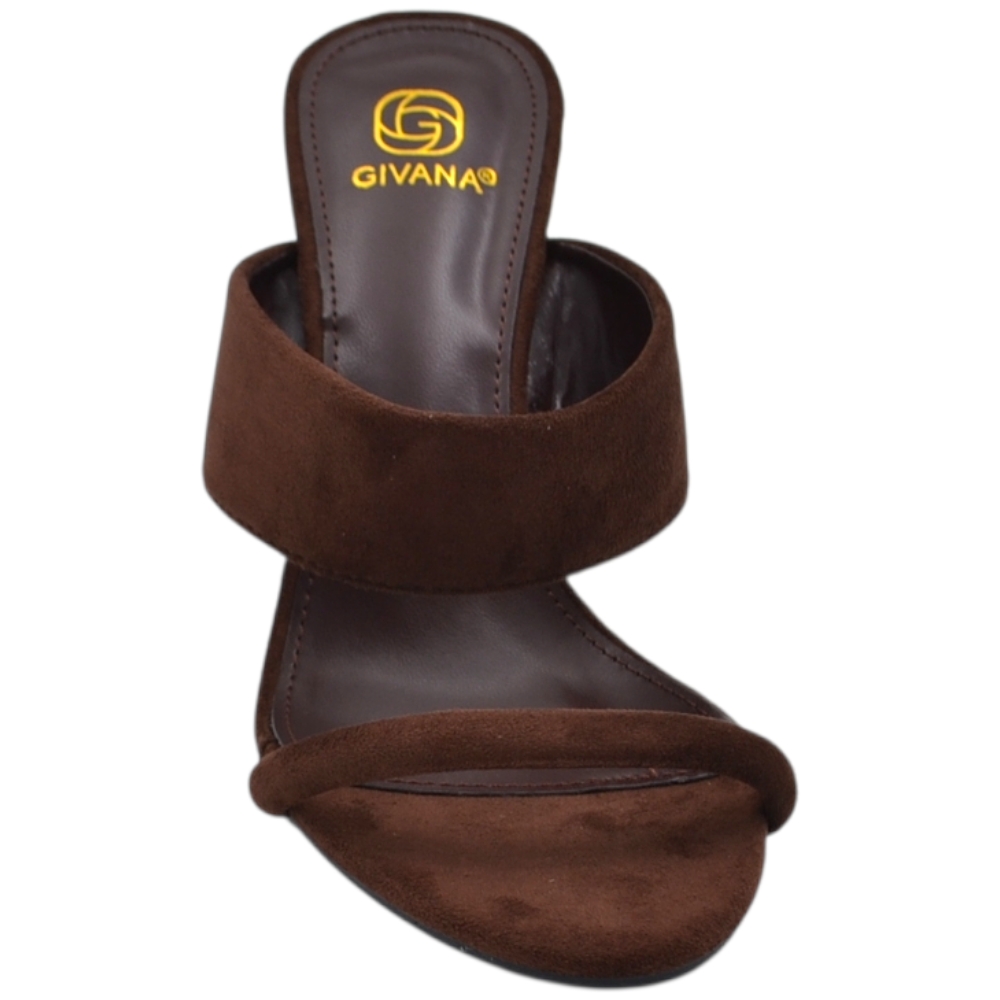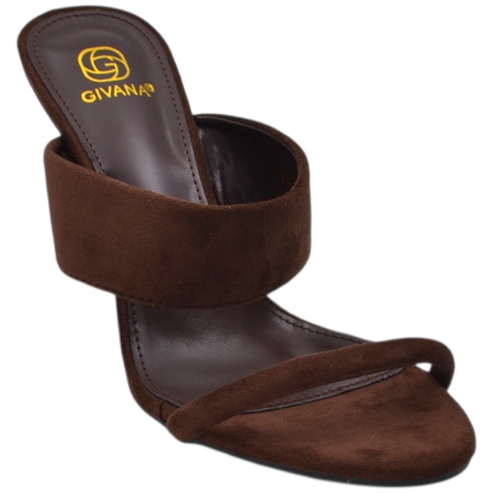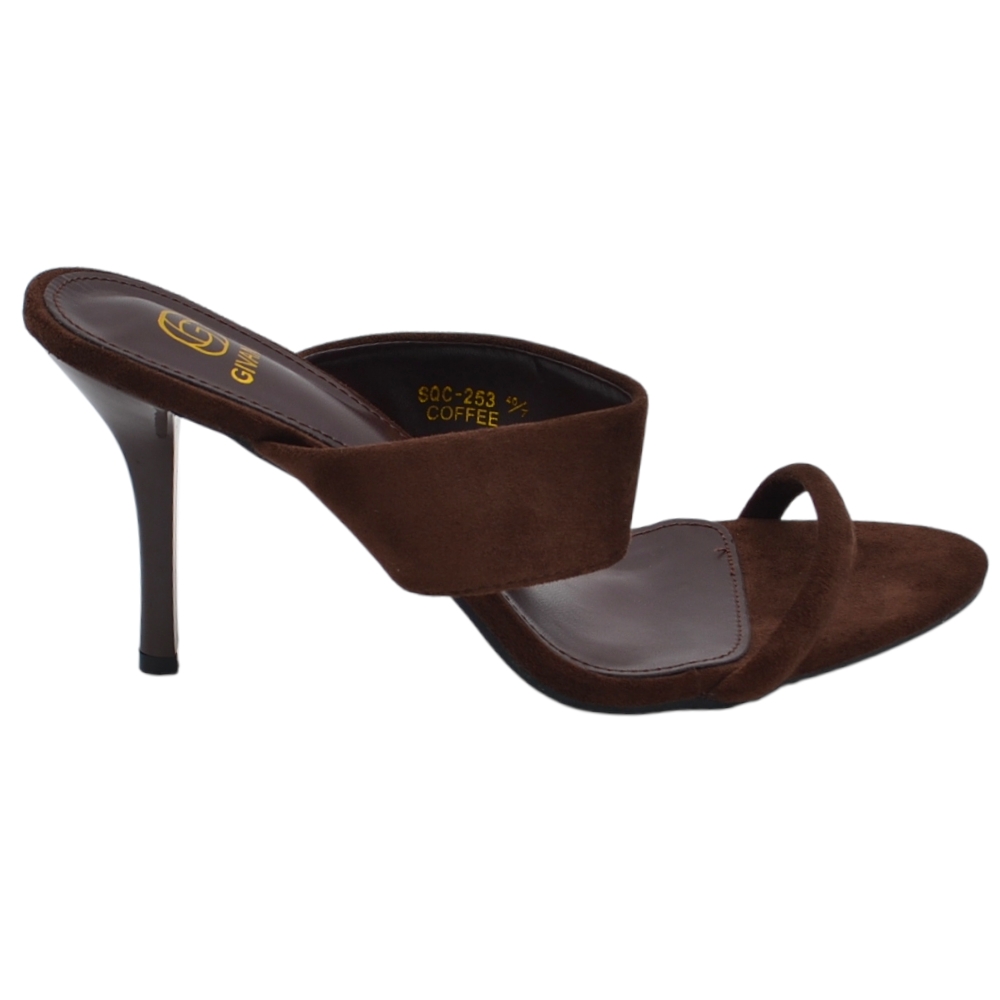 Sandalo donna tacco aperto dietro in camoscio marrone con doppia fascia su collo piede tacco a spillo 10 cm