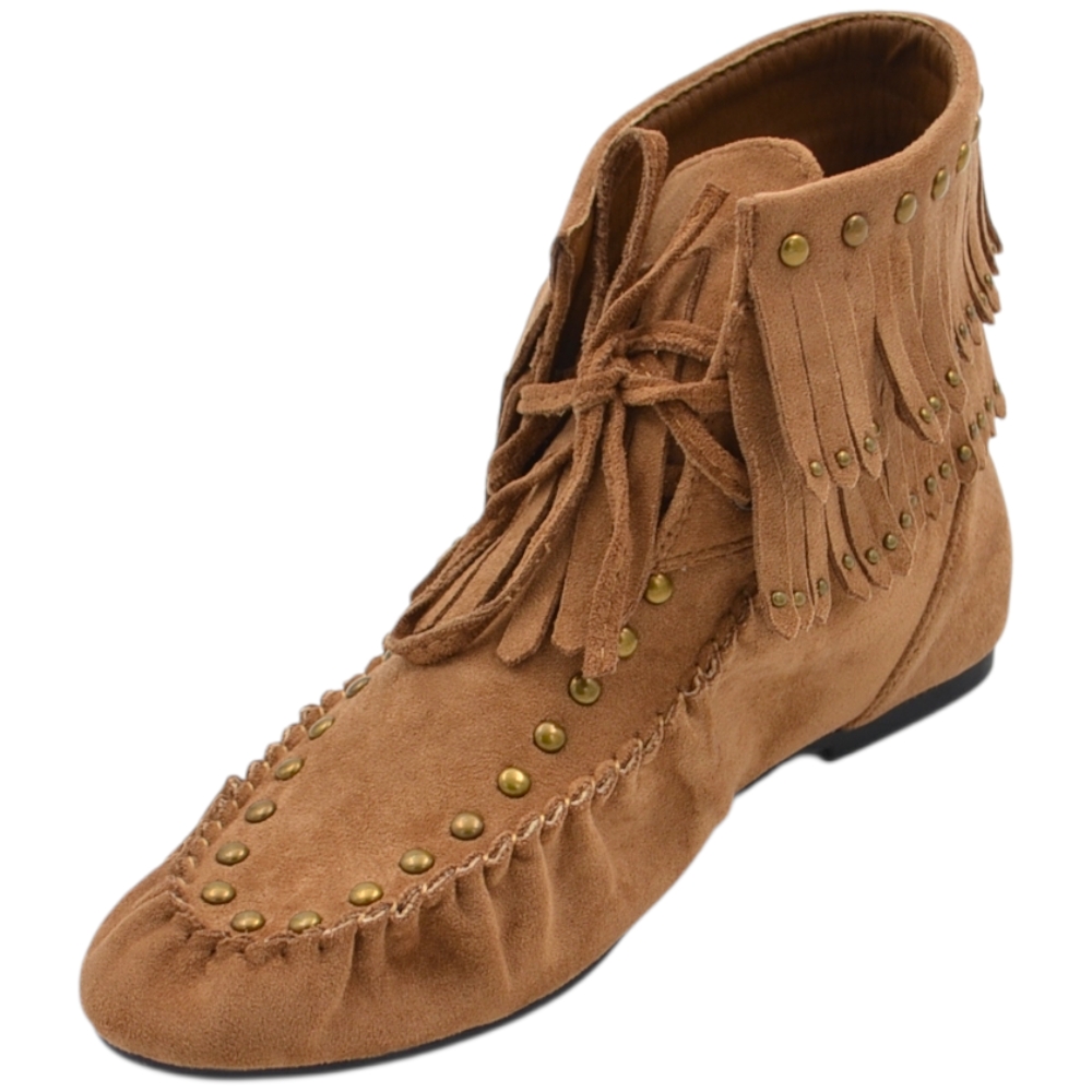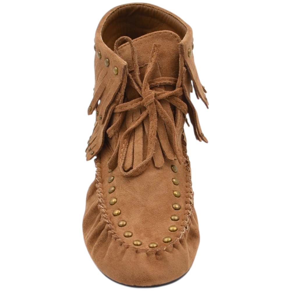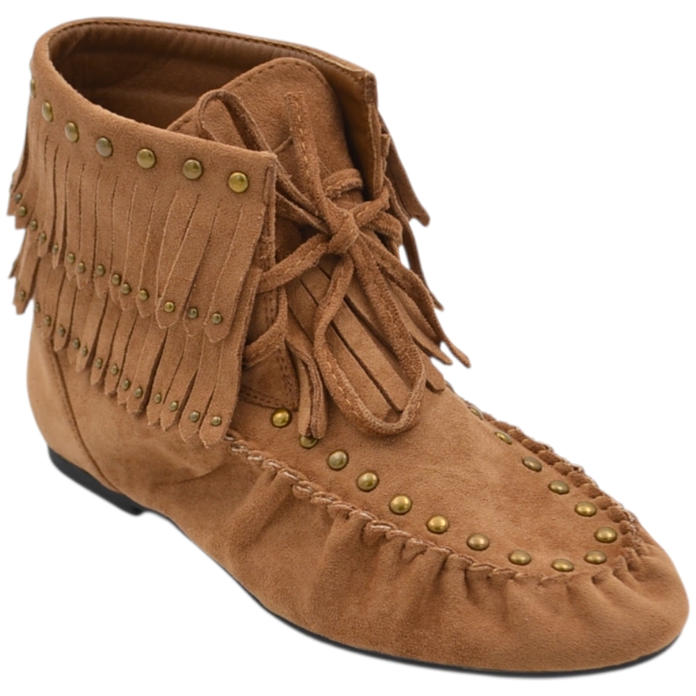 Stivaletto indianino basso in suede beige con borchie dorate e frange mocassino raso terra lacci regolabili tendenza