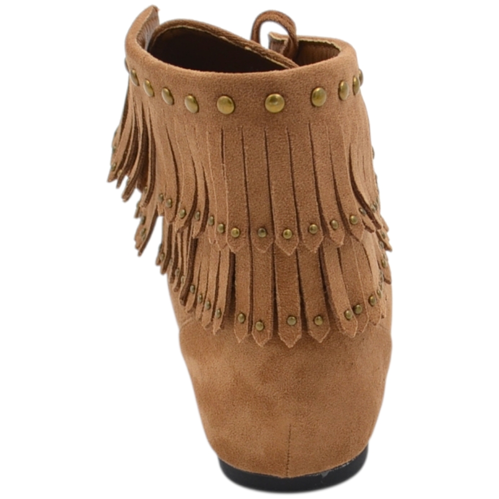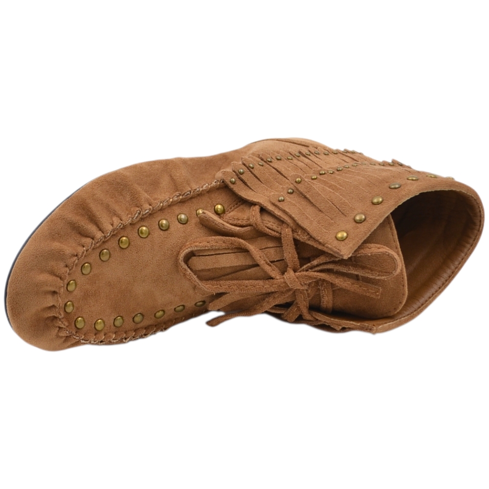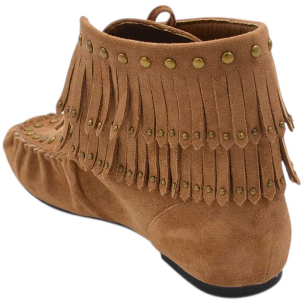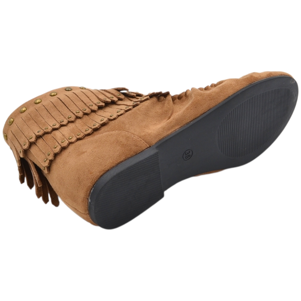 Stivaletto indianino basso in suede beige con borchie dorate e frange mocassino raso terra lacci regolabili tendenza