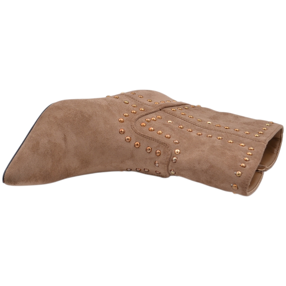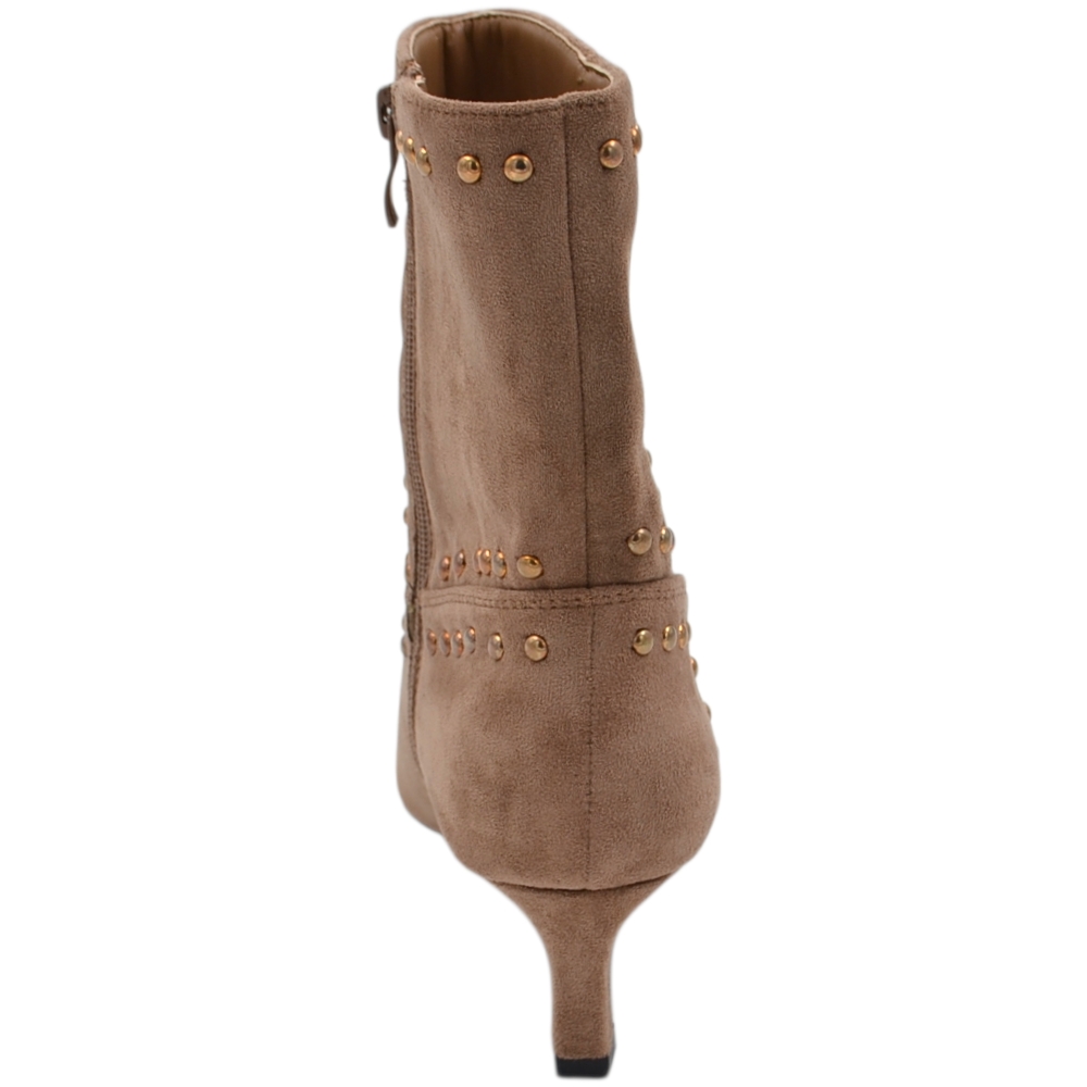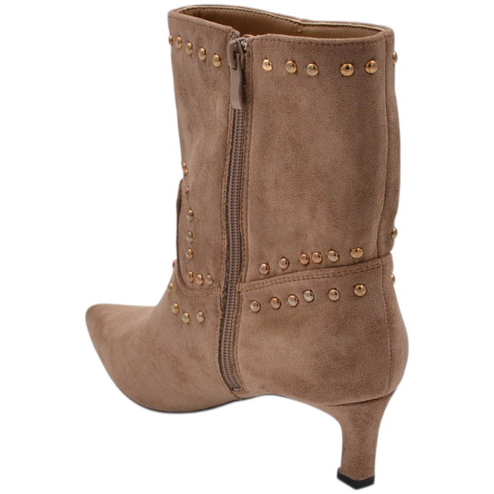 Stivaletto tronchetto donna a punta camoscio beige con borchie oro tonde tacco kitten 3 cm zip