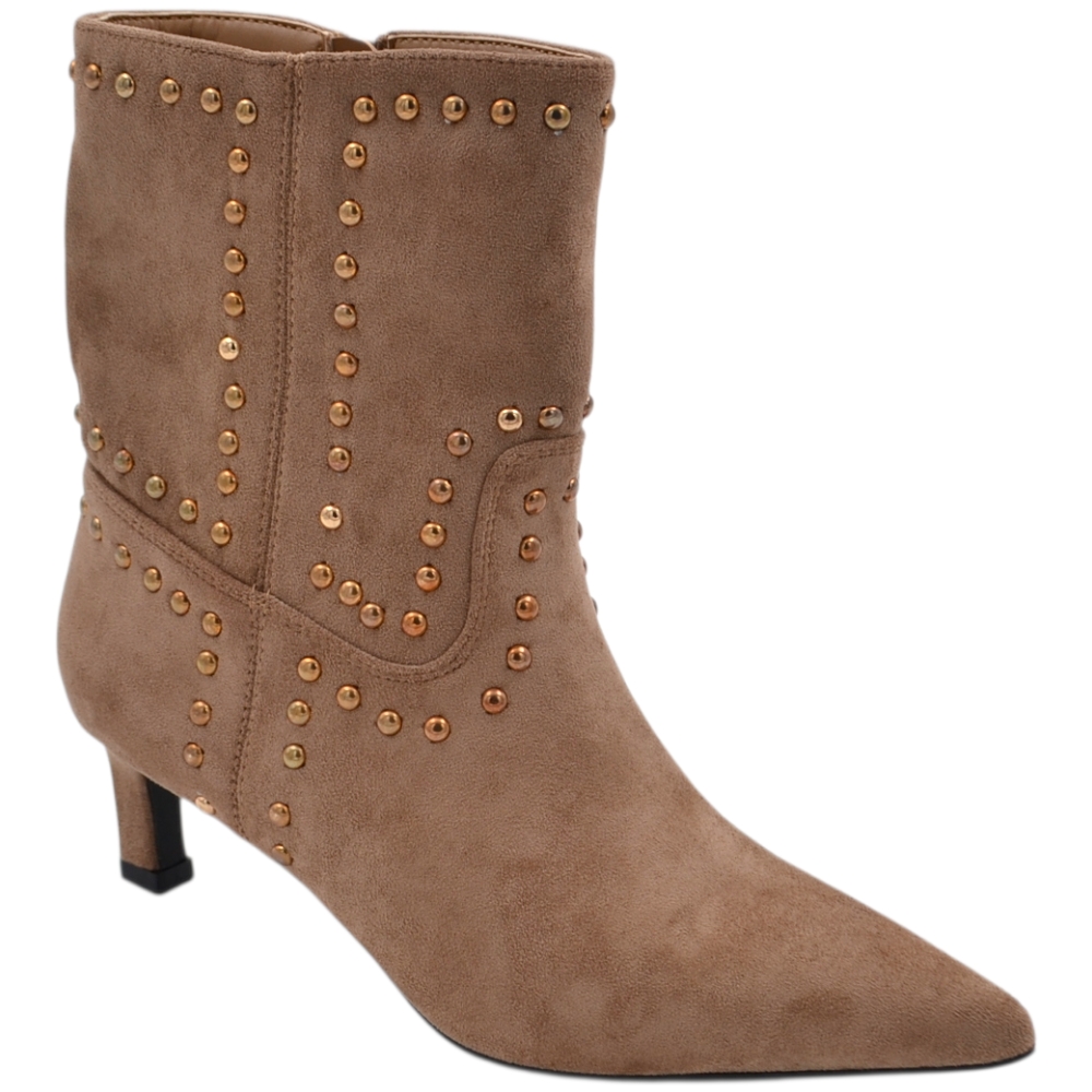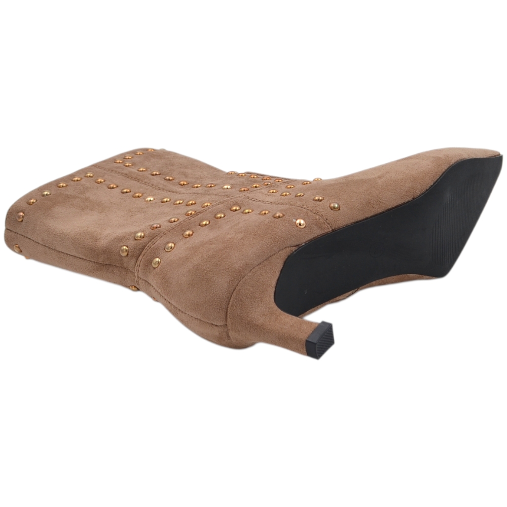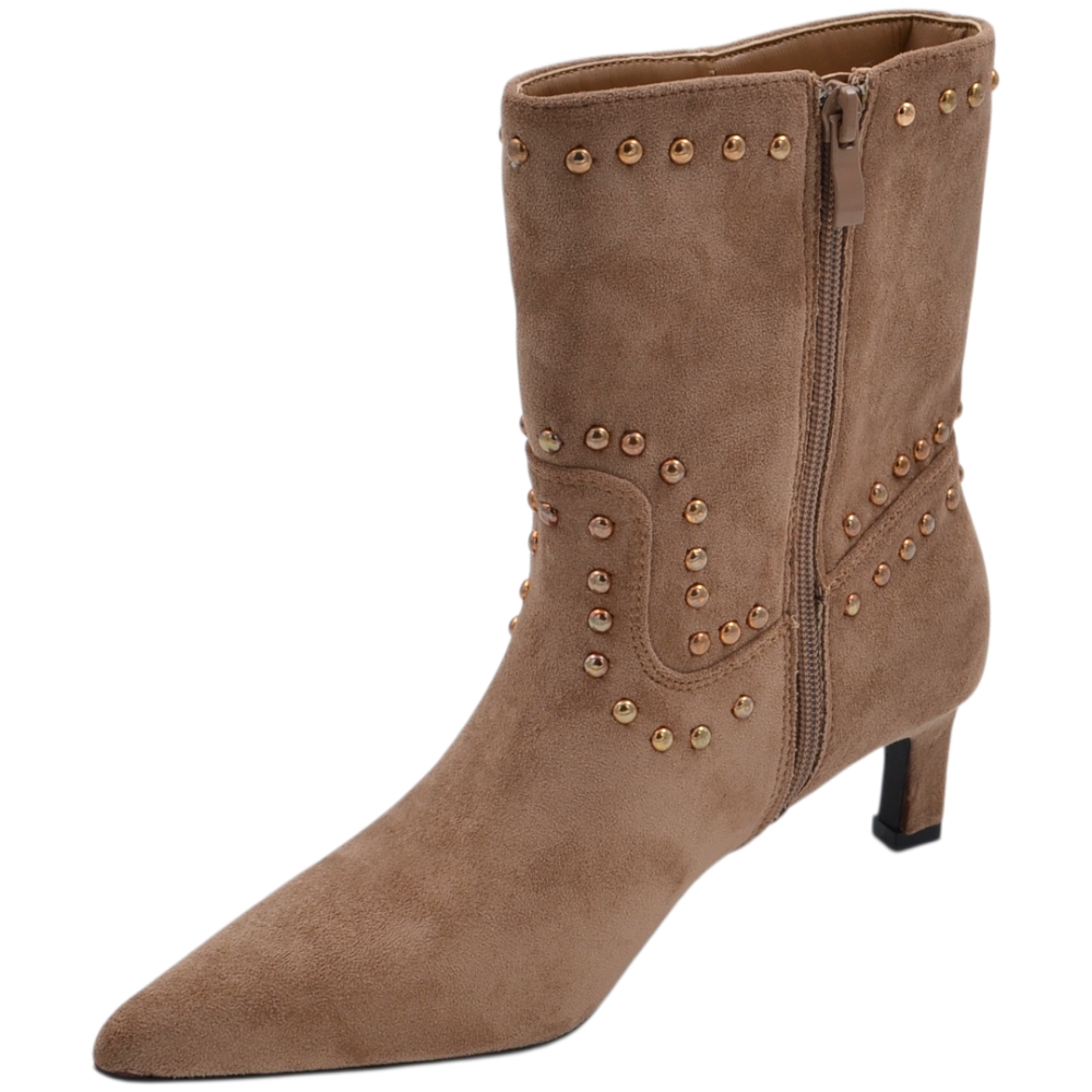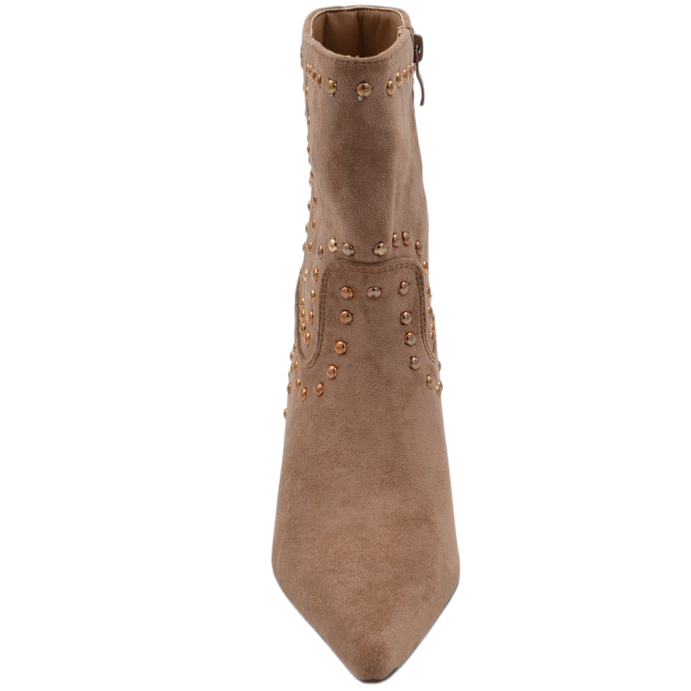 Stivaletto tronchetto donna a punta camoscio beige con borchie oro tonde tacco kitten 3 cm zip