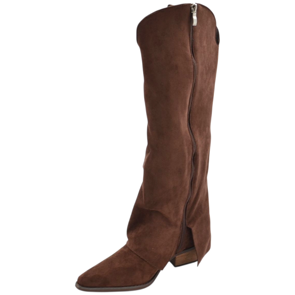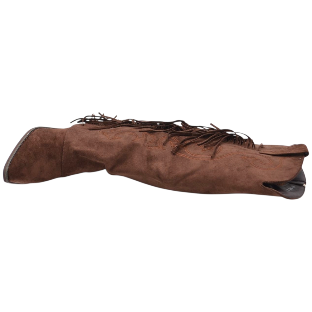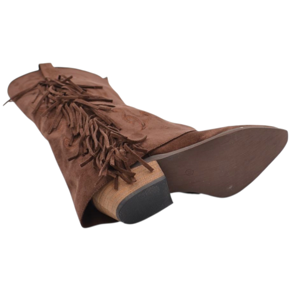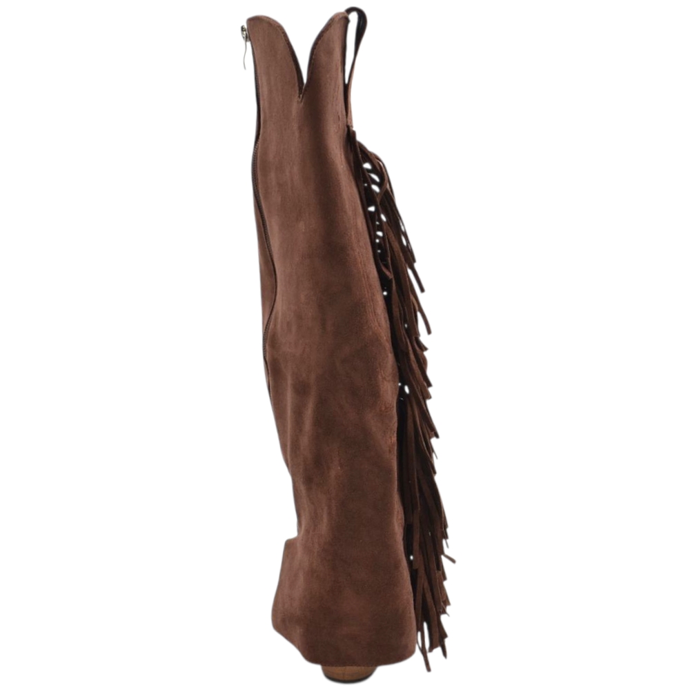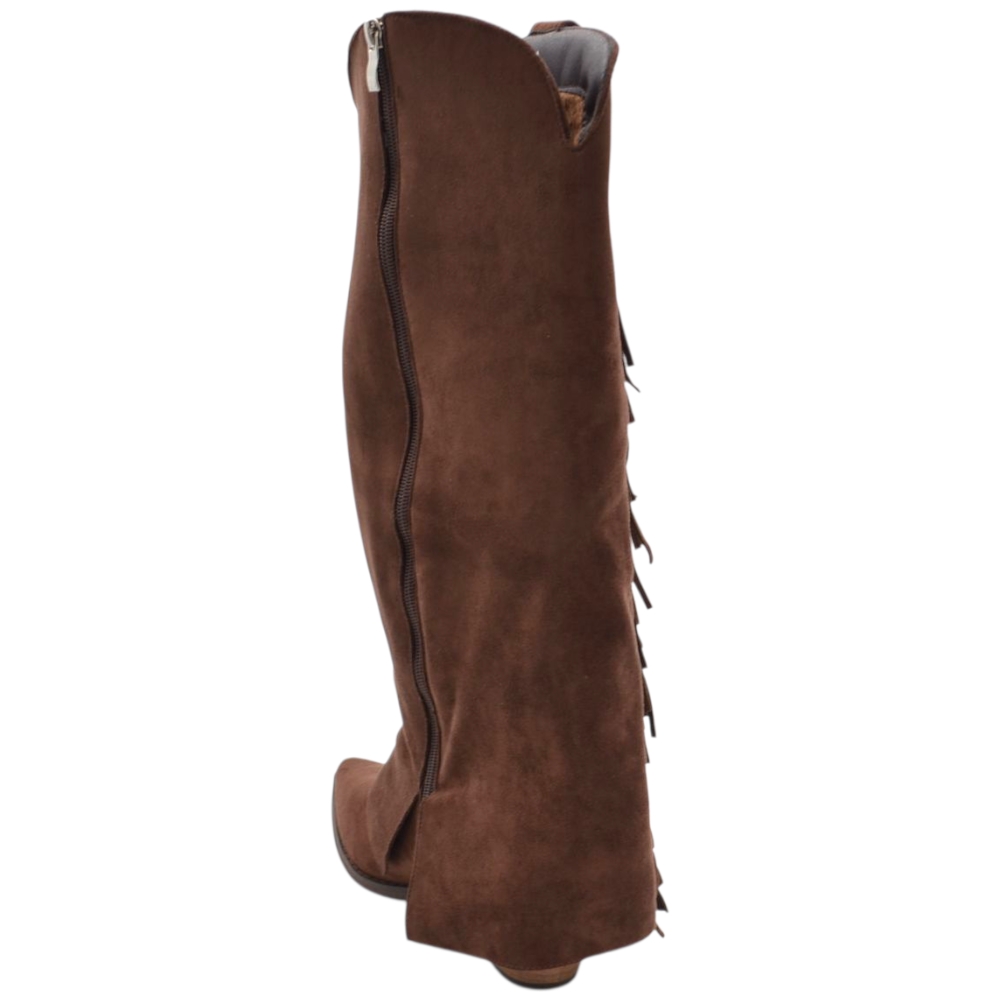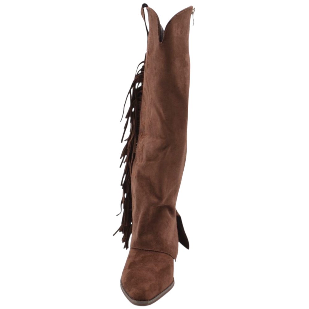 Stivali donna al ginocchio camperos in camoscio marrone con risvolto e frange tacco western 4 cm zip intera