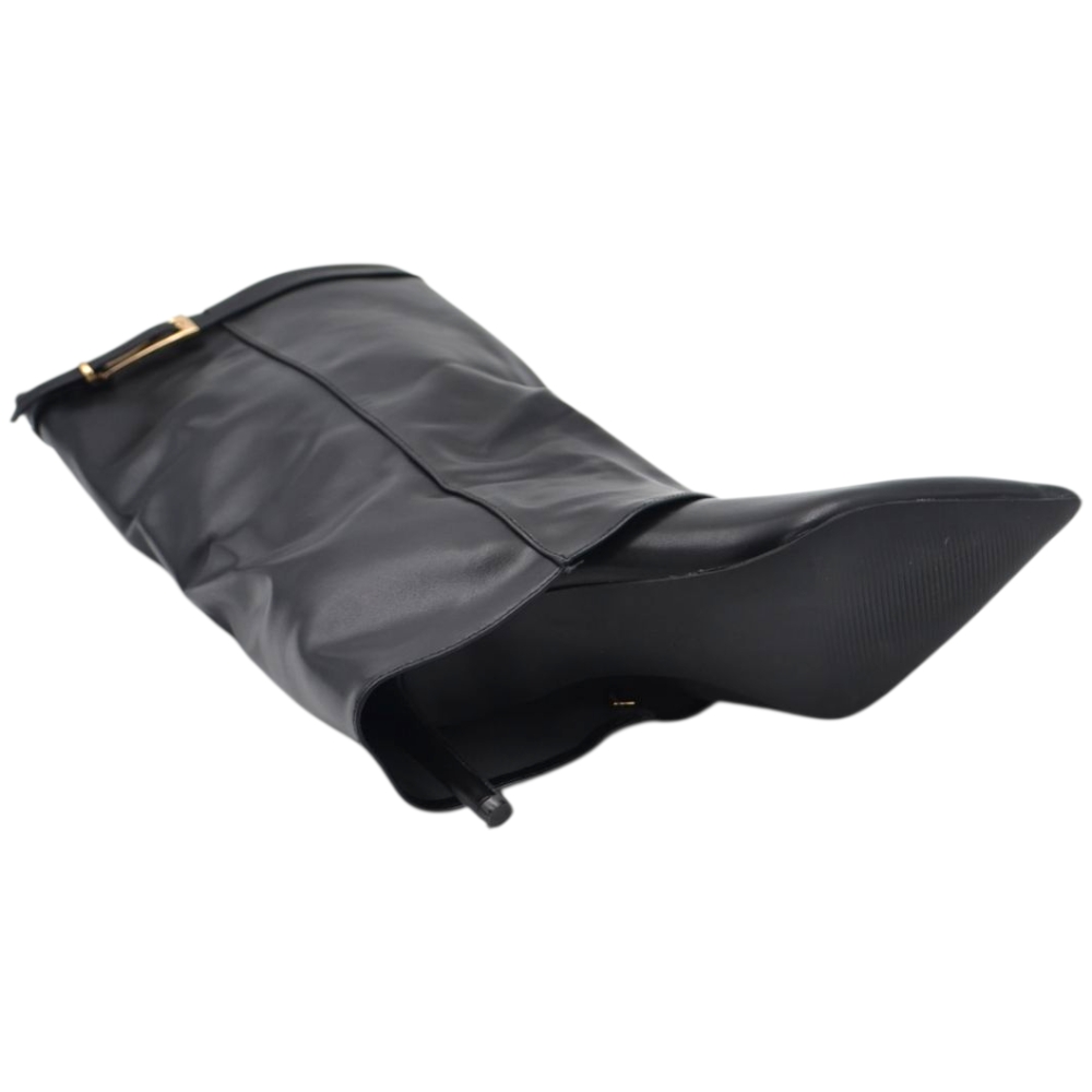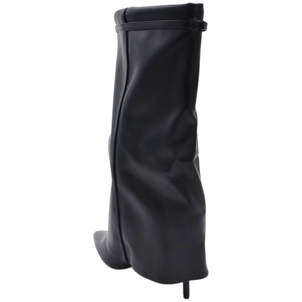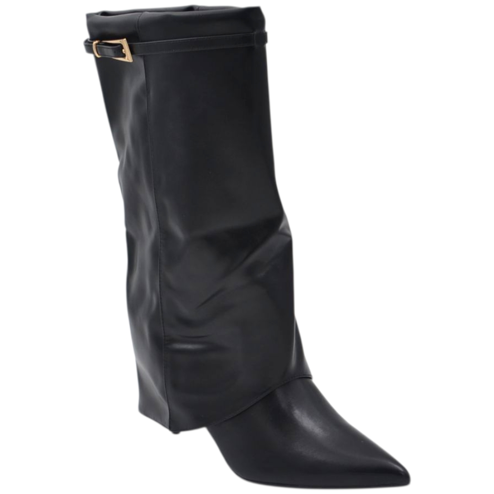 Stivale donna meta' polpaccio shark punta in pelle nero con risvolto fibbia oro tacco spillo 8 cm