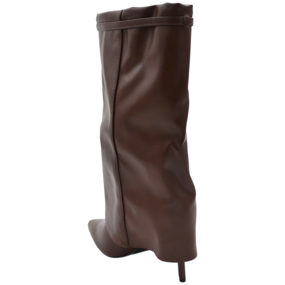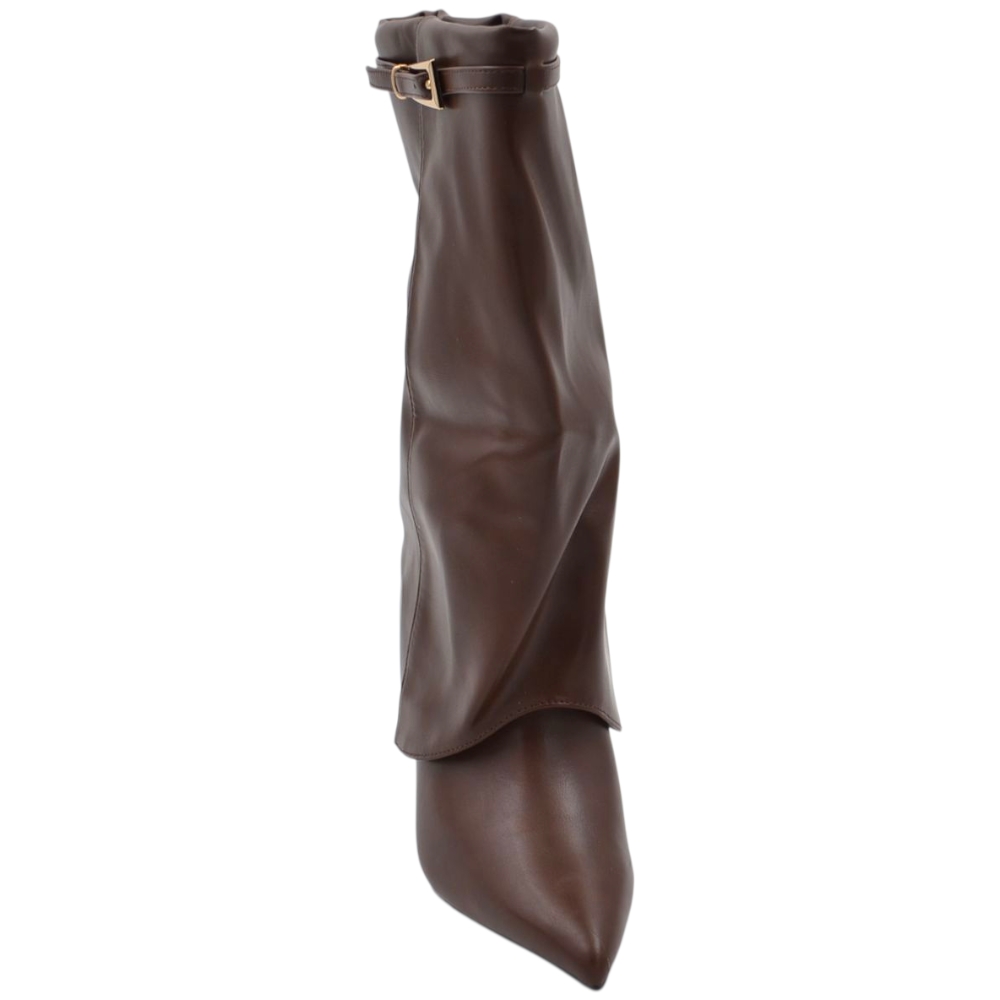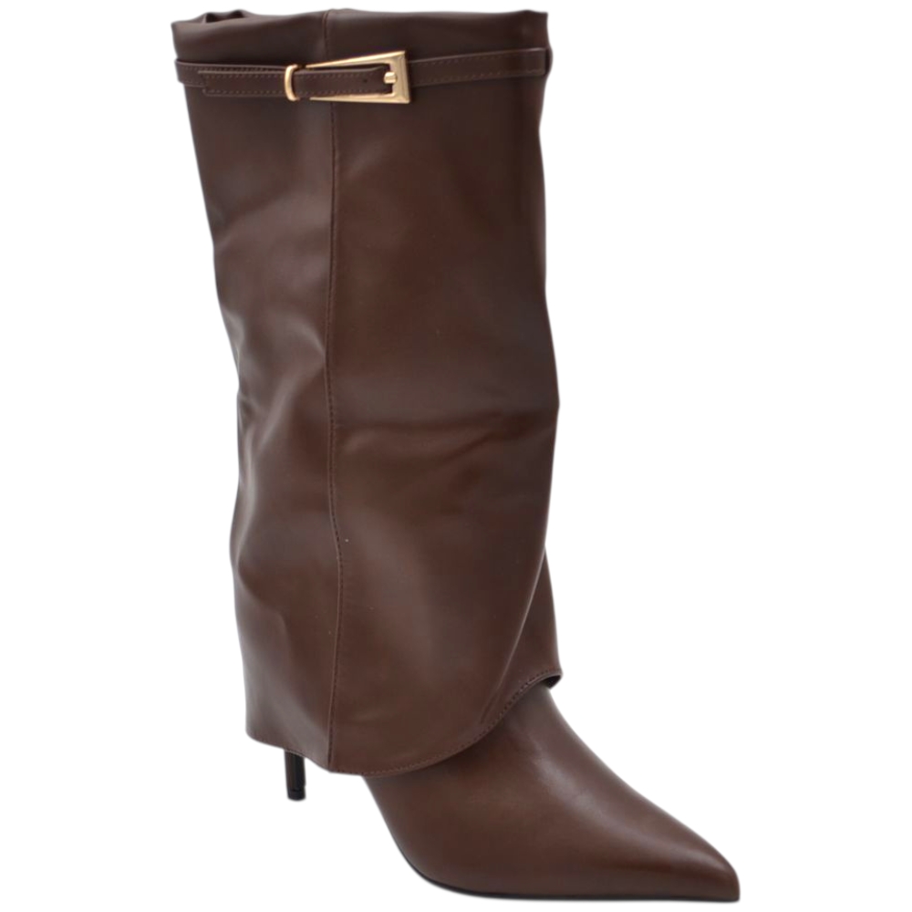 Stivale donna meta' polpaccio shark punta in pelle marrone con risvolto fibbia oro tacco spillo 8 cm
