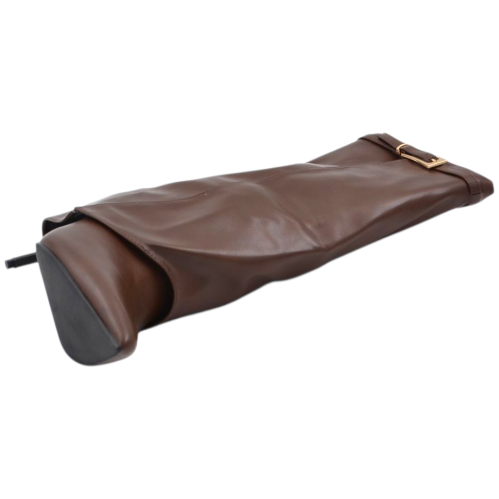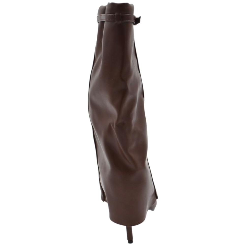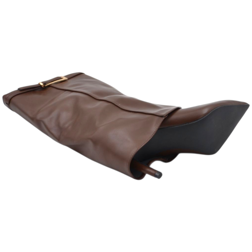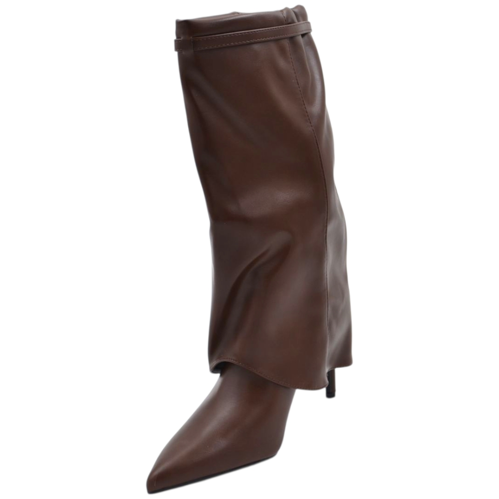 Stivale donna meta' polpaccio shark punta in pelle marrone con risvolto fibbia oro tacco spillo 8 cm