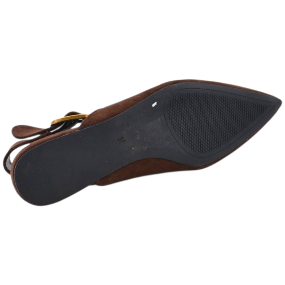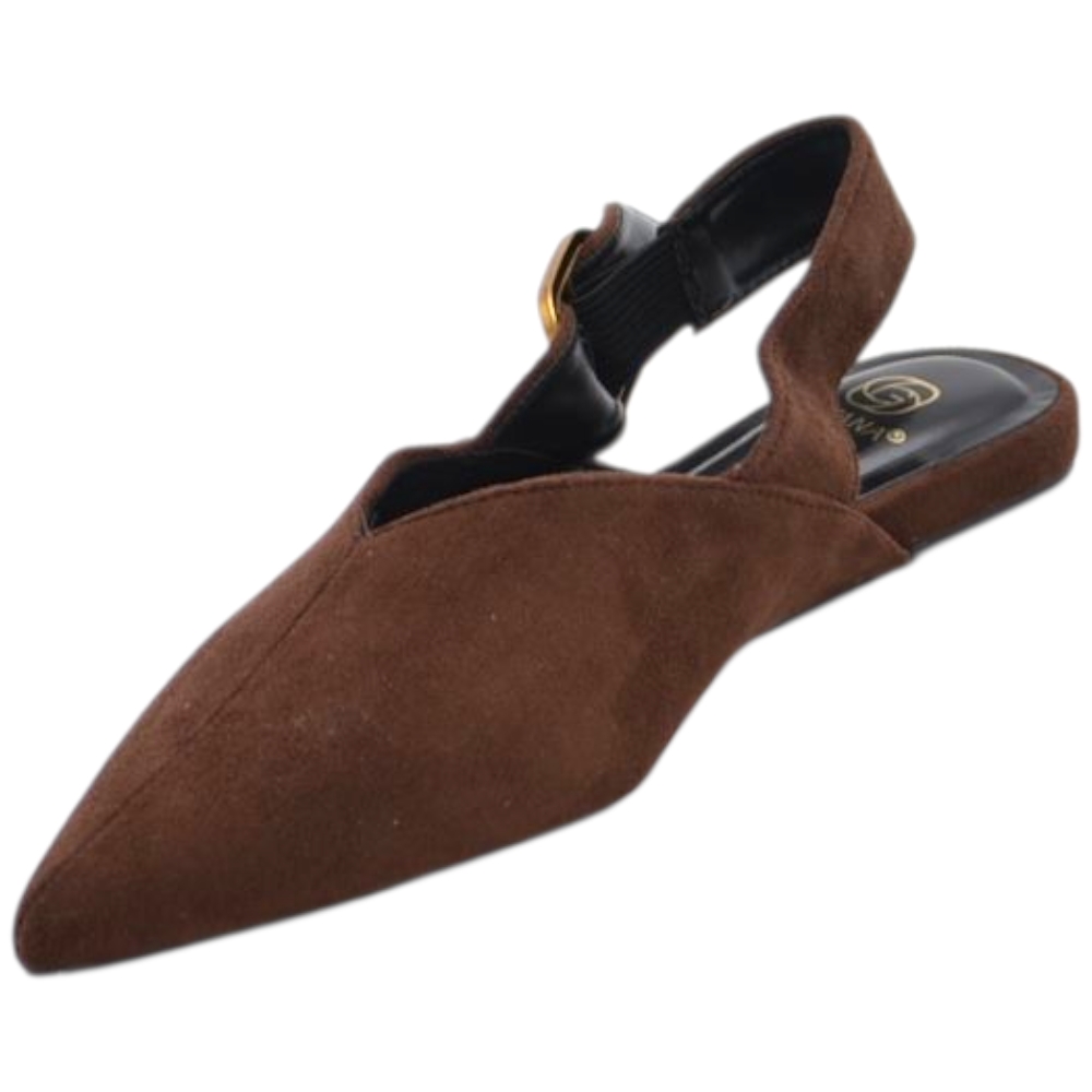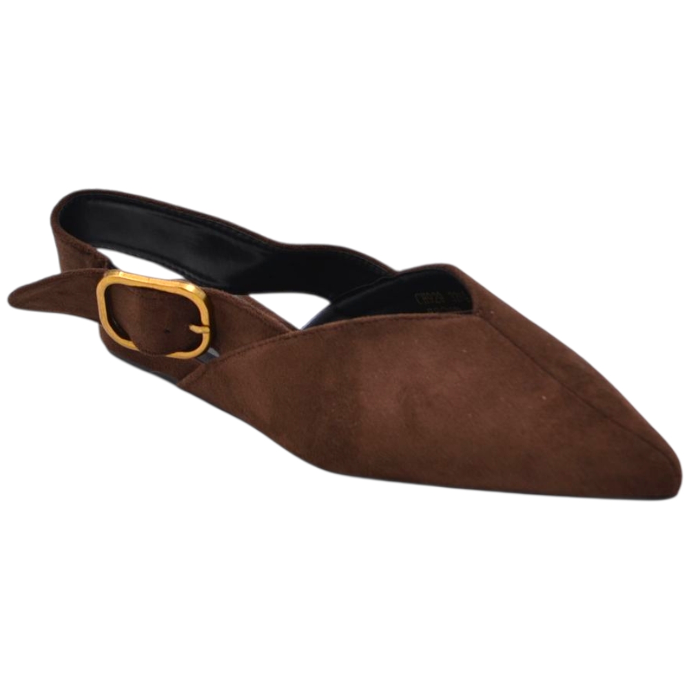 Scarpe ballerine donna a punta slingback con fibbia dorata in pelle scamosciata marrone raso terra