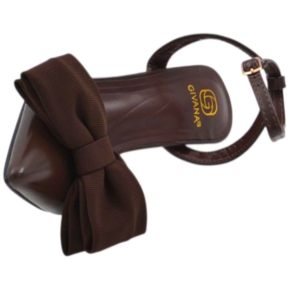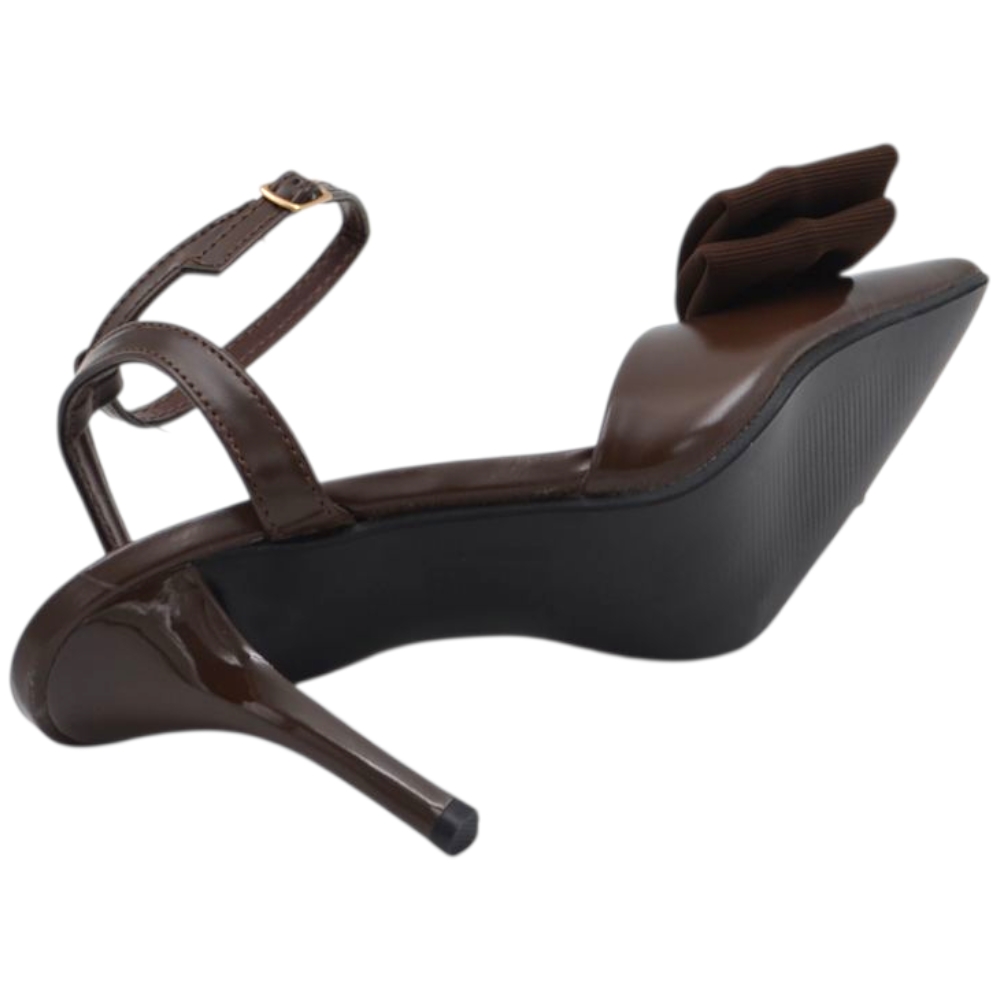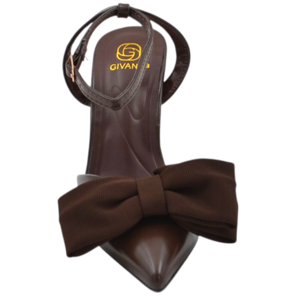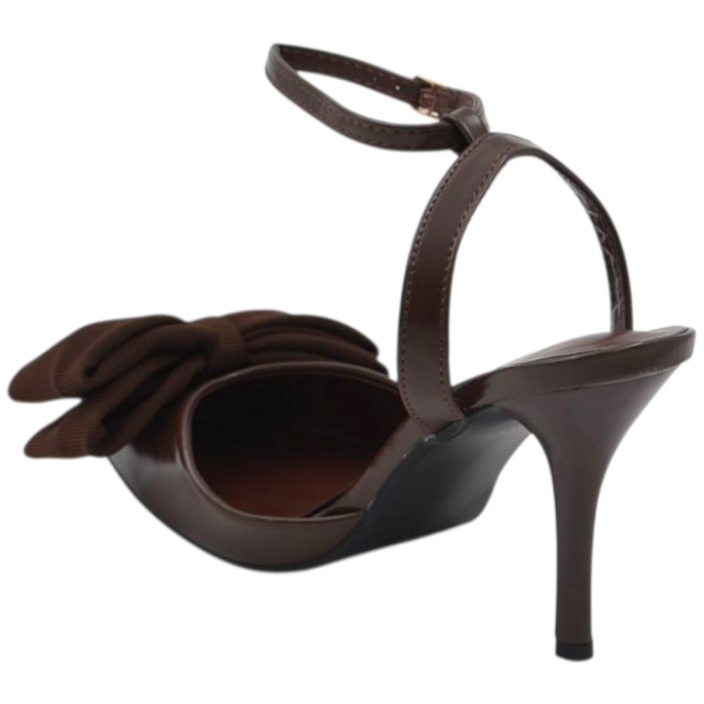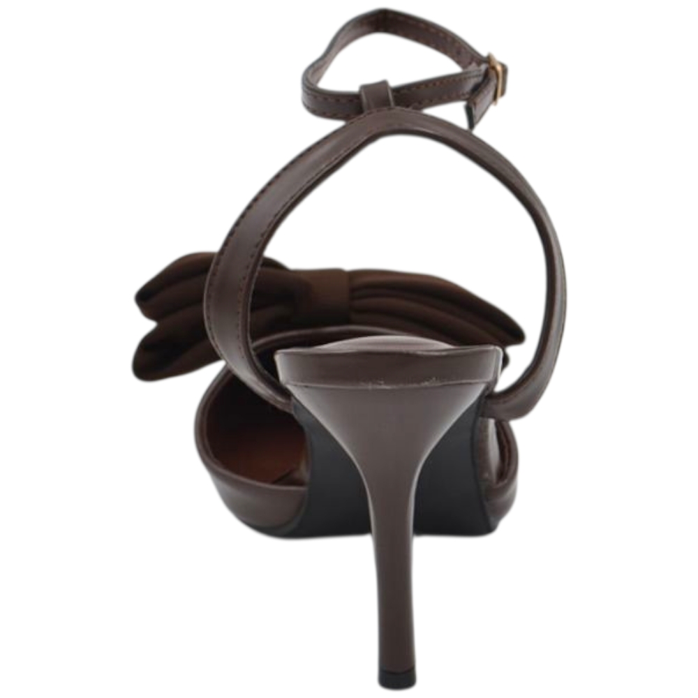 Decollete donna slingback in pelle marrone a punta con fiocco tessuto davanti tacco sottile 10 cm