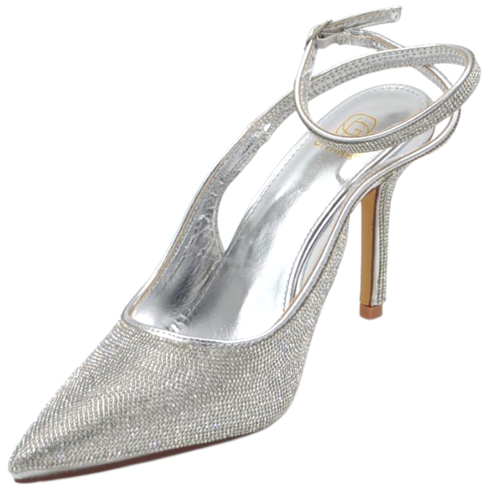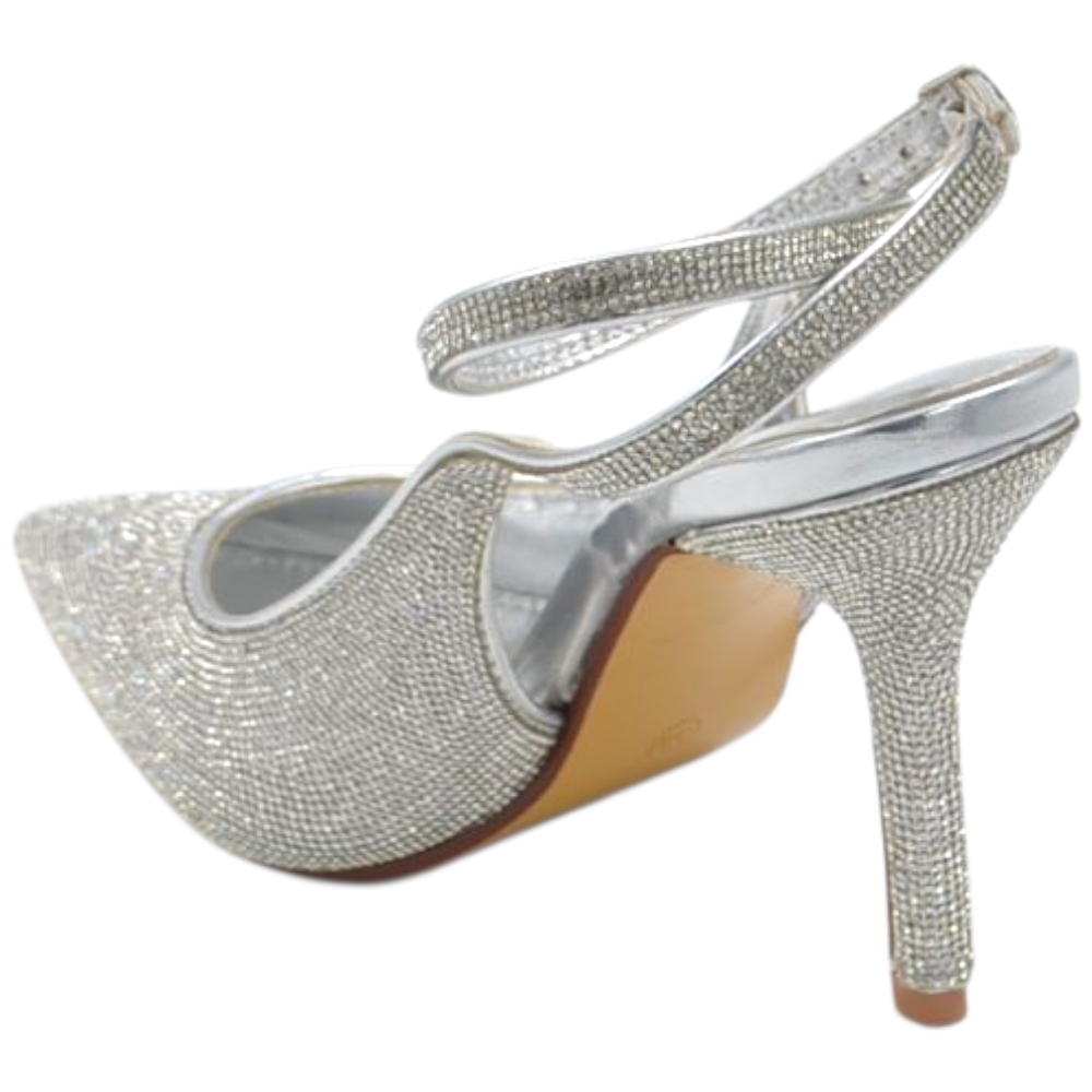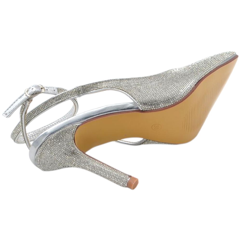 Decollete donna slingback a punta glitterato argento con strass e cinturino alla caviglia sottile 10 cm