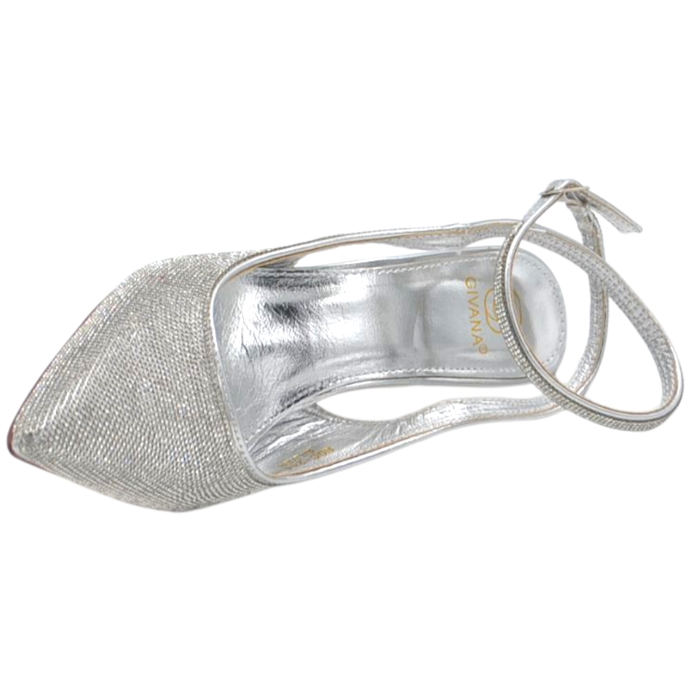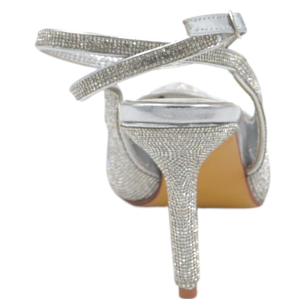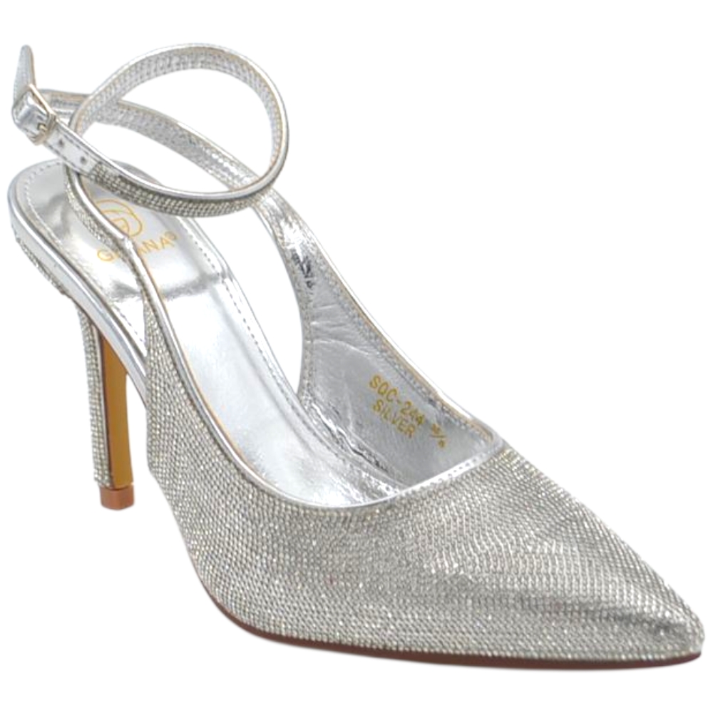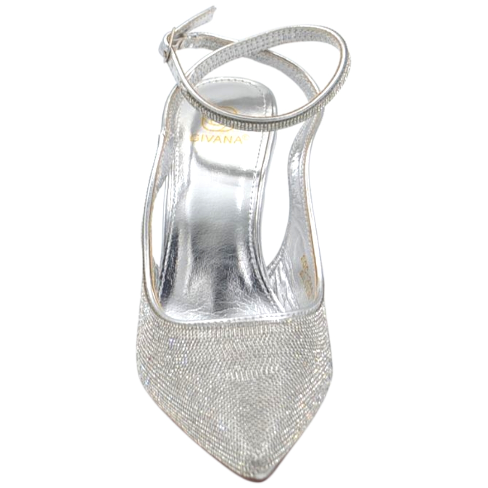 Decollete donna slingback a punta glitterato argento con strass e cinturino alla caviglia sottile 10 cm