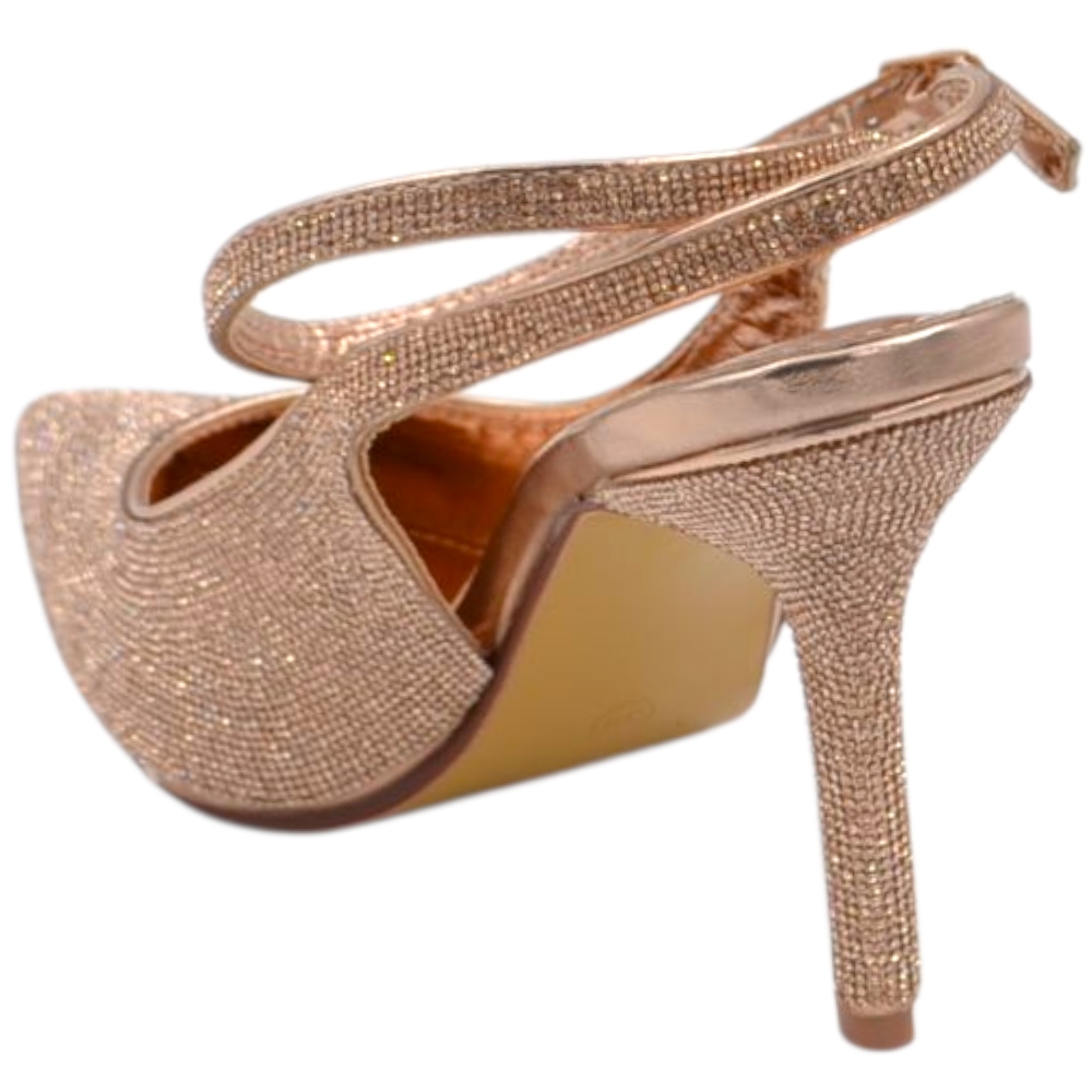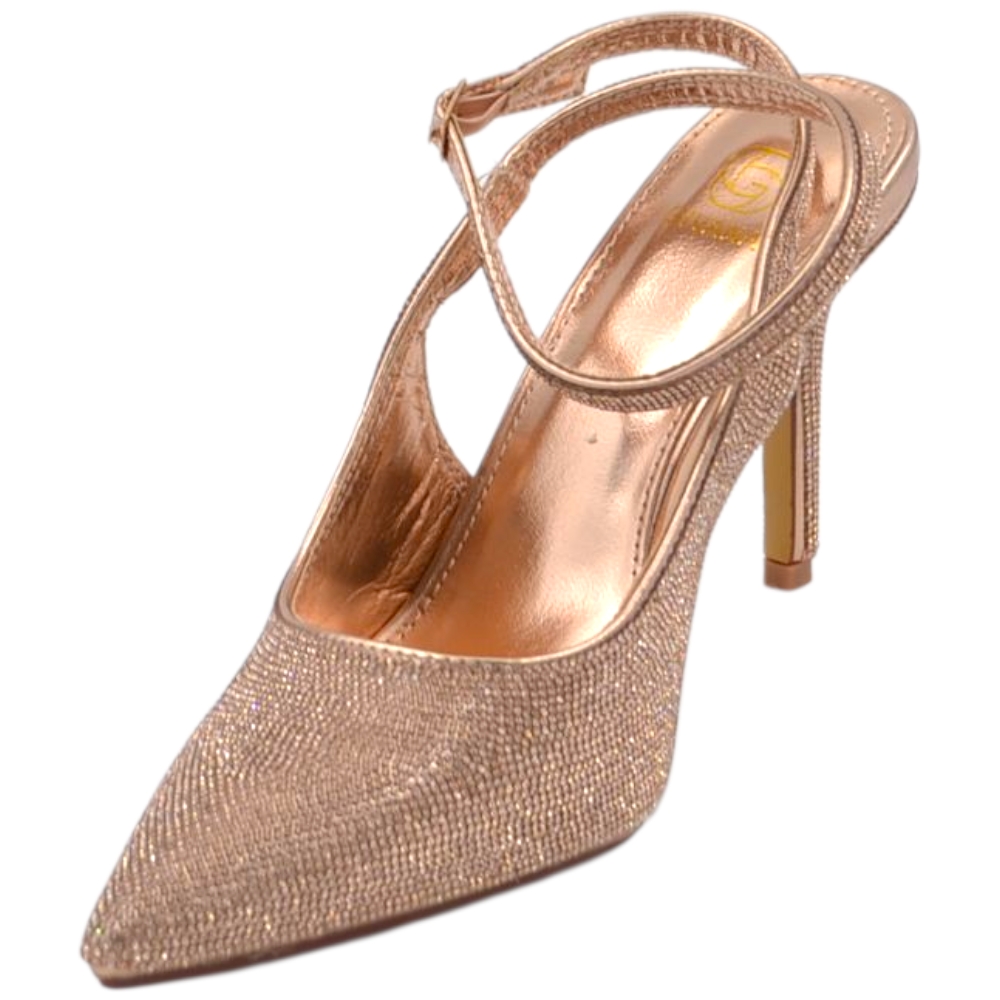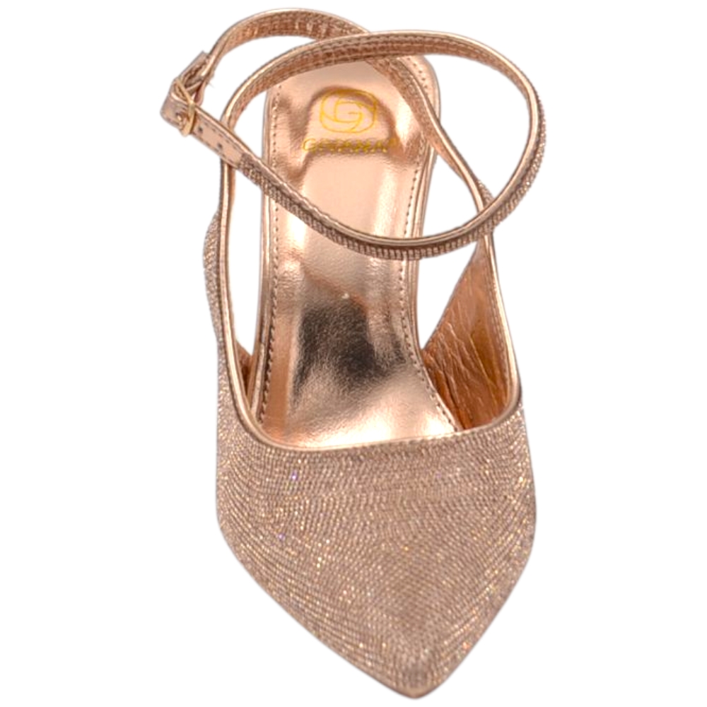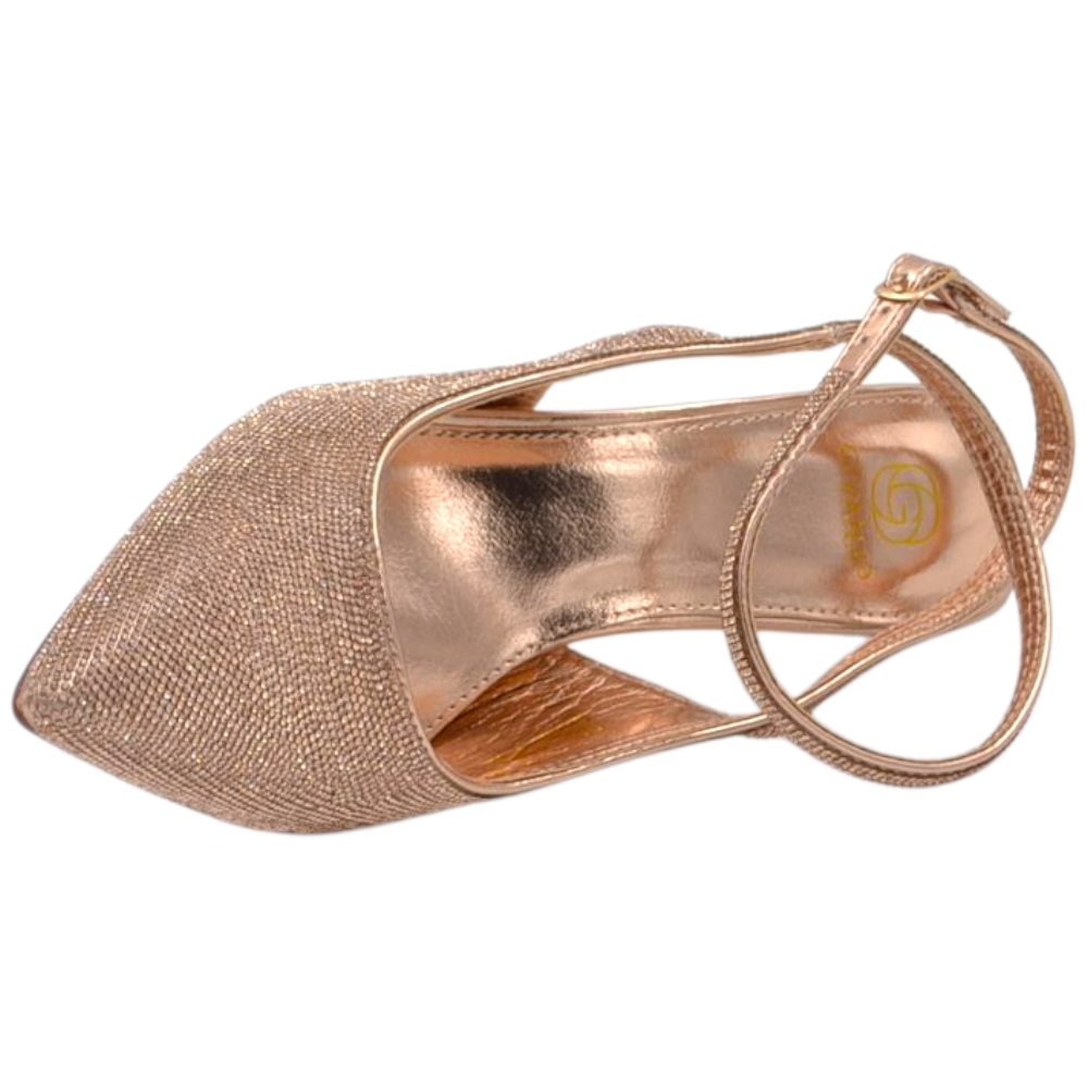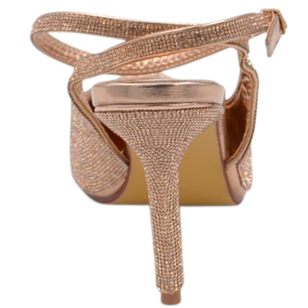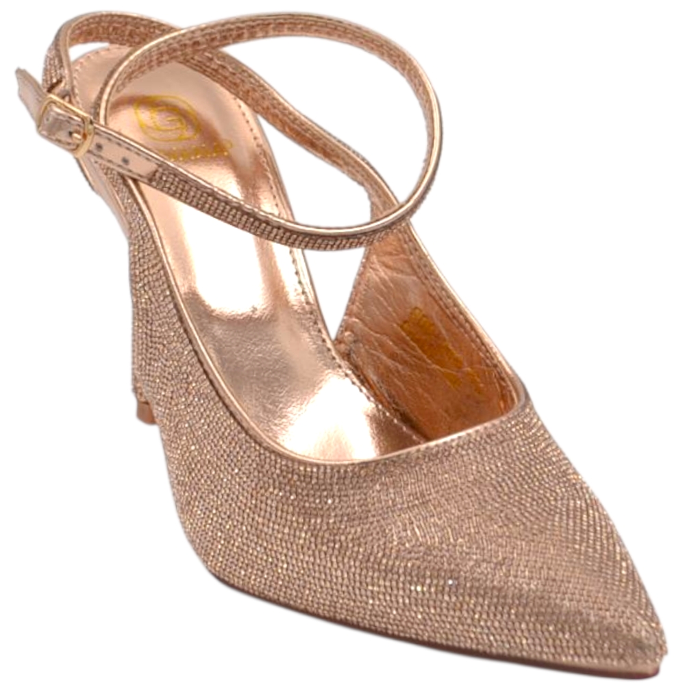 Decollete donna slingback a punta glitterato oro rosa con strass e cinturino alla caviglia sottile 10 cm