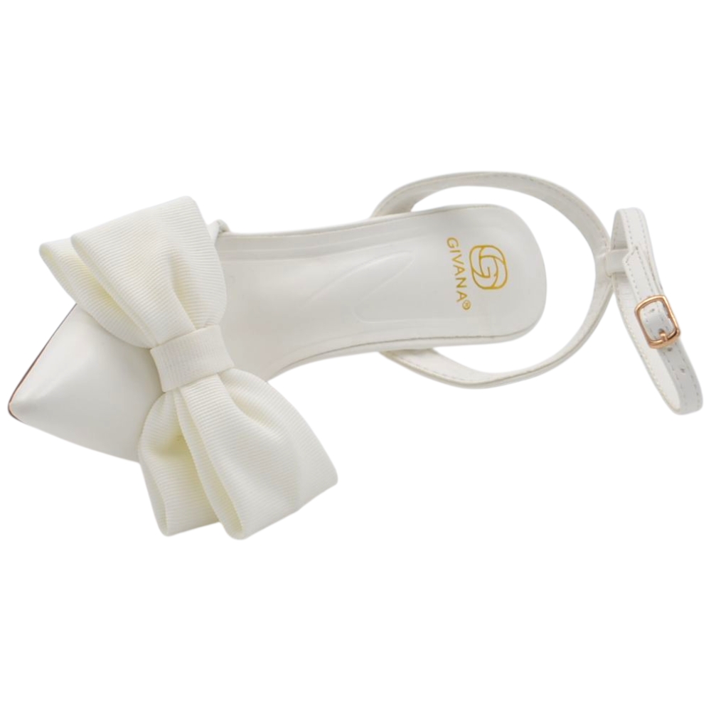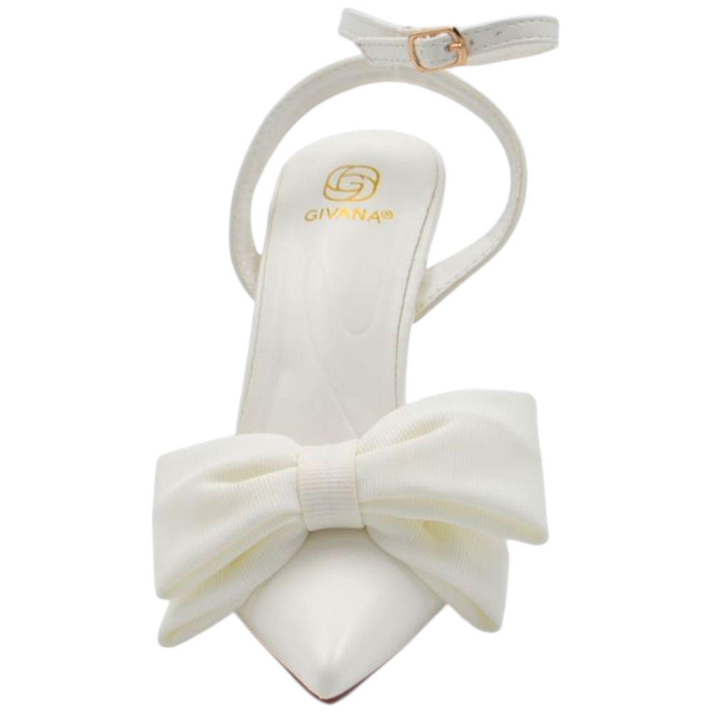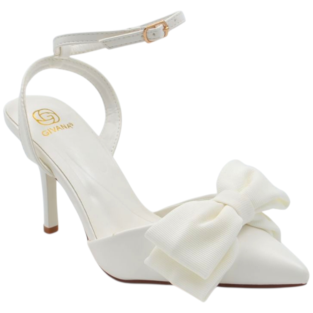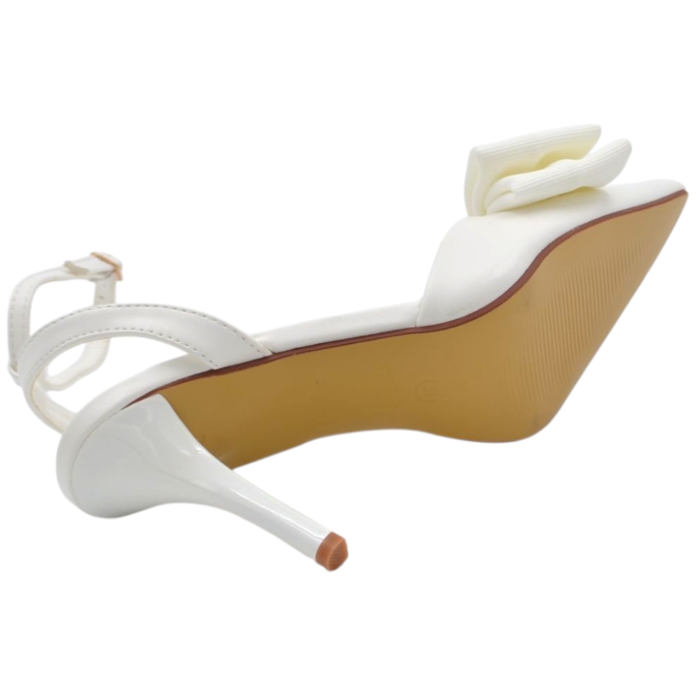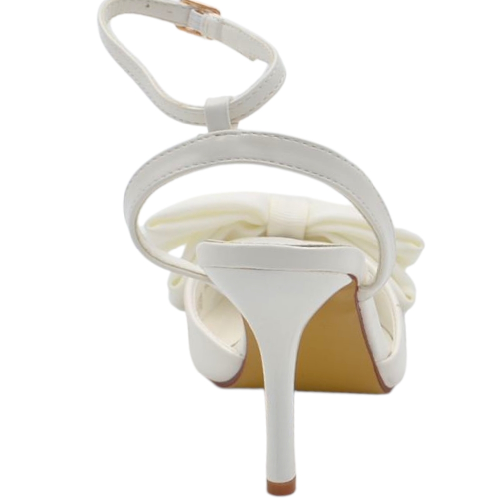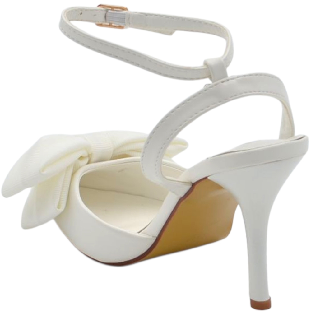 Decollete donna slingback in pelle bianco a punta con fiocco tessuto davanti tacco sottile 10 cm